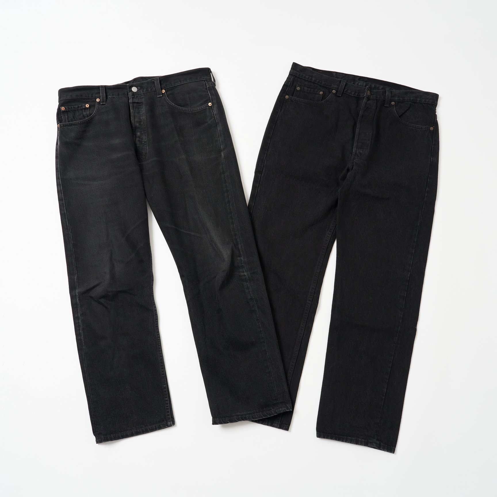 話がややこしくなって申し訳ないですが、今回紹介するのは通称「後染め」のアイテムです。「先染め」の良さももちろんありますが、「後染め」のほうが綺麗に色落ちしやすいというのが僕の持論です。百聞は一見にしかず。「後染め」の色落ちを見てみましょう。どちらも1990年代の「後染め」で、右側はほとんど着用していない状態、左側は真っ黒の状態から僕が着用して色落ちさせたものです。特別なことは何もせず、普通に着て普通に洗濯しただけですが、ヴィンテージならではの墨黒の良いアジが生まれていると思いませんか?