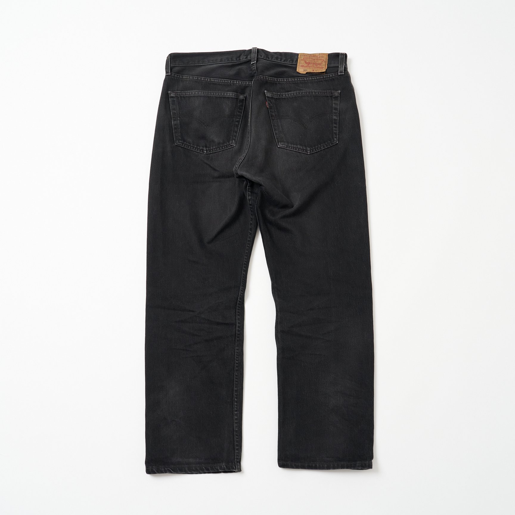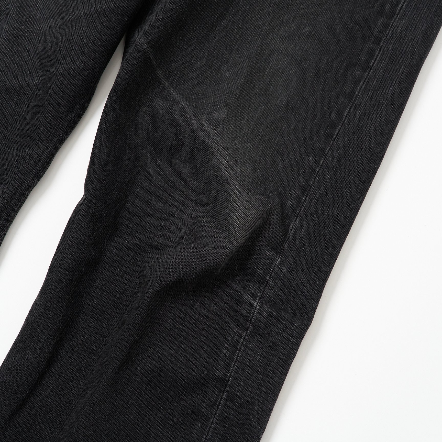 1980?90年代のリーバイスのブラックデニムは、ヴィンテージならではの雰囲気がある色落ちをする個体が多いのですが、その理由は染料にあります。この頃のブラックデニムには、今では環境への配慮などの理由で使われなくなってしまった「サルファブラック(硫化染料)」と呼ばれる黒色染料が用いられていたので、現行のアイテムとは違う色落ちをするんです。また、ブラックデニムはメリハリのある色落ちがしづらいと言われていますが、きちんと糊付けをして洗わずに穿き続けていれば、ブラックデニムでもヒゲやハチノスを出すことは可能です。