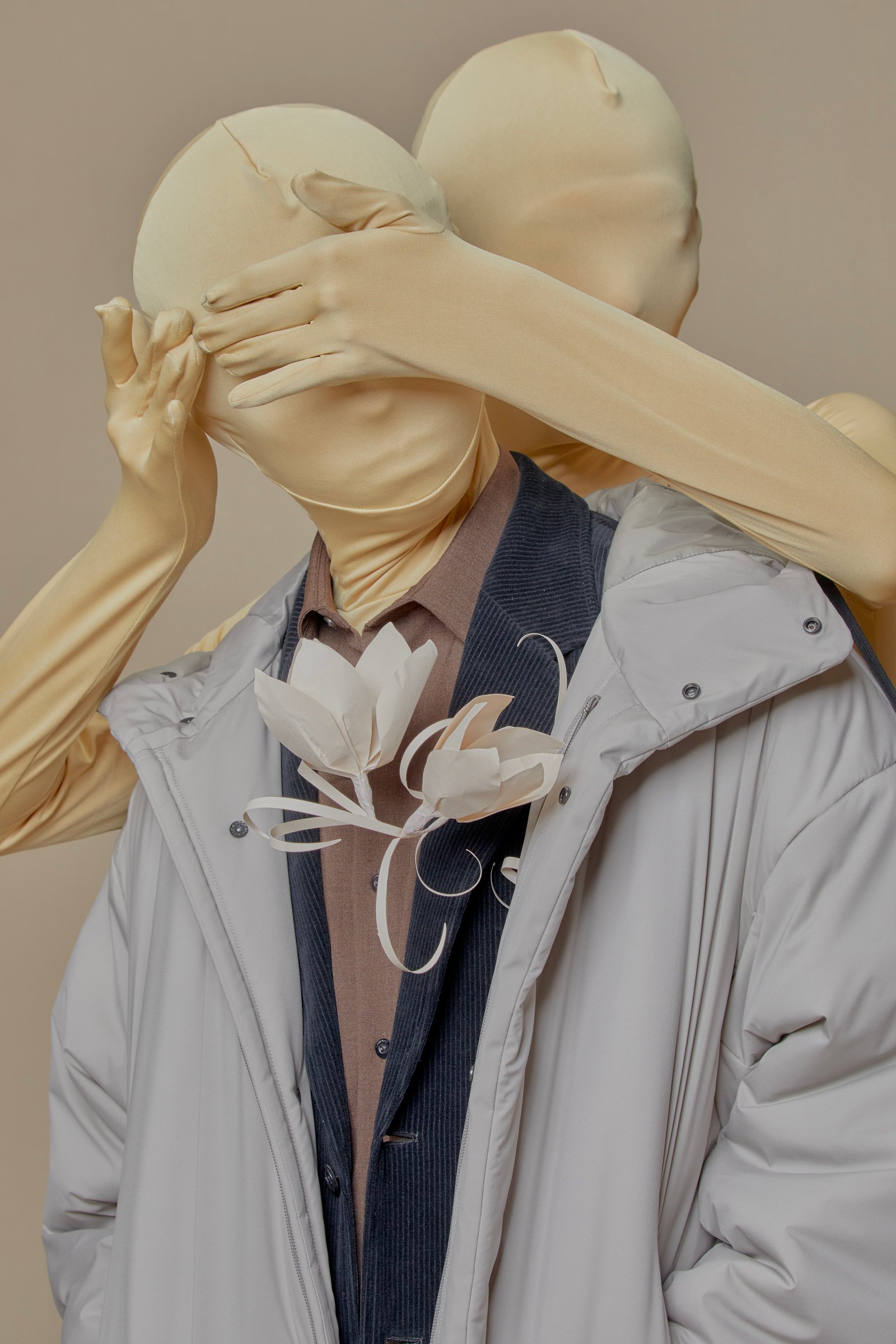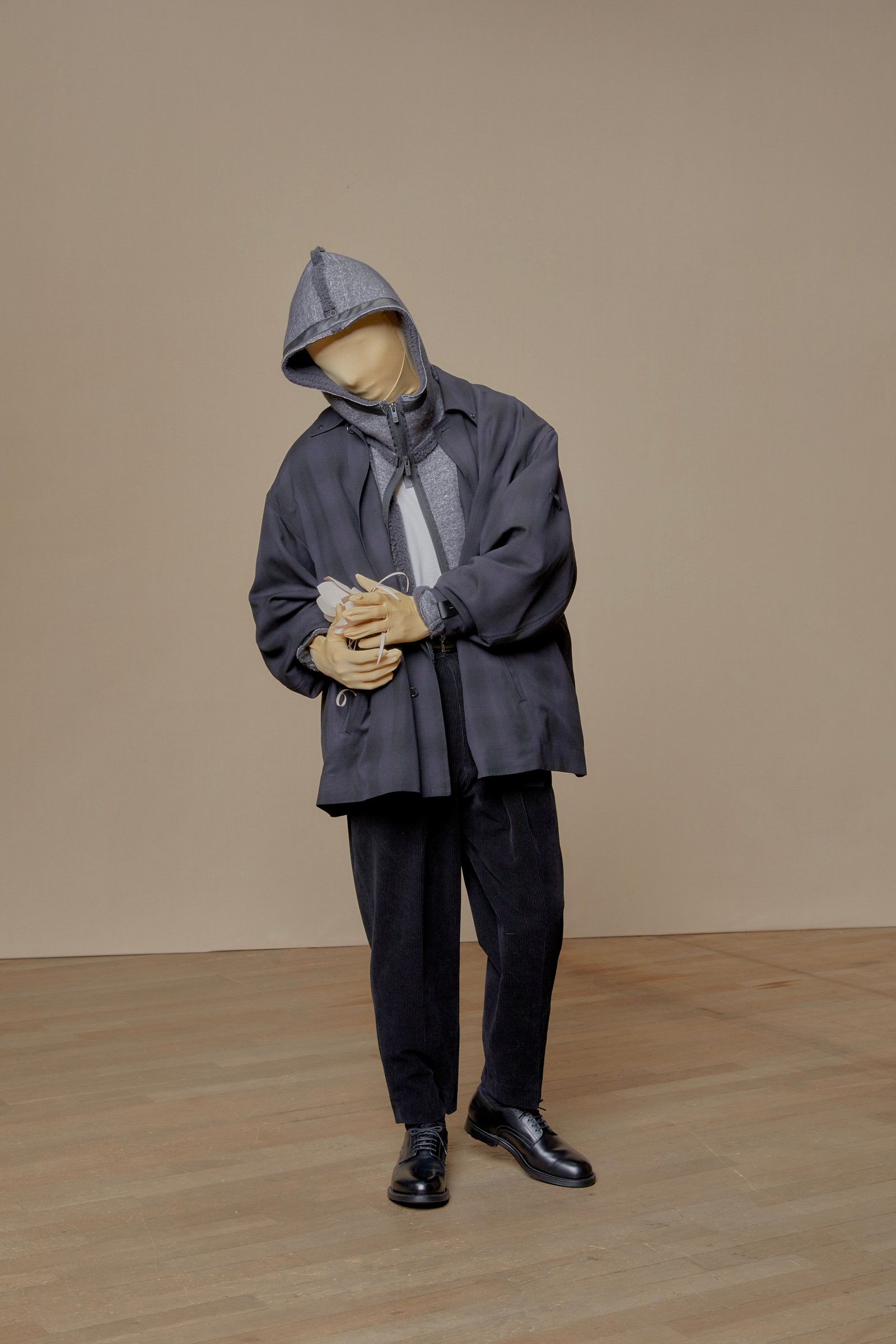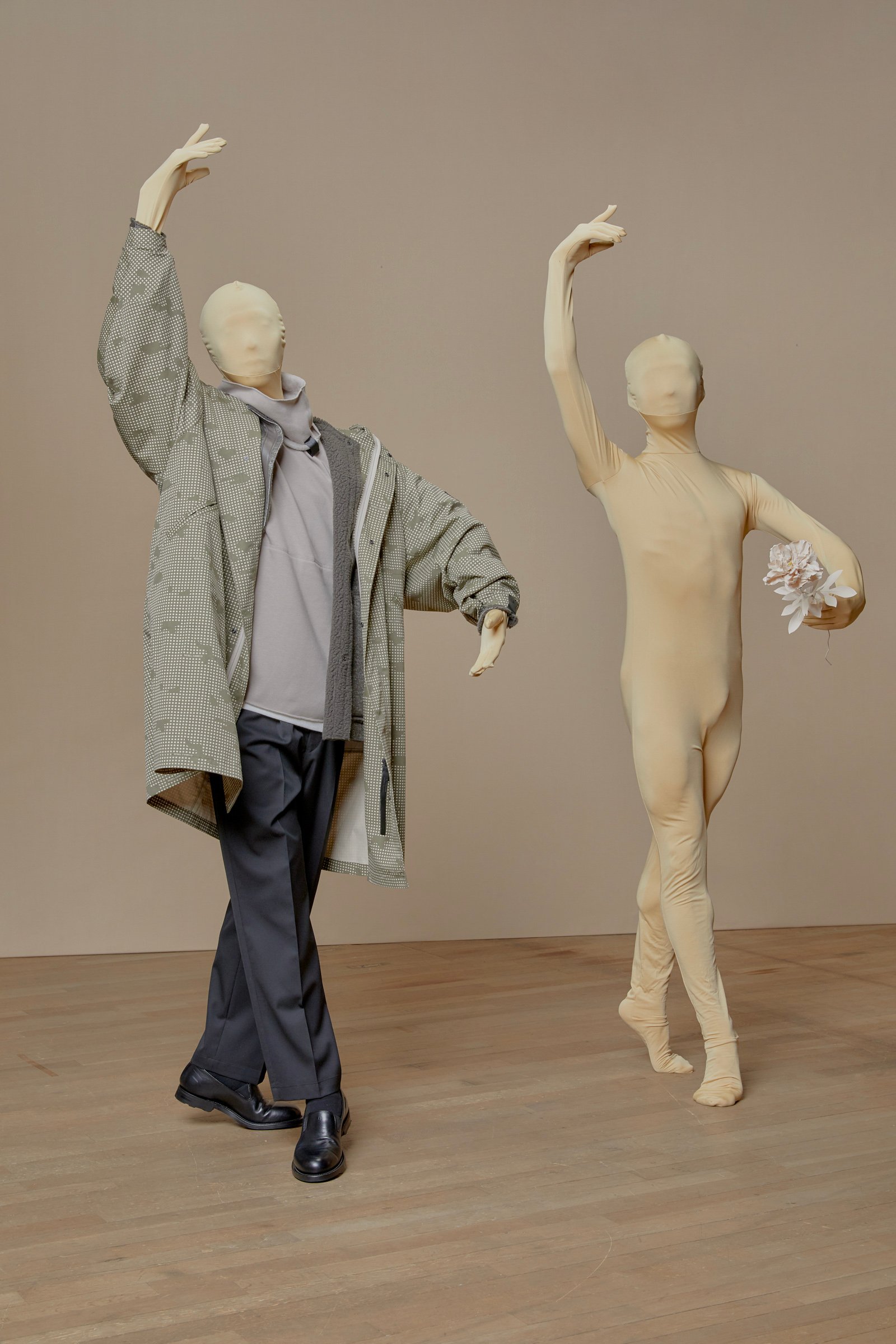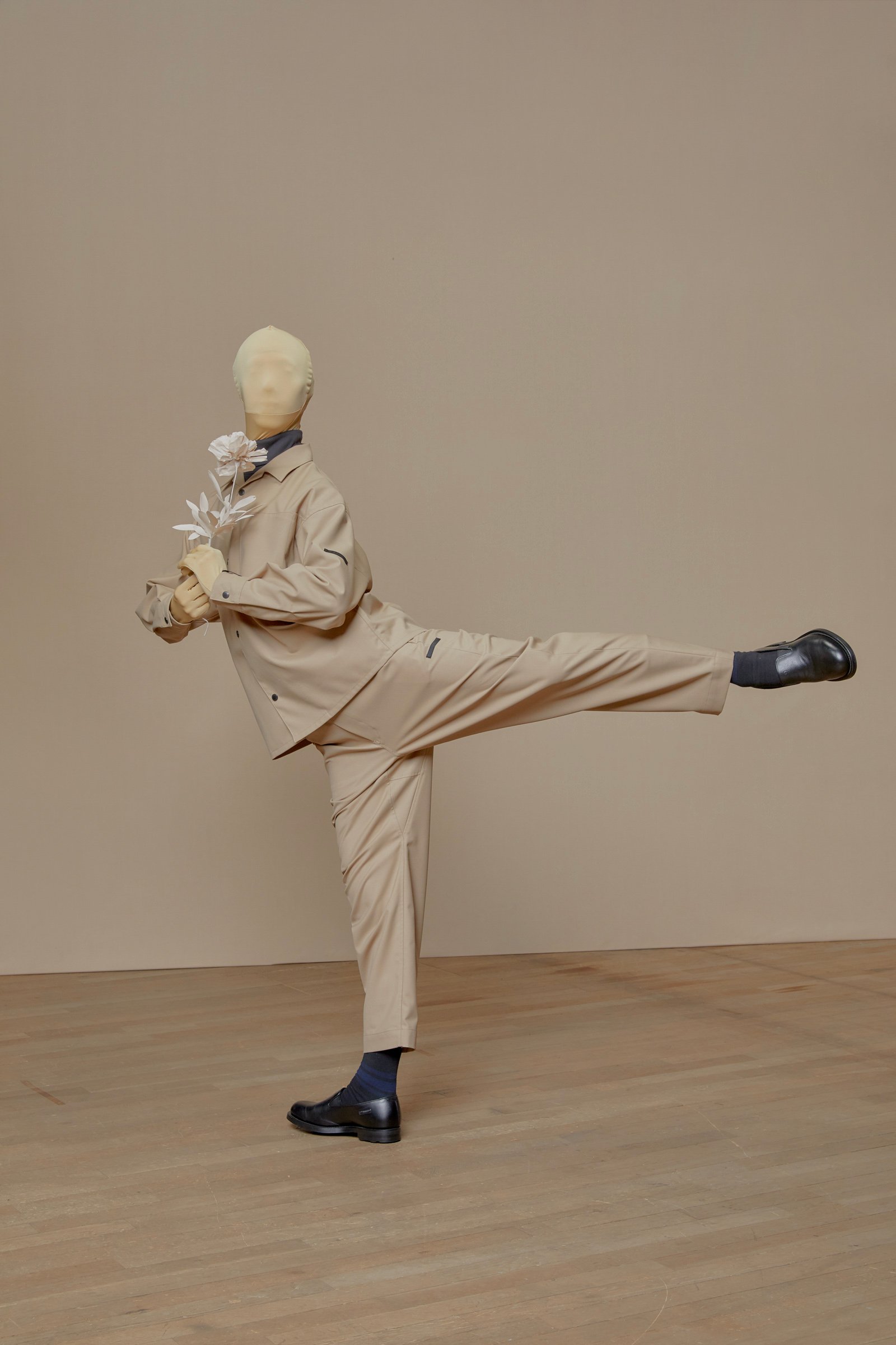 服を主役に据えるため、パフォーマーは透明人間のイメージで、ナチュラルカラーの全身タイツ姿。2脚の椅子のみが置かれたシンプルな舞台を一台の固定カメラで俯瞰的に映し、パッと瞬時に変わるシーンの転換は、昔なつかしい箱型の紙芝居から着想を得たという。コレクションの特徴でもあるレイヤードとも重なる。
