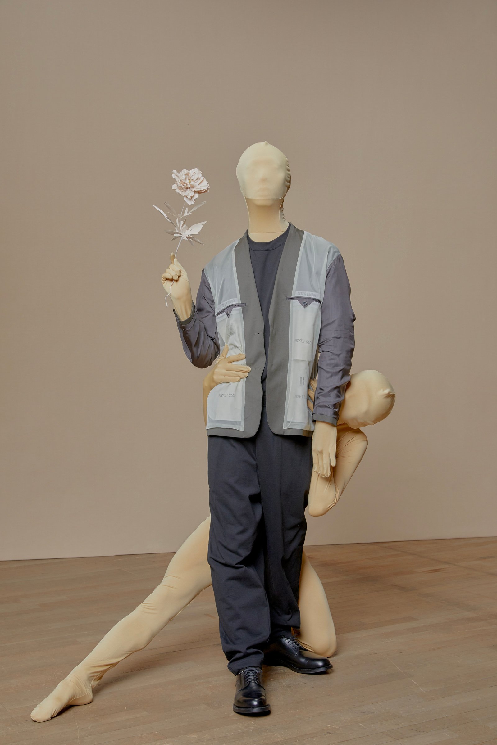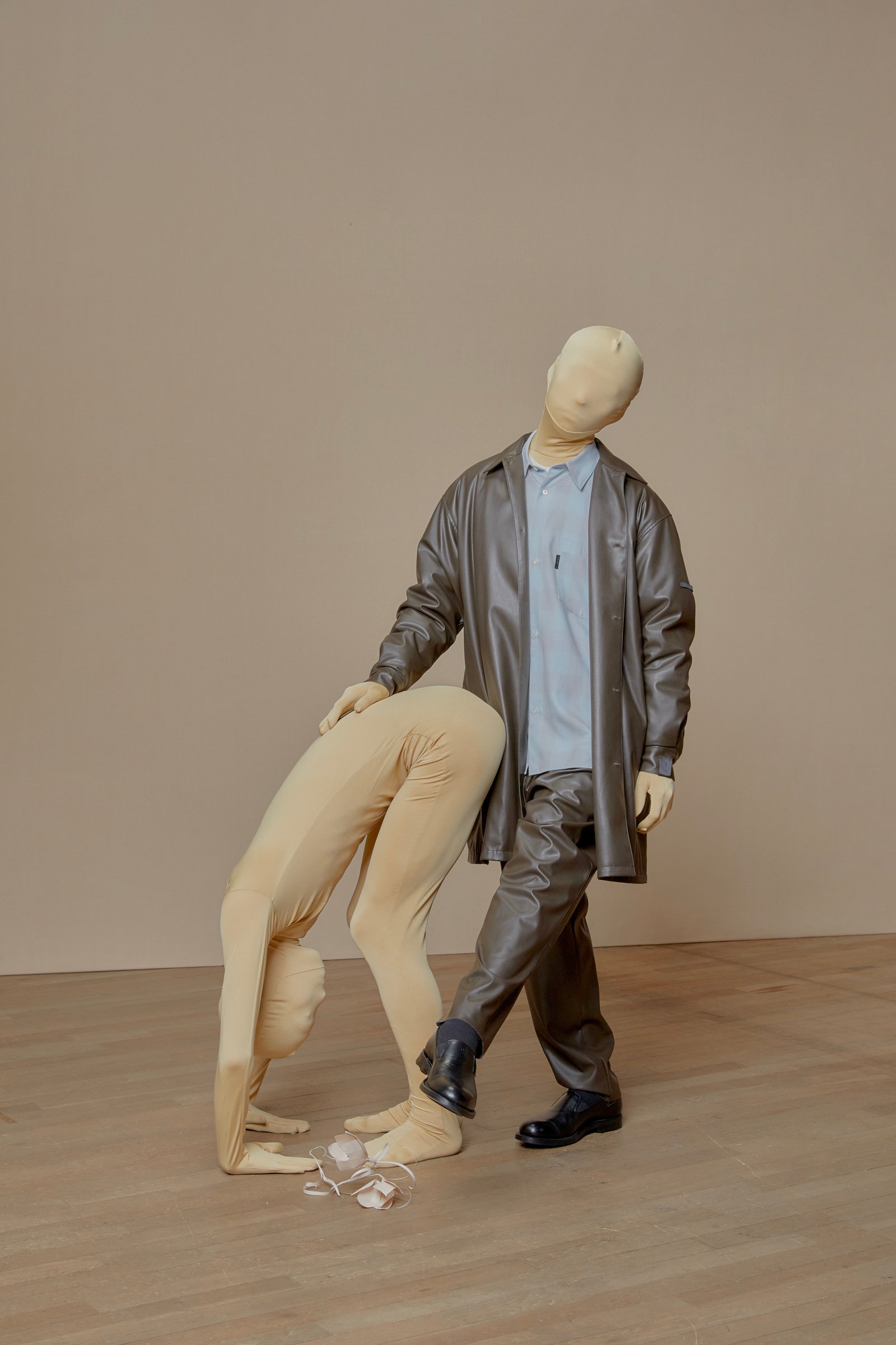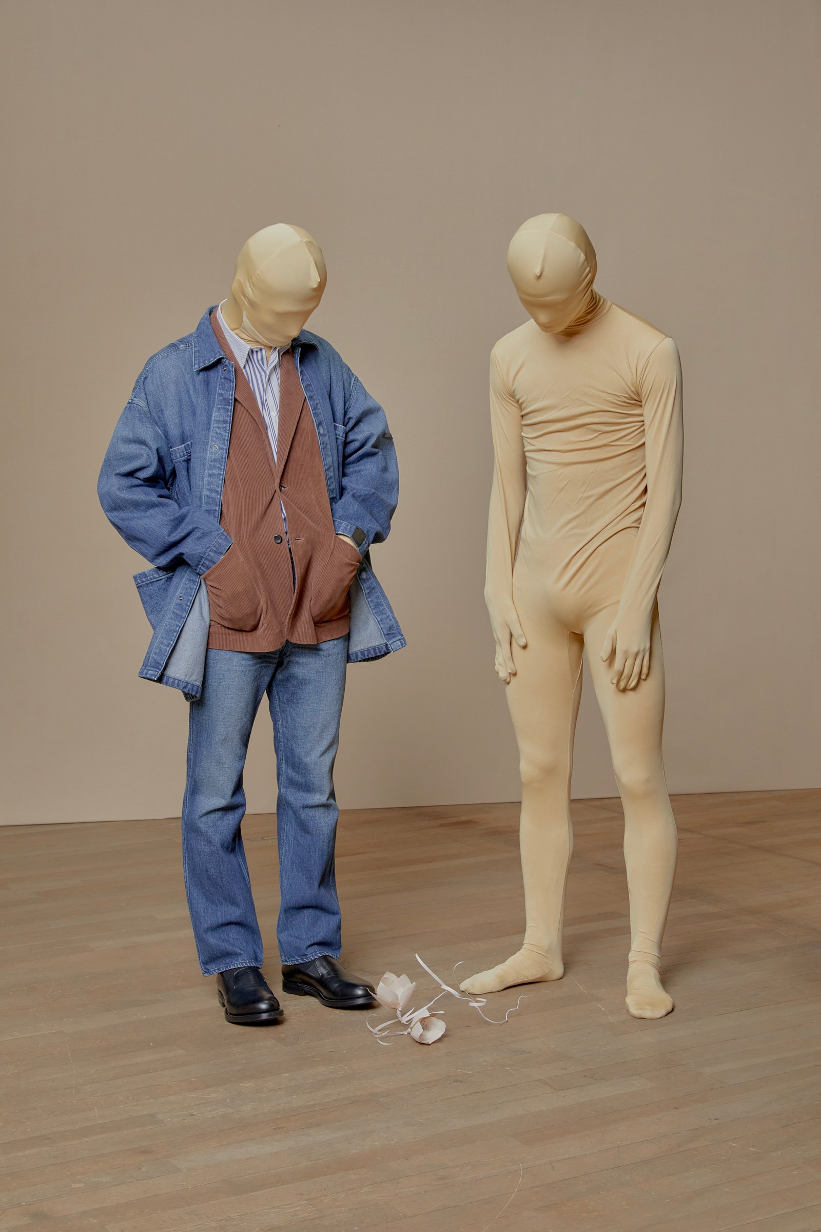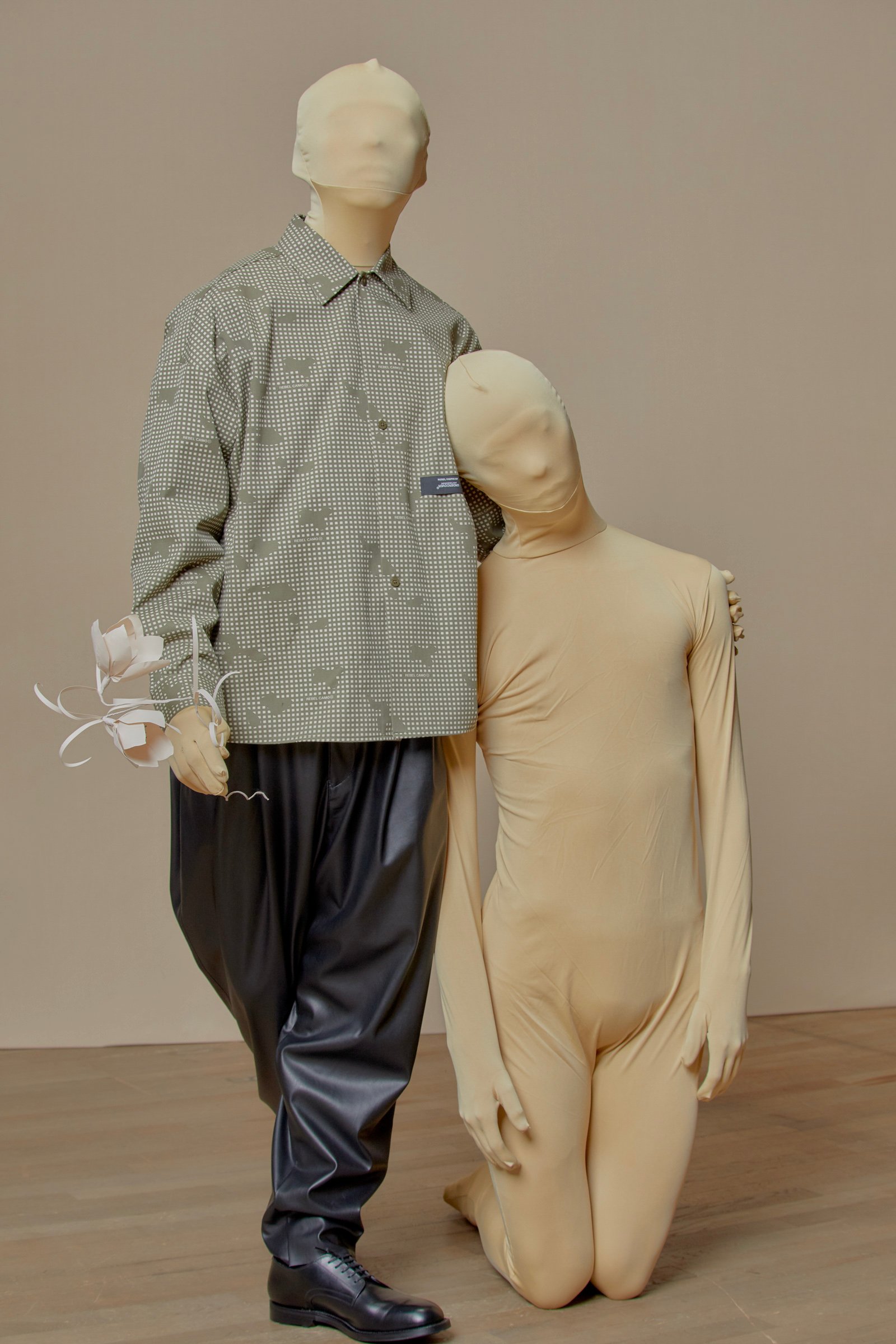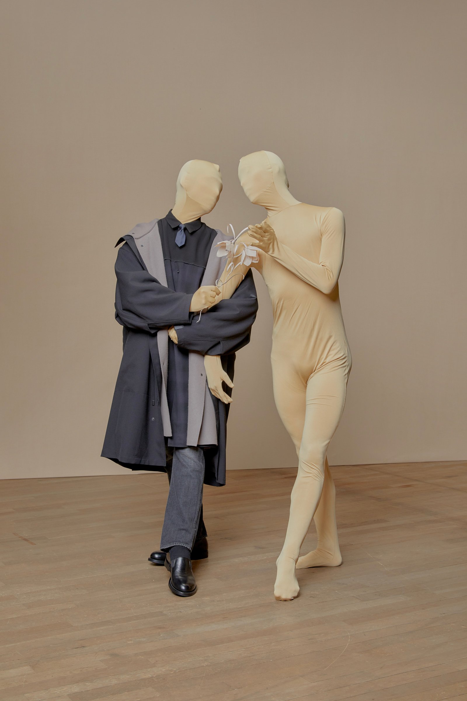 服を主役に据えるため、パフォーマーは透明人間のイメージで、ナチュラルカラーの全身タイツ姿。2脚の椅子のみが置かれたシンプルな舞台を一台の固定カメラで俯瞰的に映し、パッと瞬時に変わるシーンの転換は、昔なつかしい箱型の紙芝居から着想を得たという。コレクションの特徴でもあるレイヤードとも重なる。