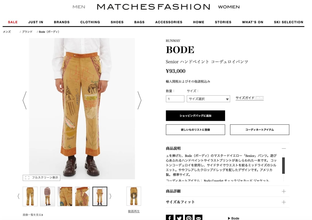 対談VTRではニューヨーク拠点の気鋭ブランド「ボーディ(BODE)」のパンツを着用。遊び心あふれるハンドペイントのデザインは全て一点物です。