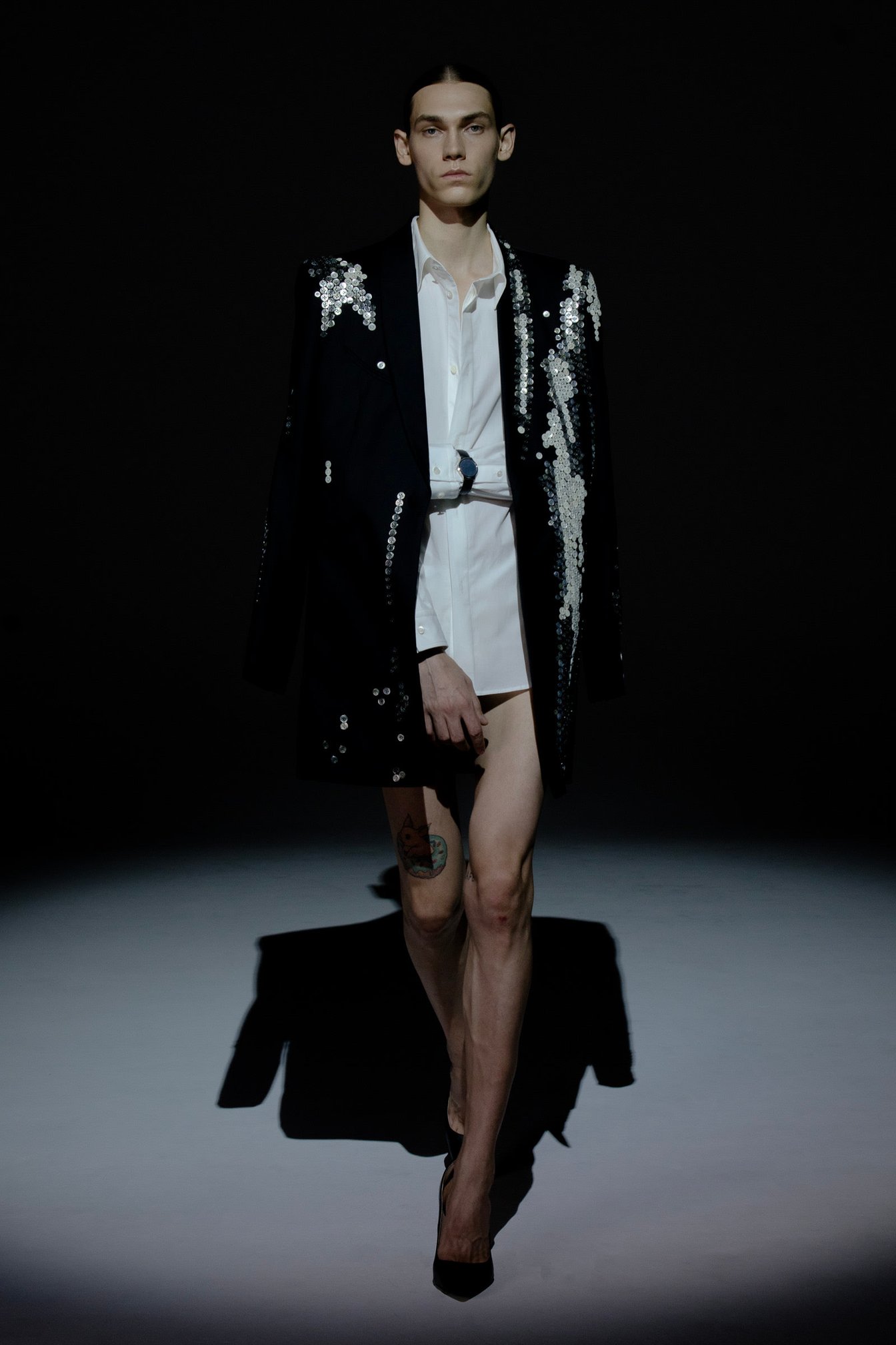 ドラムの松浦匡希さんは「ヨウジヤマモト オム(Yohji Yamamoto HOMME)」2020-21年秋冬コレクションのシャツを着用。このほか、ギターの小笹大輔さんは「サンローラン(SAINT LAURENT)」、ベース&サックスの楢崎誠さんはサンローランと「The Letters(レターズ)」の衣装でした。
