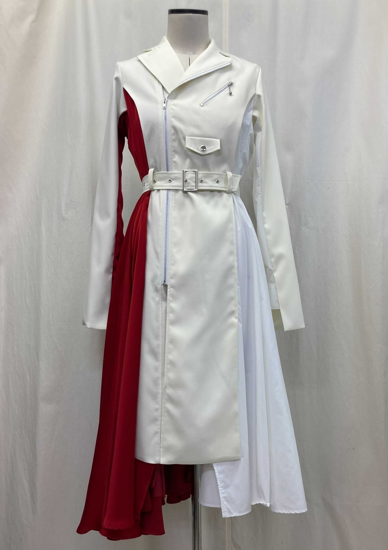 櫻坂46の衣装は「ケイスケヨシダ(KEISUKEYOSHIDA)」の吉田圭佑さんがデザインを担当。テーラードの要素を取り入れたダブルのロングライダースとシャツドレスをドッキングしたデザインに仕上げました。メンバーの強くて凛としたイメージを漂わせつつ、より洗練されたシャープでエレガンスな質感を意識してデザインしたそう。「Nobody's fault」でスカートを大胆に振る踊りが映えるよう、右見頃の赤いスカート部分にたっぷりと分量を取りました。ディレクションとスタイリングはスタイリストのremi takenouchiさん、右袖口のモチーフは刺繍デザイナーのdaisuke tanakaさんがそれぞれ担当。