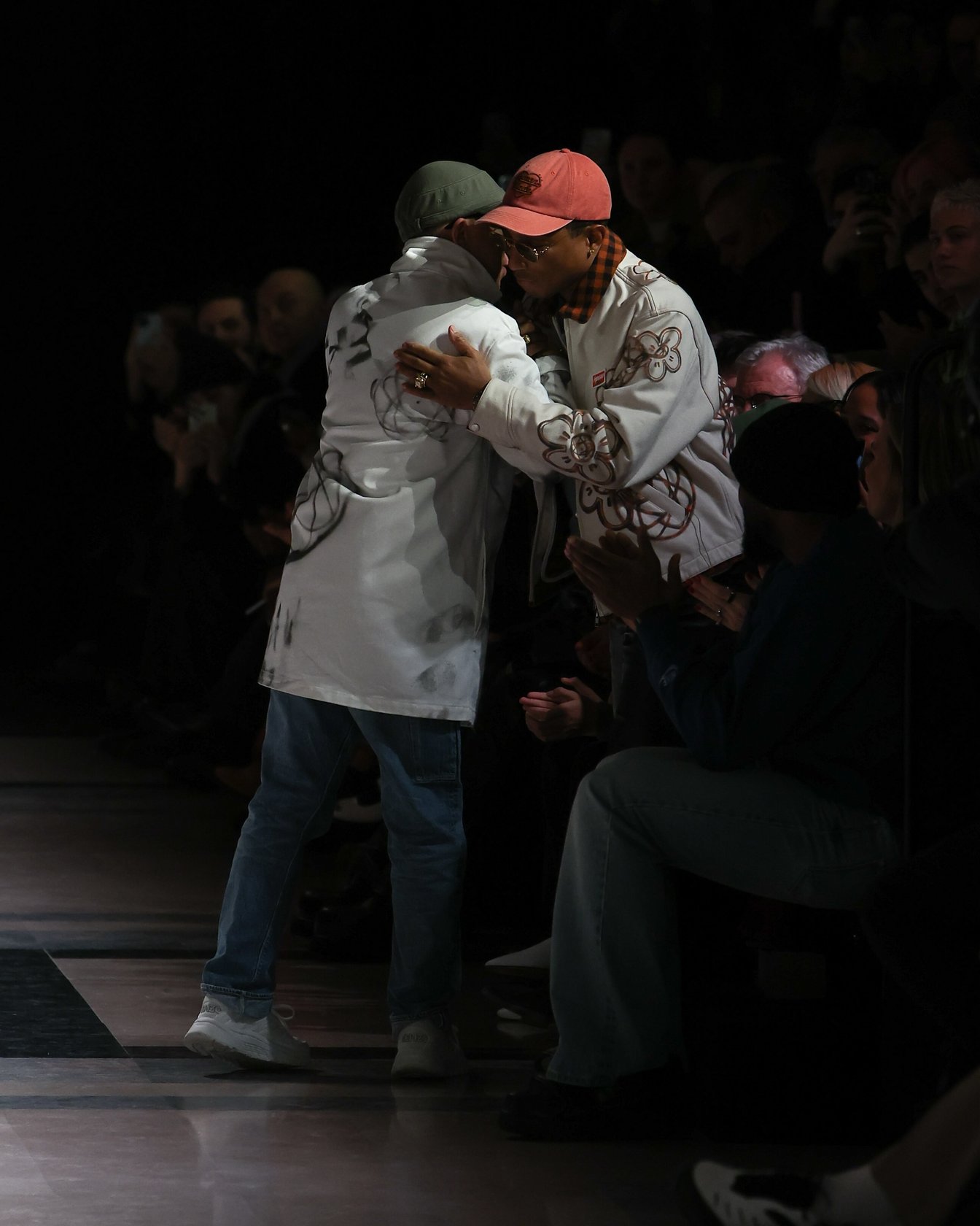 KENZOのフィナーレで客席のファレル?ウィリアムスと握手を交わしたNIGO