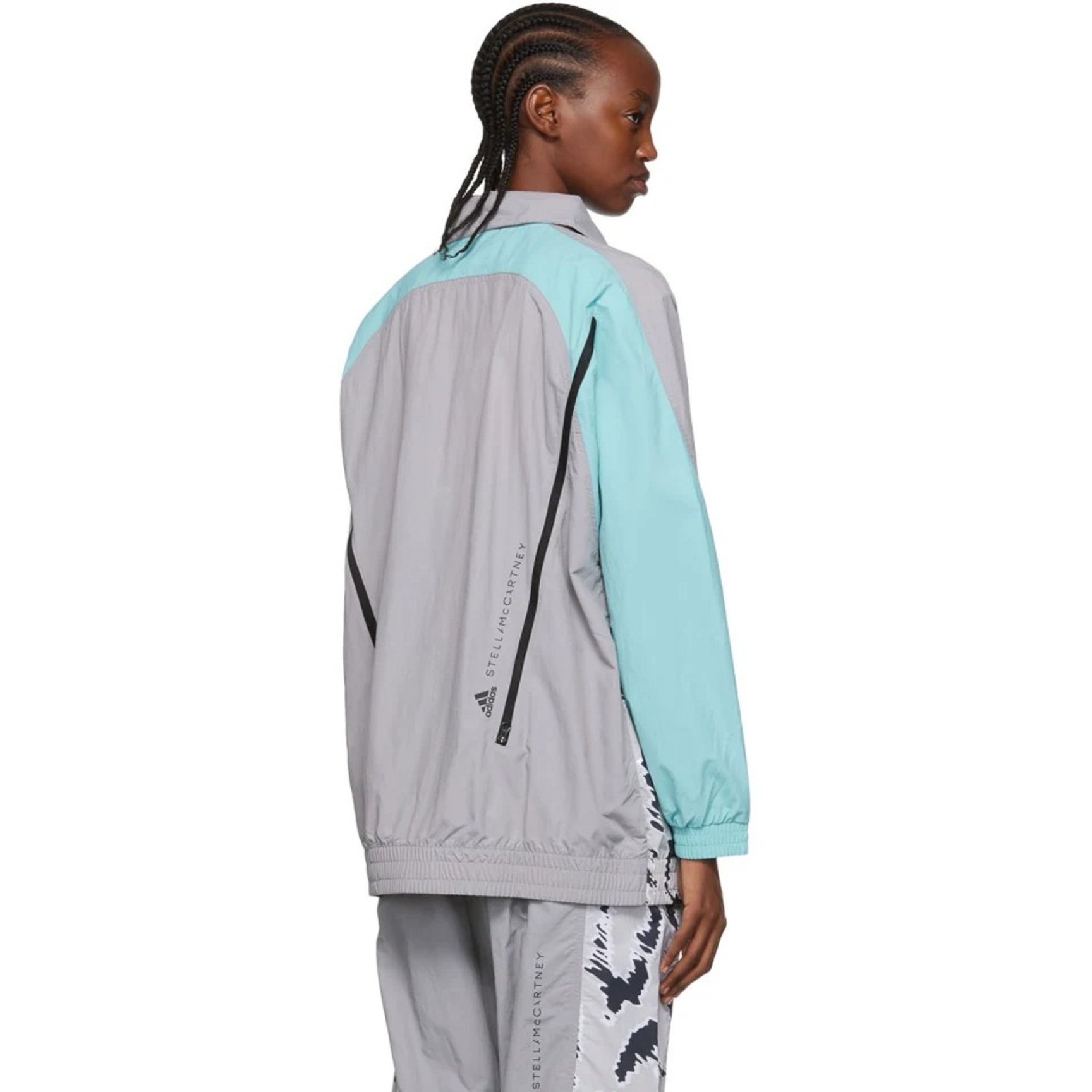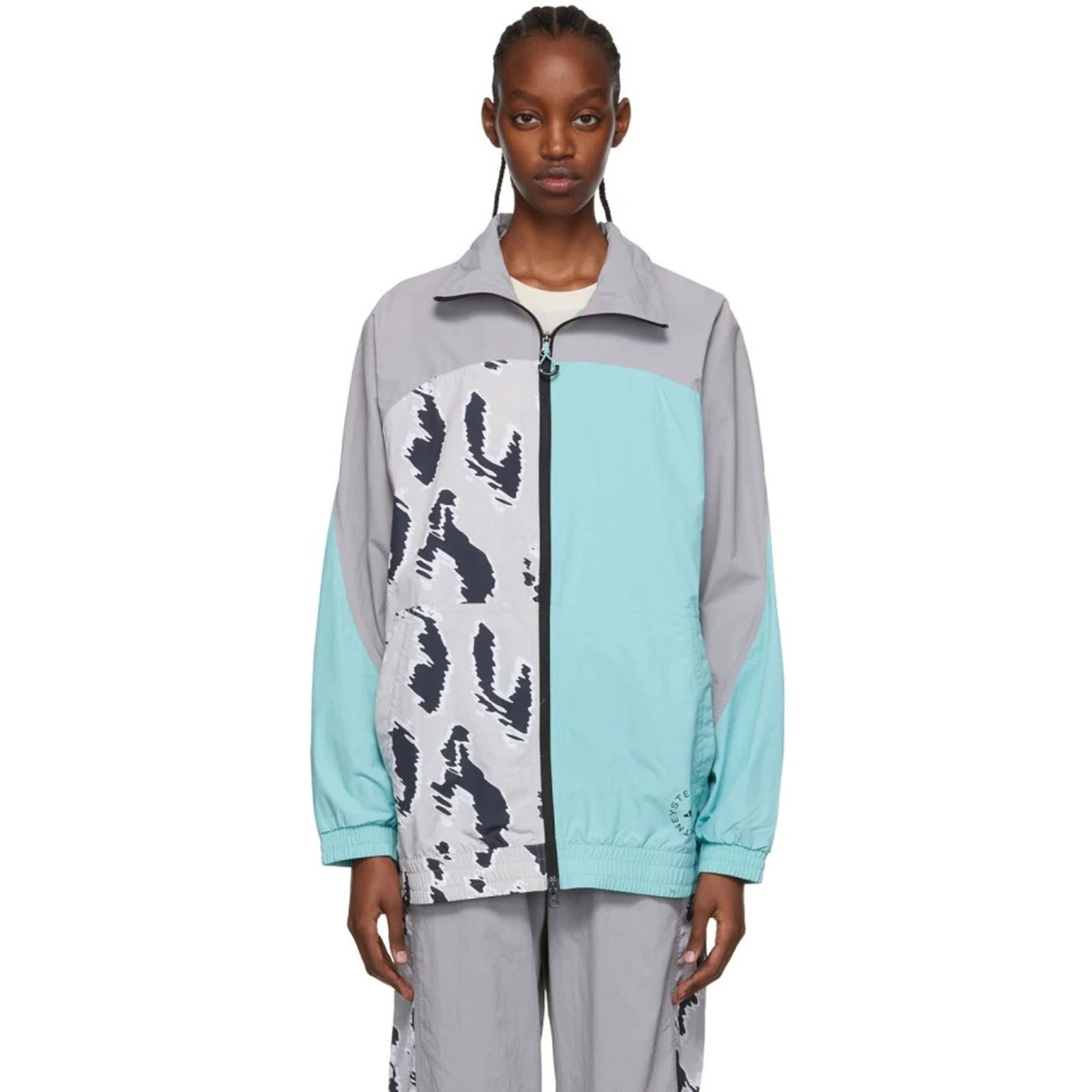 アニマルプリントとカラーのパネルを組み合わせた「アディダス バイ ステラ?マッカートニー(adidas by Stella McCartney)」のジャケット。ゆったりしたフィット感で丈は長め、落ち着いたカラーリングなのでジェンダーレスで着用できます。