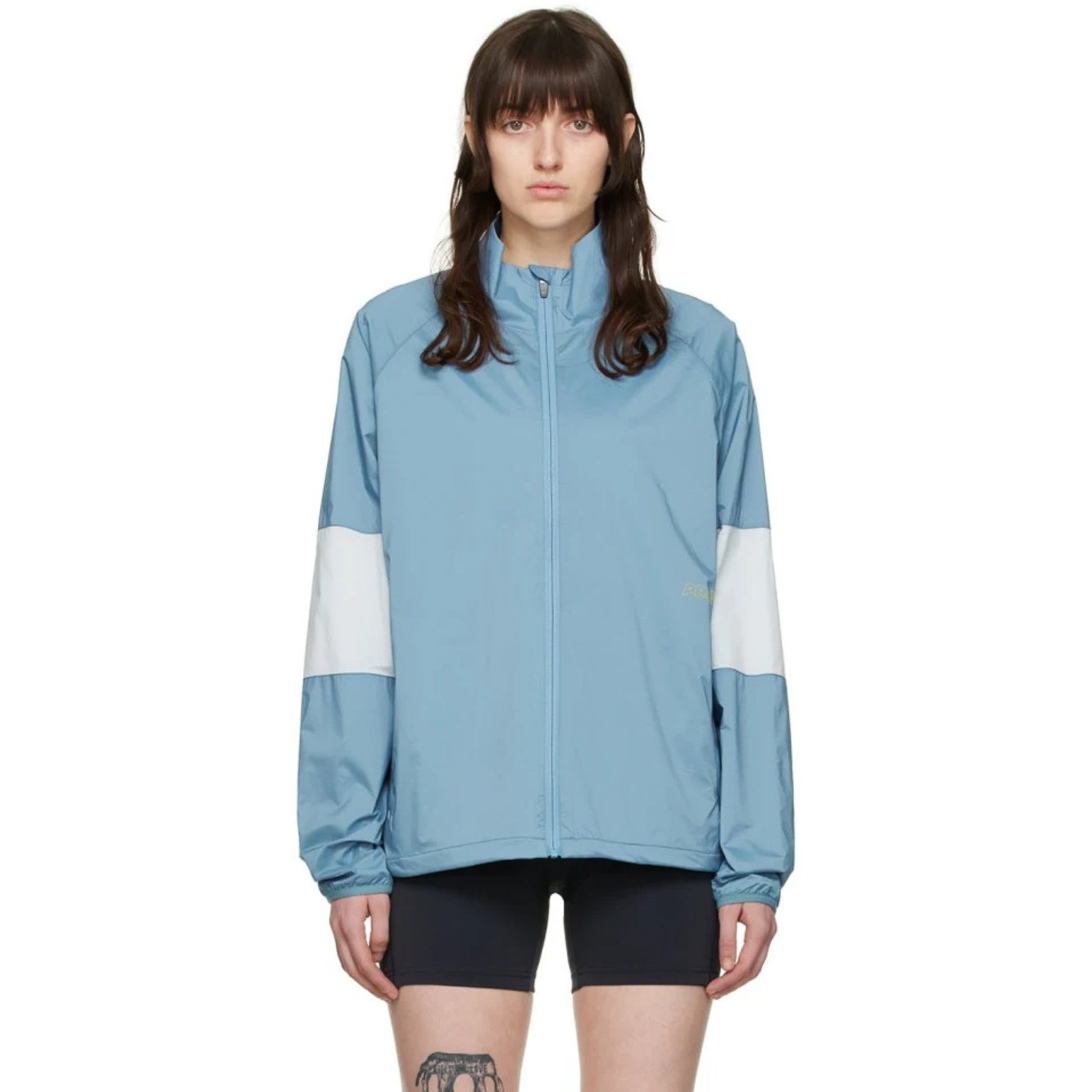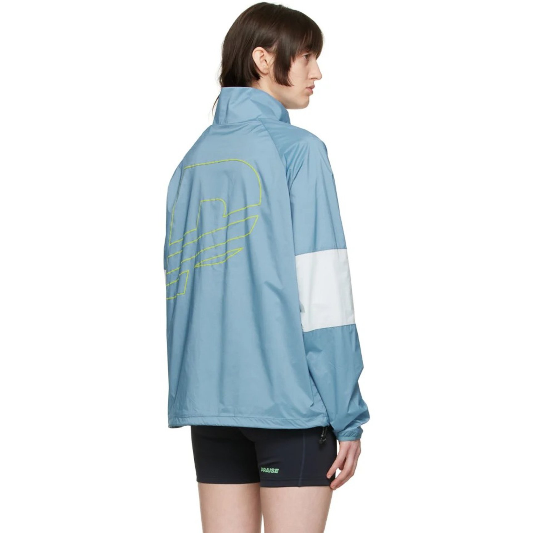 ブルー×ホワイトのパネル仕立てのジャケットは「プライズ エンドゥランス(PRAISE ENDURANCE)」のもの。ストレッチ性のあるポリエステルタフタ生地を採用し、裏地は全てメッシュ素材。アクティブに動く日こそ着たい一着です。