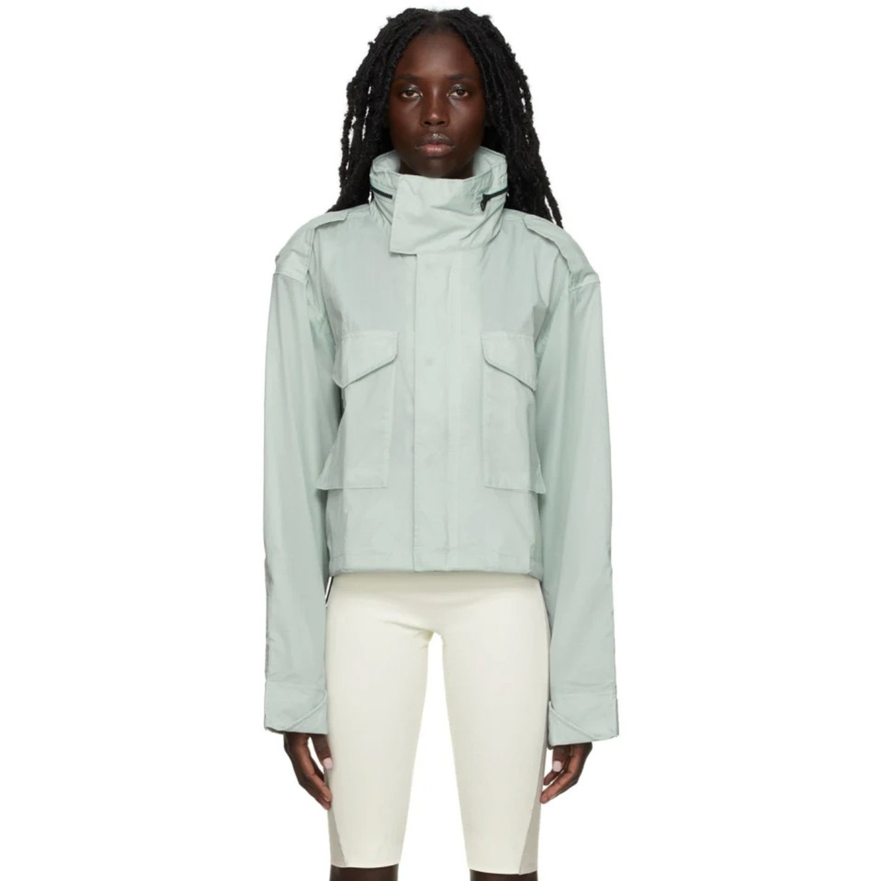 「リーボック × ヴィクトリア?ベッカム」から、スタイルアップが叶うクロップド丈のジャケットをセレクト。必要最低限の荷物が入る大きなフラップポケットがついているのが嬉しいポイント。淡いグリーンカラーが装いをクリーンに仕立ててくれます。