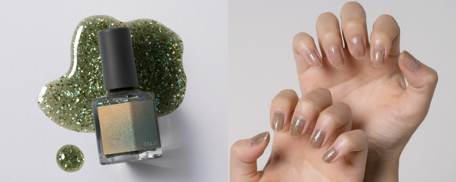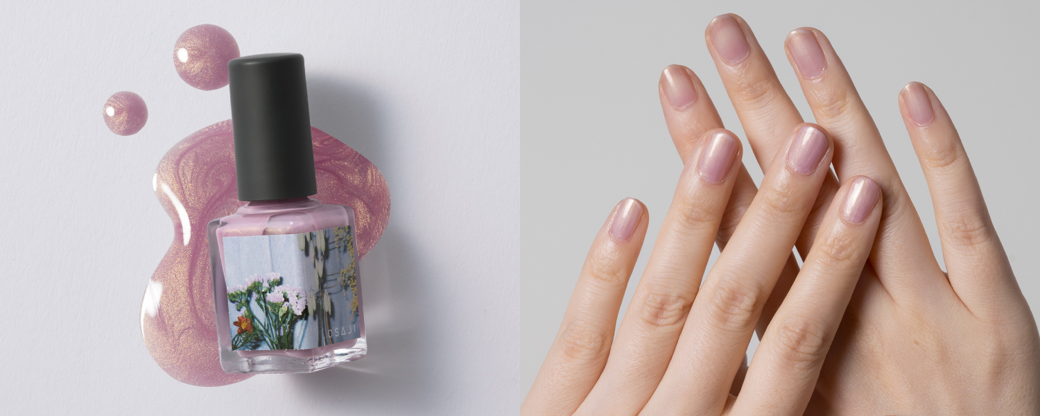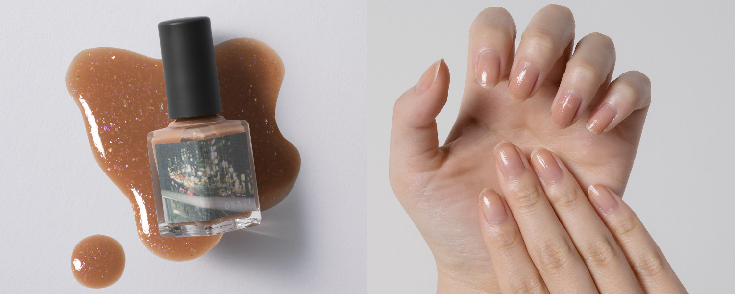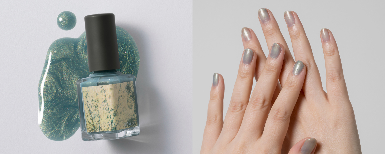 日常をほんの少し特別なものへとアップデートしてくれる、草野氏の写真作品からインスピレーションを得たネイルカラー。ホログラムをぎっしり詰め込んだくすみ系のディープグリーン「503 Toushi〈透視〉」、オパールのような知性ある輝きのグレイッシュブルー「504 Tsunaidate〈繋いだ手〉」、ピンクのクラッシュパールを効かせた透明感のあるベージュ「505 Arukidasou〈歩き出そう〉」、黄土色のニュアンスを含んだノンパールのミルクチョコブラウン「506 Kiokuchigai〈記憶違い〉」、ホワイトゴールドがこっくりと広がるライラックピンク「507 Yumeyume〈ゆめゆめ〉」、青いホログラムを忍ばせたシャンパンゴールドのラメカラー「508 Kagamigoshi〈鏡越し〉」の6色をラインナップします。