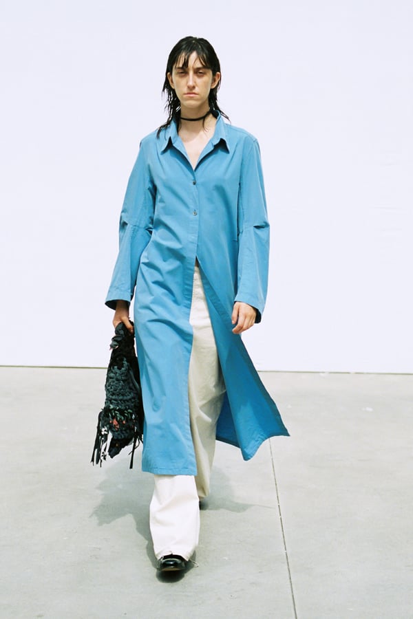 こちらもドットボタンなどのディテールが、無骨なワークウェアを物語るが、ご覧の通り、全身の佇まいは涼しげで軽やか。軽量な生地の特性を活かして、インナーのトップスでは裾にドローストリングを採用してブラウジングを起こしたほか、羽織っているコートはワイドな形とロング丈のコンビネーションで、優雅なローブを想起させる。