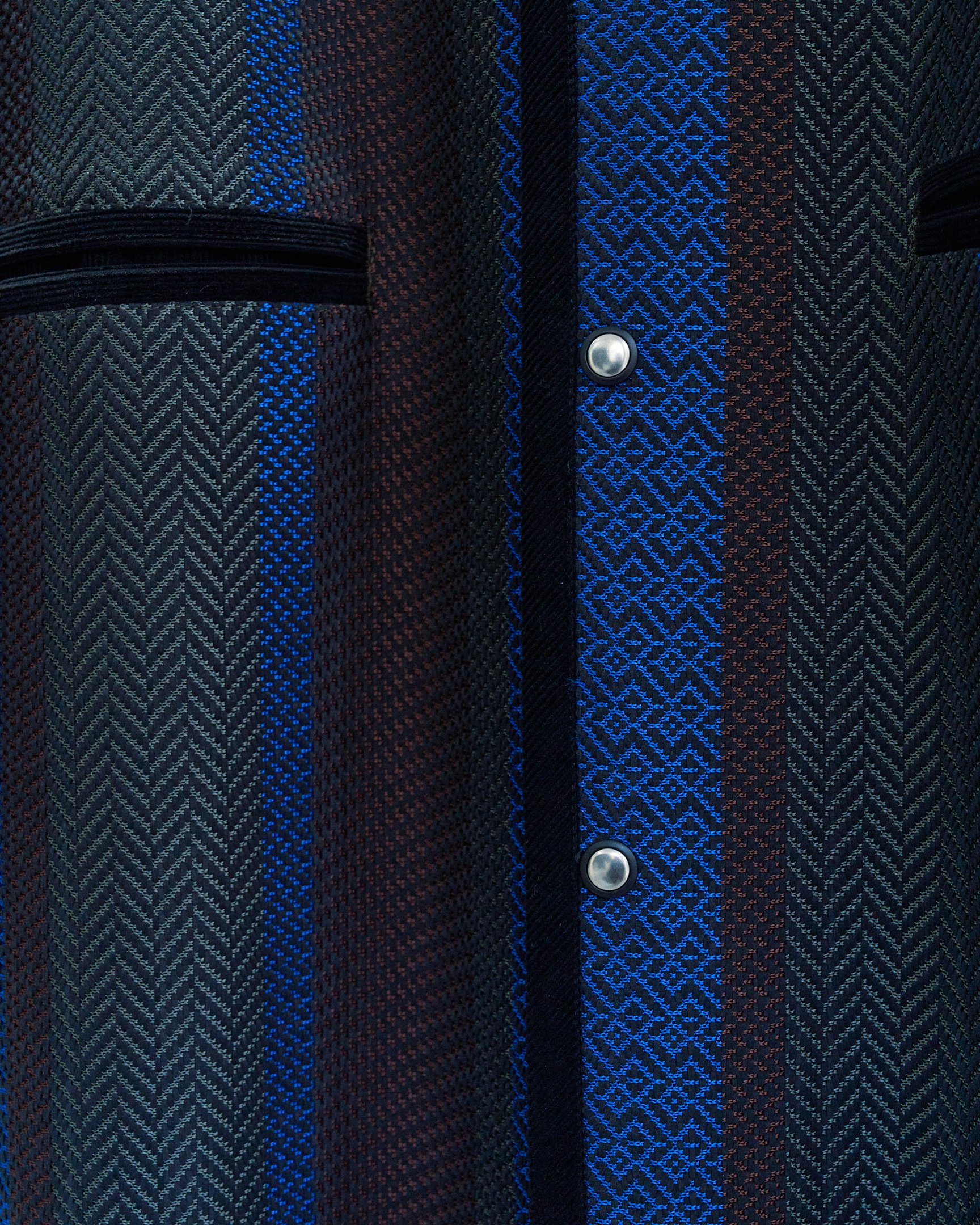 一番スペシャルなのは、ニットをポリエステルで編んでいく中で、一目編むごとにウルトラスエードを裂いてテープ状にしたものを織り込んだ素材です。編みながら織っているという特殊構造で、ウルトラスエードがジャカードのように表現されています。これは、「ゲリ」というネパールの伝統工芸品からインスピレーションを受けました。