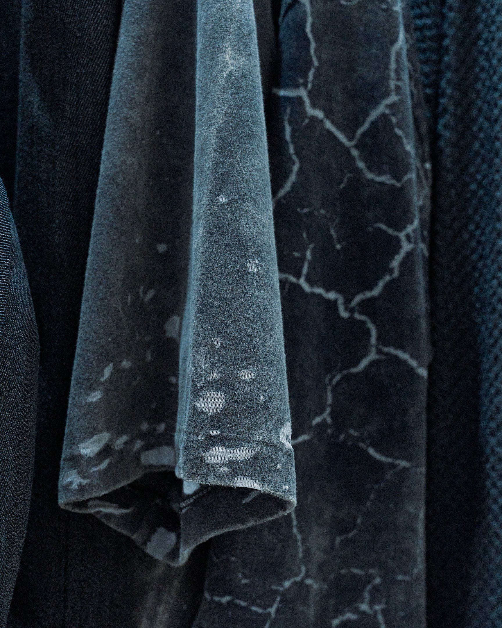 夏が長くなってきたので、プリントTシャツではない、大人が着たくなる涼しい服を作りたかったという実用的な理由です。プロダクトとして機能を可視化し、涼しさが直感的に伝わるようにしたかった。だからこの服は、コレクションのストーリー、ディストピア的発想、実用的理由の3重構造で成り立っているんです。