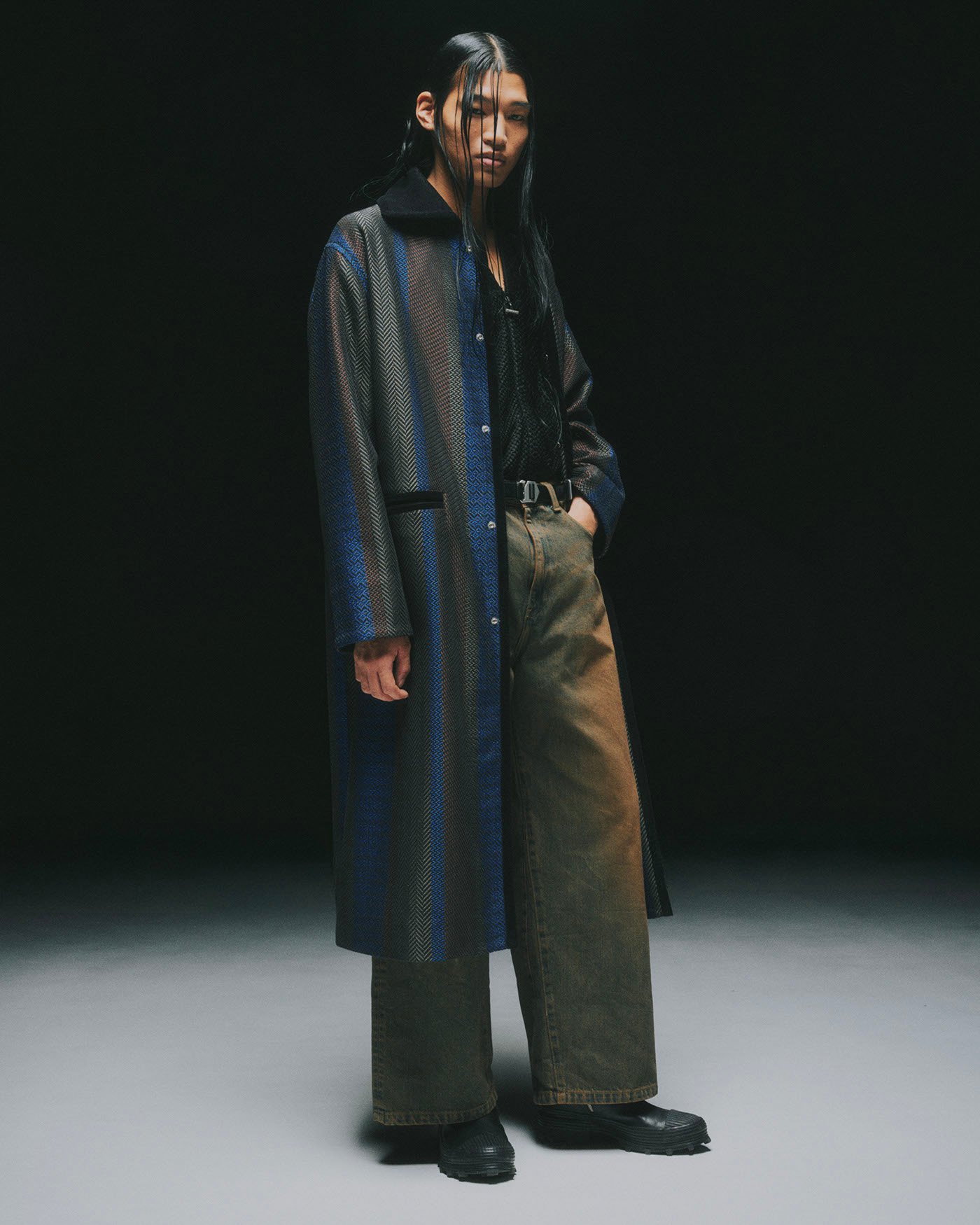 インスピレーションは身近なところ、特に日本人としての体験から得ることが多いです。たとえば「干支は何?」と尋ねたり、七五三や四十九日の法事を行ったり。これらは、ほぼすべての日本人が経験することですよね。イギリスから日本に帰国した際、僕は外国人の視点になっていたので、改めてその習慣を目の当たりにしたら、すごく宗教的に感じられて面白かった。日本人は無宗教のような感覚で暮らしている人が多いですが、実は土着信仰に根ざした伝統が多いと感じました。そして興味を持って掘り下げていったところ、なぜか海を越えてネパールのカトマンズに行き、古代インド仏教に触れることになりました(笑)。日本文化とこれらを融合したものが2025年秋冬コレクションのテーマです。