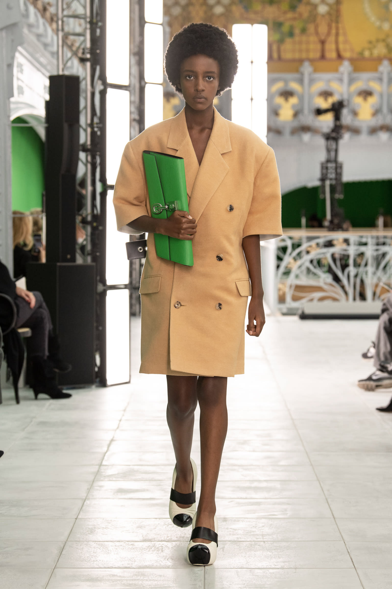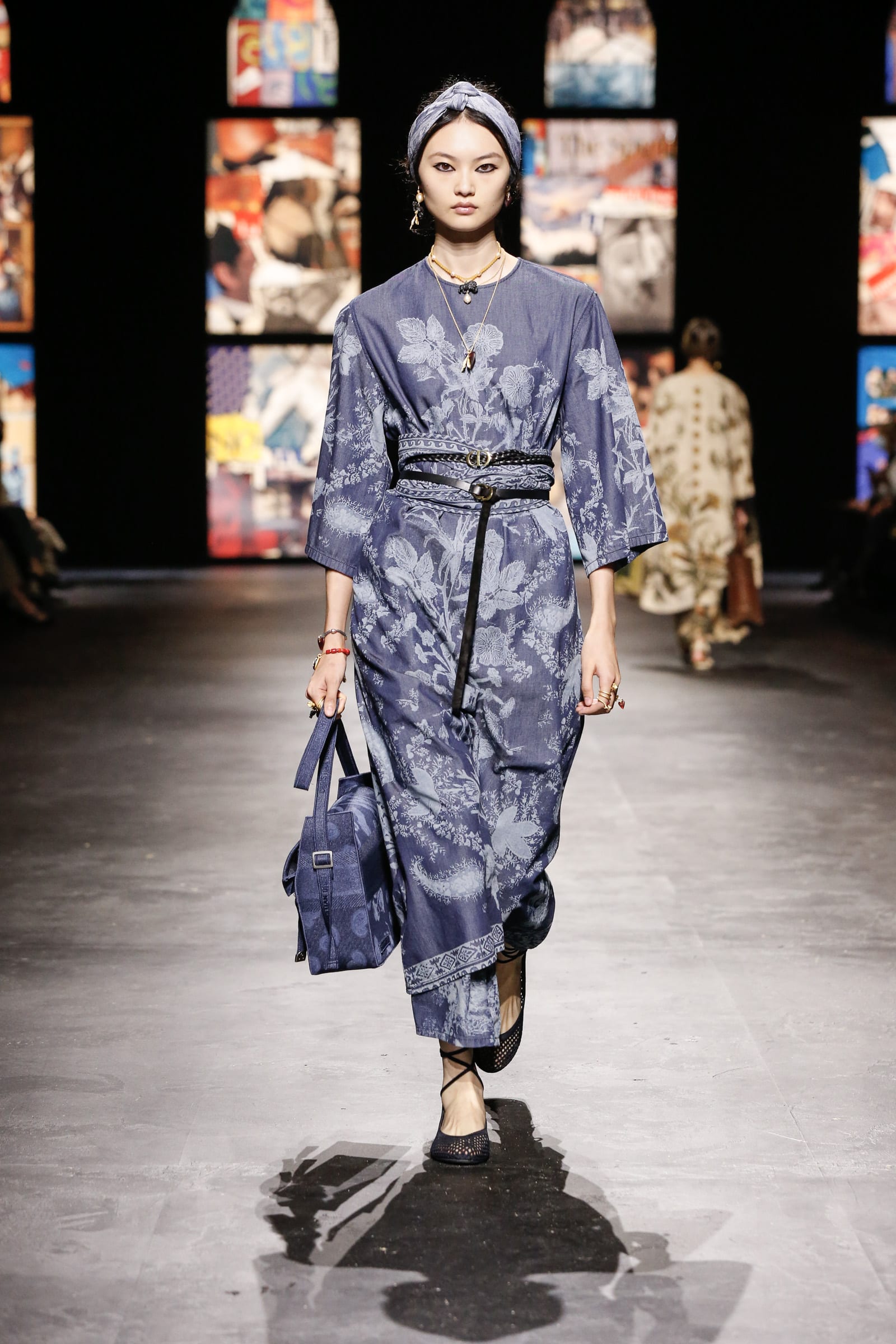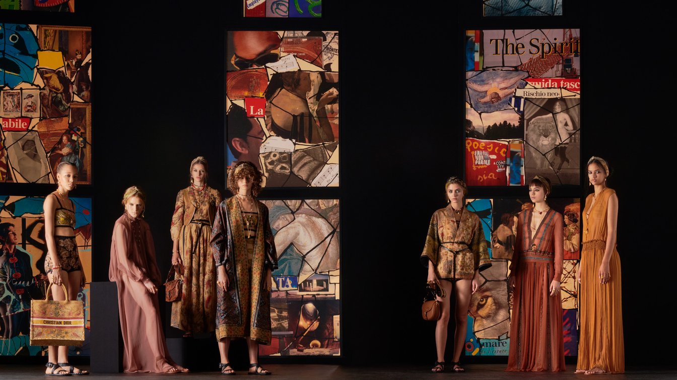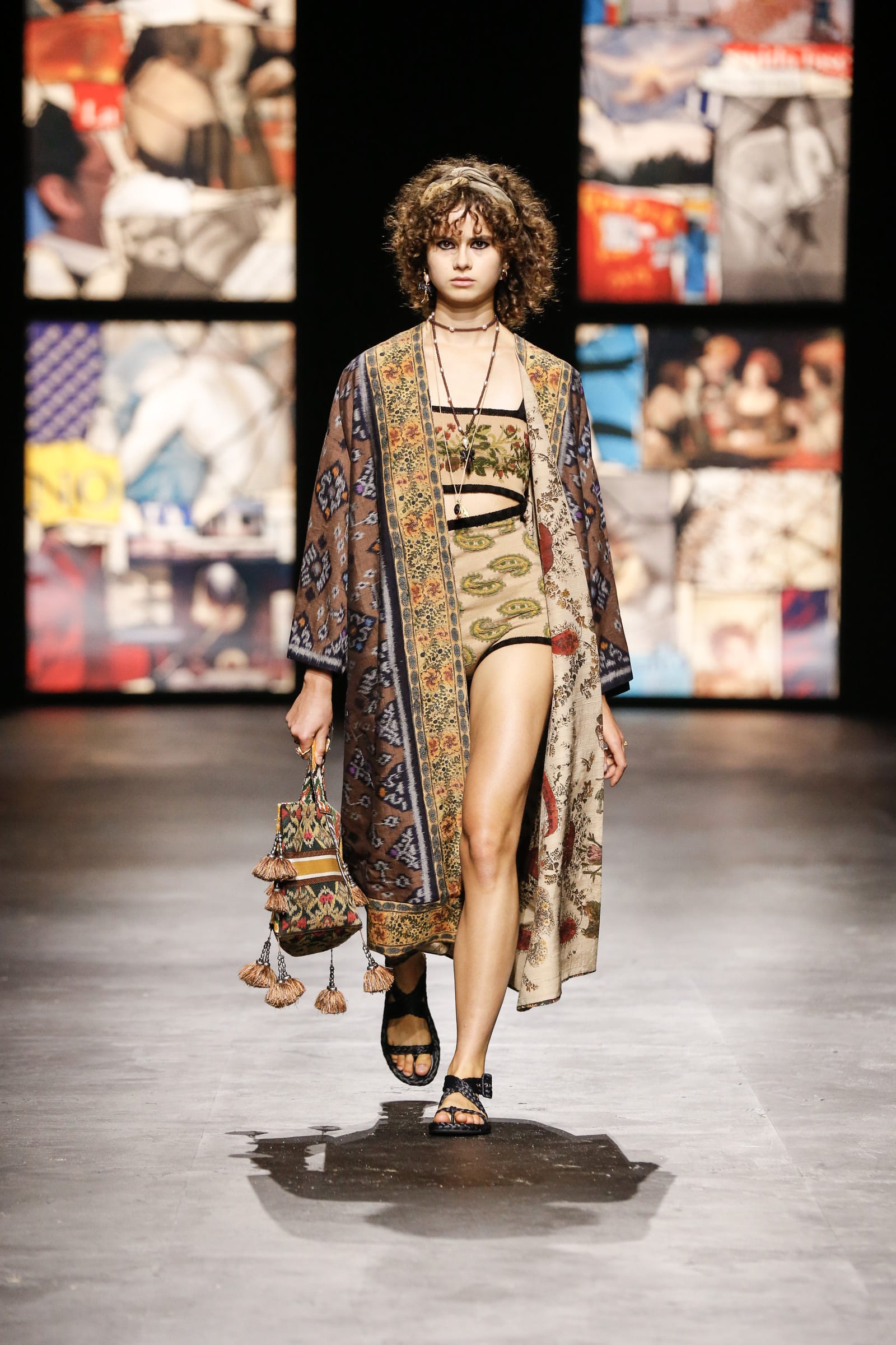 マリア?グラツィアは視覚的な詩の美しさを取り入れるために、ヴァージニア?ウルフやスーザン?ソンタグなど女性作家たちの装いから着想。代表的な「バー」ジャケットは、ディオールが1957年秋冬で日本のためにデザインしたシルエットを再解釈し、羽織のようにゆったりとしたデザインに。心地よく身体を包み込むようなソフトなファブリックが目立ち、インドネシアのバリ島に起源を持つイカット織りや、ビーズのエンブロイダリーなど手仕事の温かみをまとった。