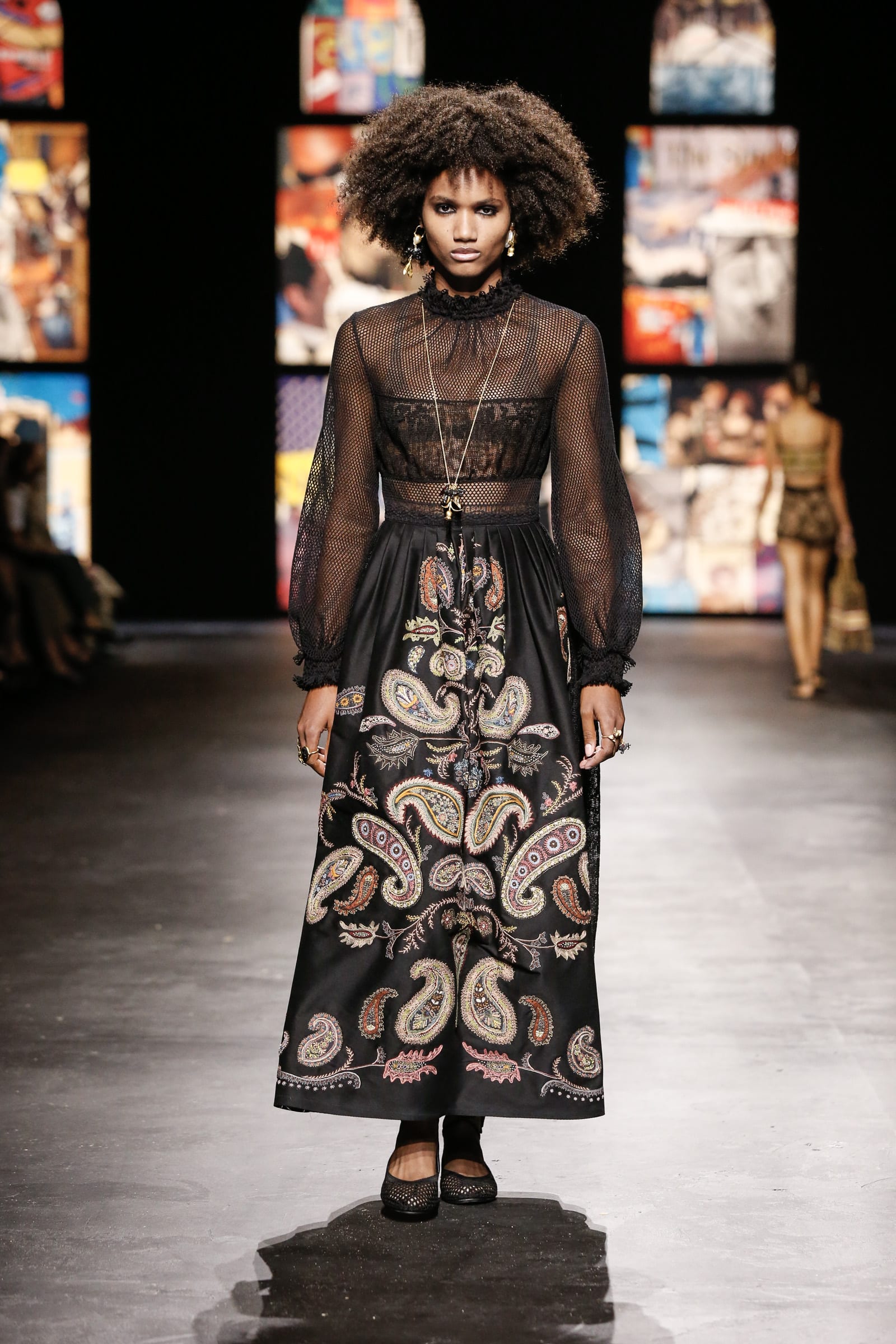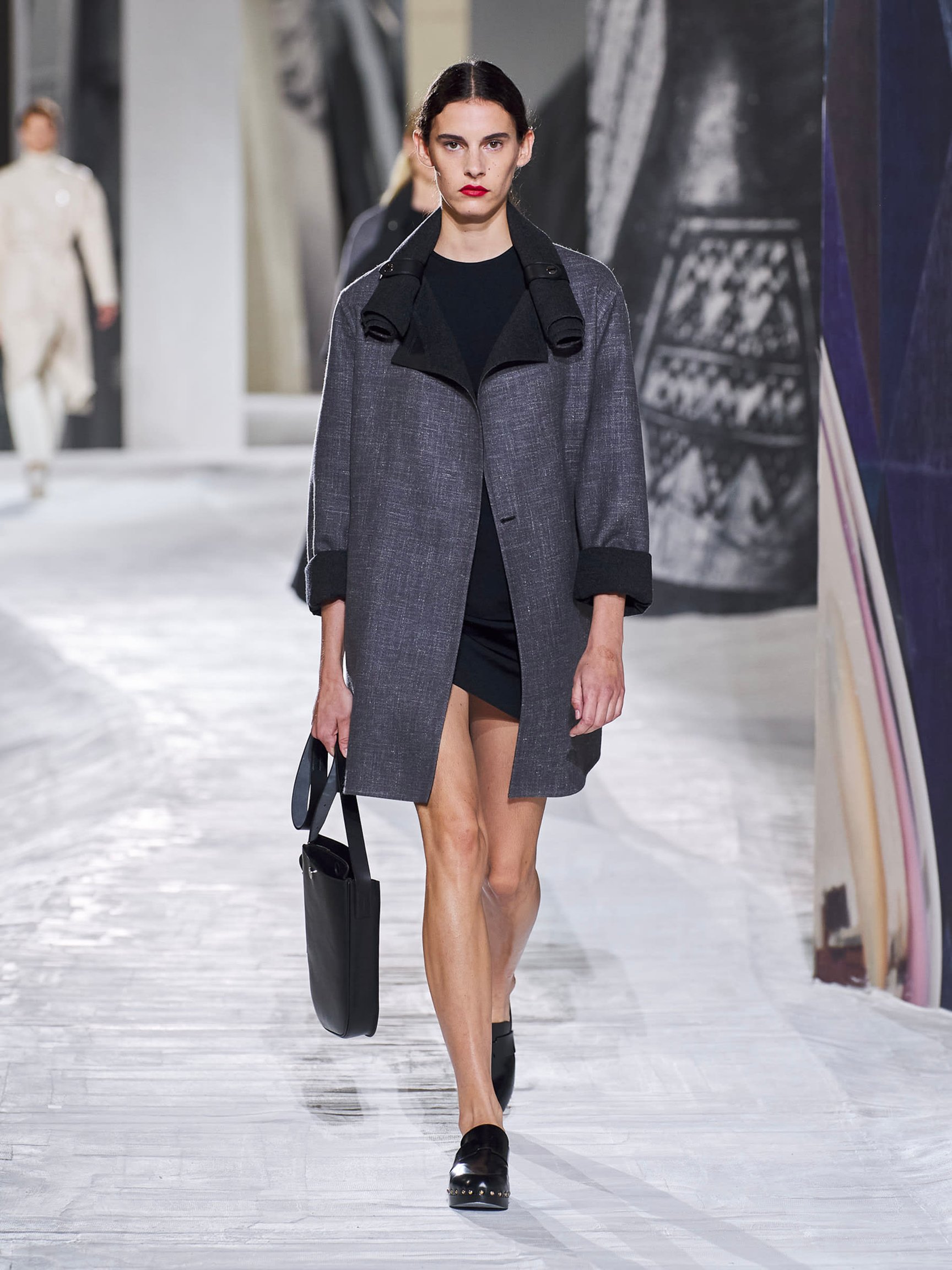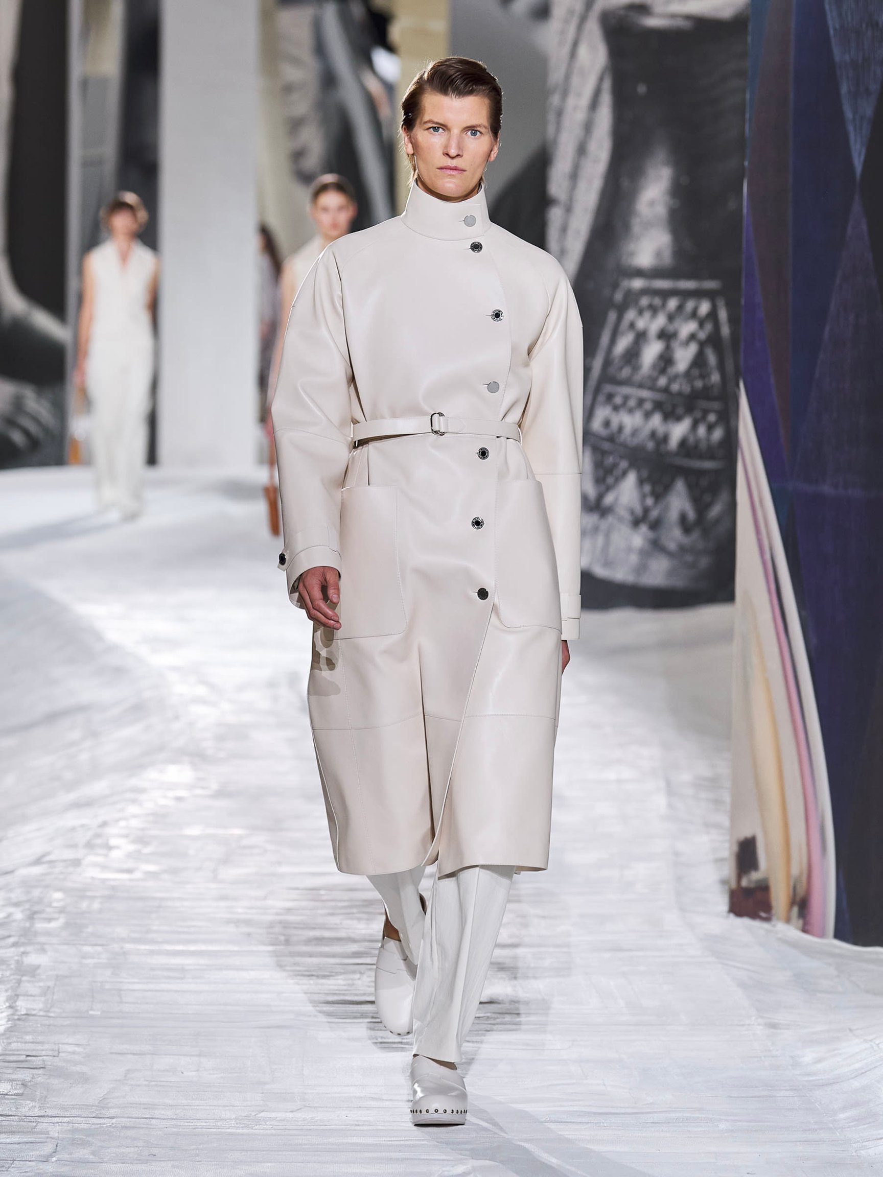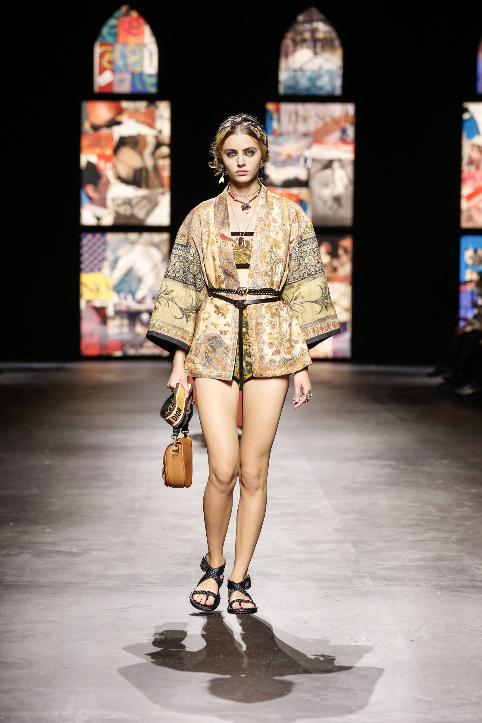 マリア?グラツィアは視覚的な詩の美しさを取り入れるために、ヴァージニア?ウルフやスーザン?ソンタグなど女性作家たちの装いから着想。代表的な「バー」ジャケットは、ディオールが1957年秋冬で日本のためにデザインしたシルエットを再解釈し、羽織のようにゆったりとしたデザインに。心地よく身体を包み込むようなソフトなファブリックが目立ち、インドネシアのバリ島に起源を持つイカット織りや、ビーズのエンブロイダリーなど手仕事の温かみをまとった。
