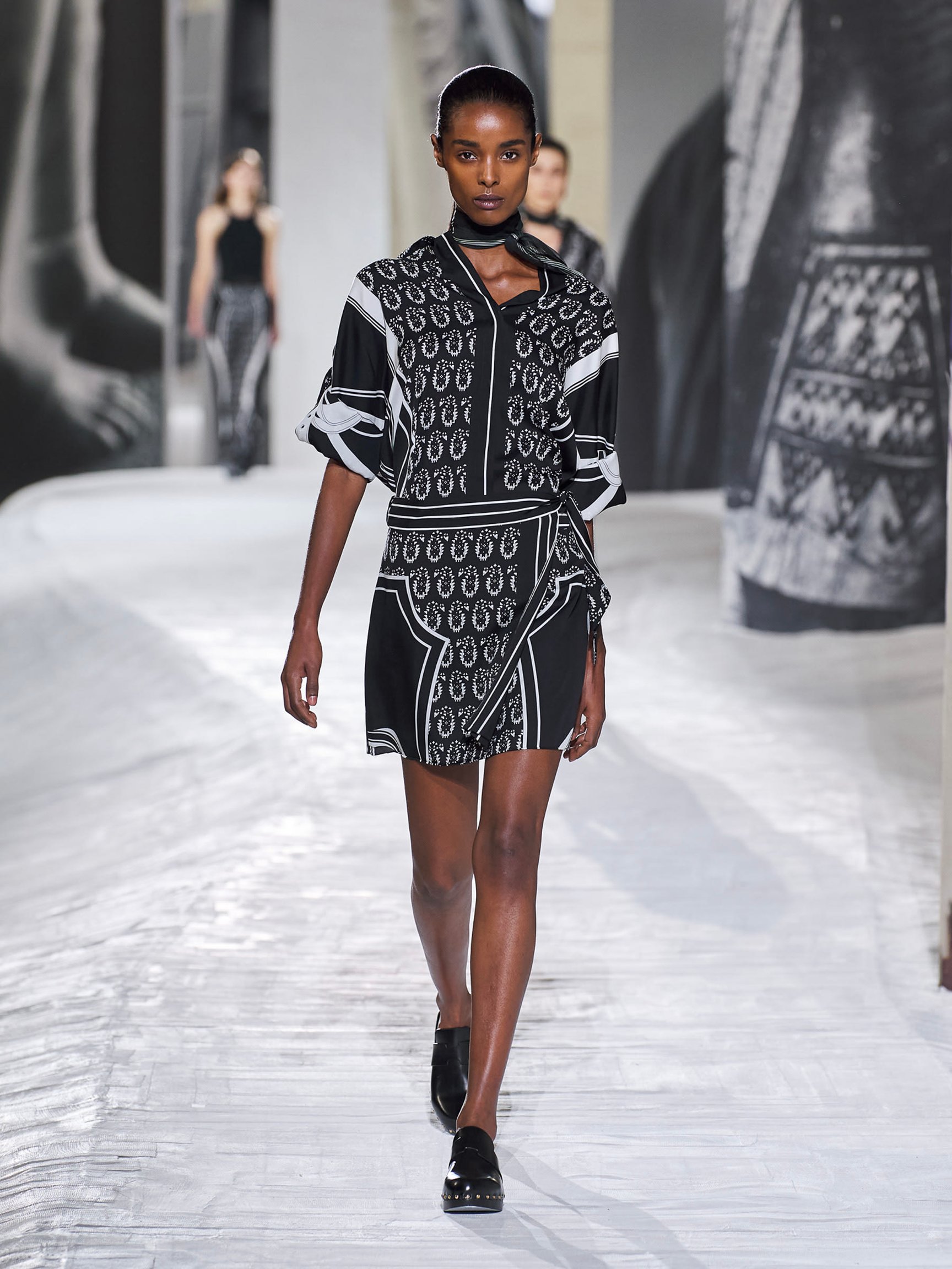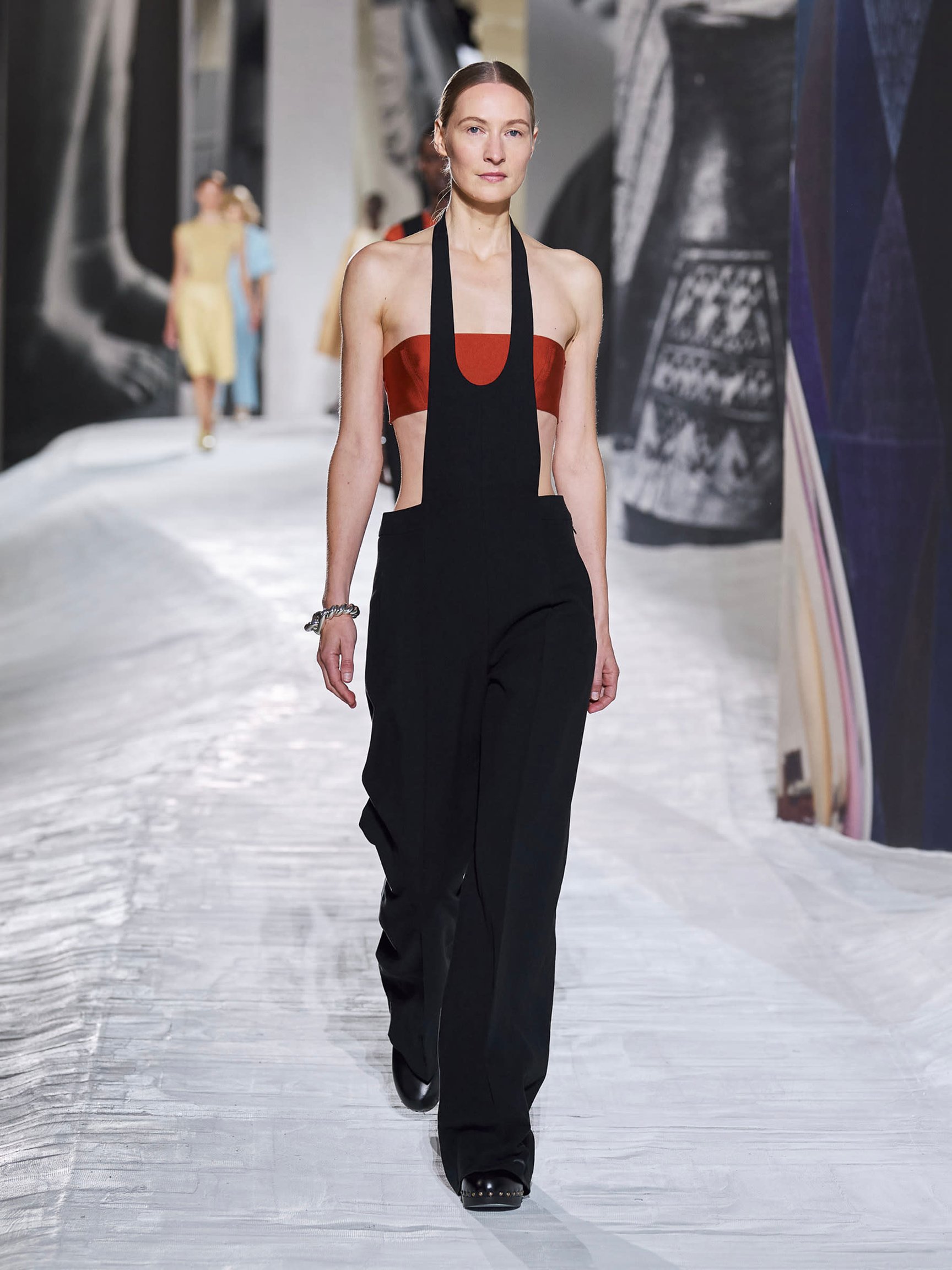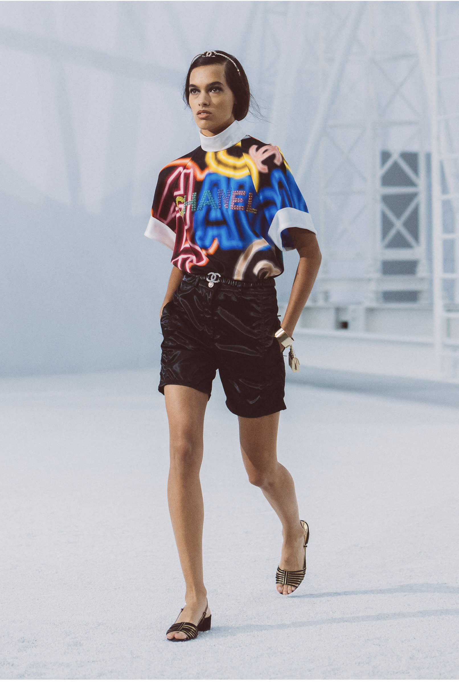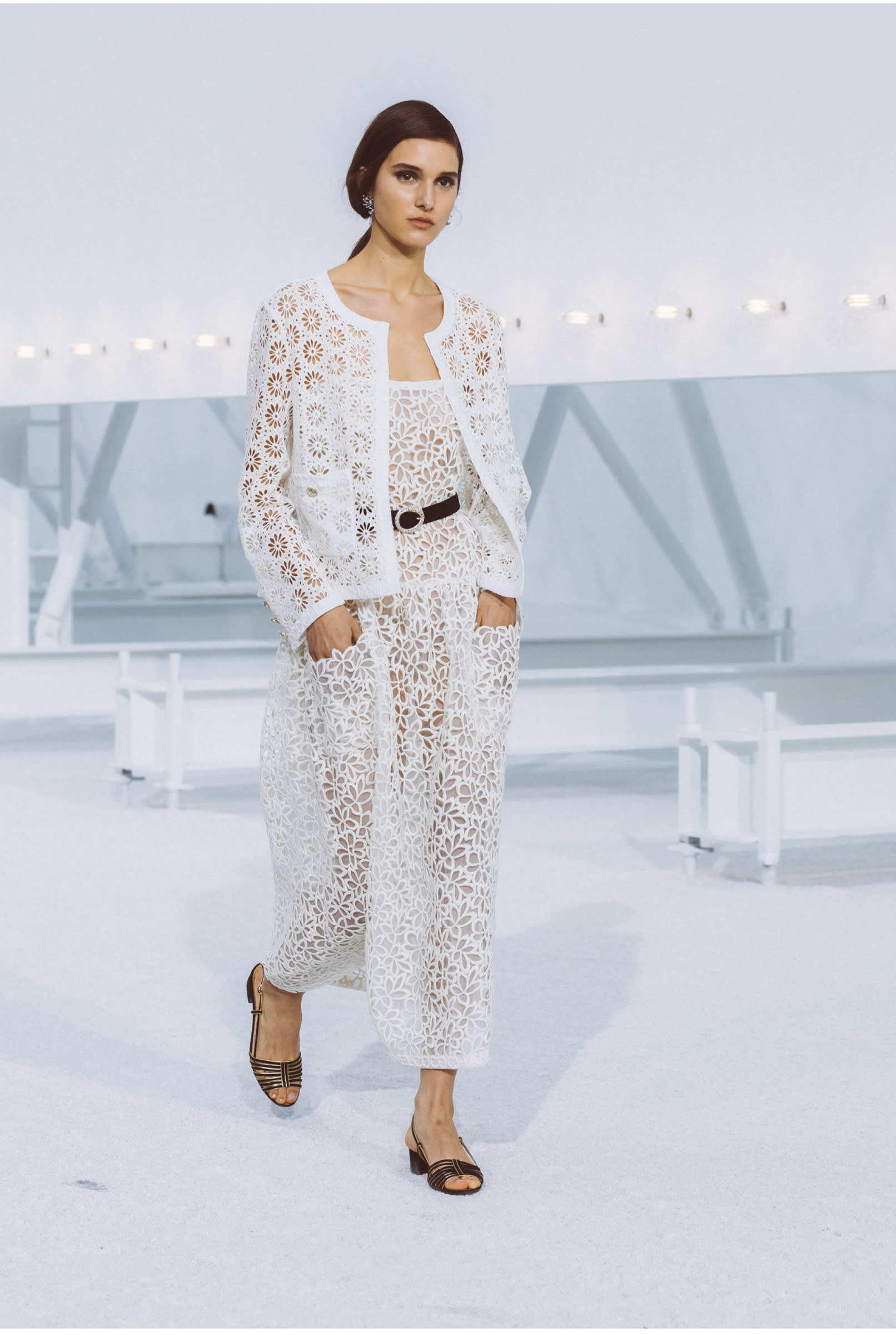 ファーストルックはドロップショルダーのツイードスーツ。小花プリントのドレスはフェミニンなフリルやボウが飾る。カプリパンツやバミューダパンツのセットアップ、ワンショルダーのミニドレスといった軽快なデイリーウェアが多く、中盤はレッドやペールピンク、ネオンライトのようなロゴプリントなど明るい色彩のミックスを提案。後半はブラック&ホワイトに一転し、ロングジレのパンツスーツやレースのセットアップ、豊かなボリュームのプリントシフォンやフェザーといった、マットな素肌をエレガントに魅せるスタイルが並んだ。