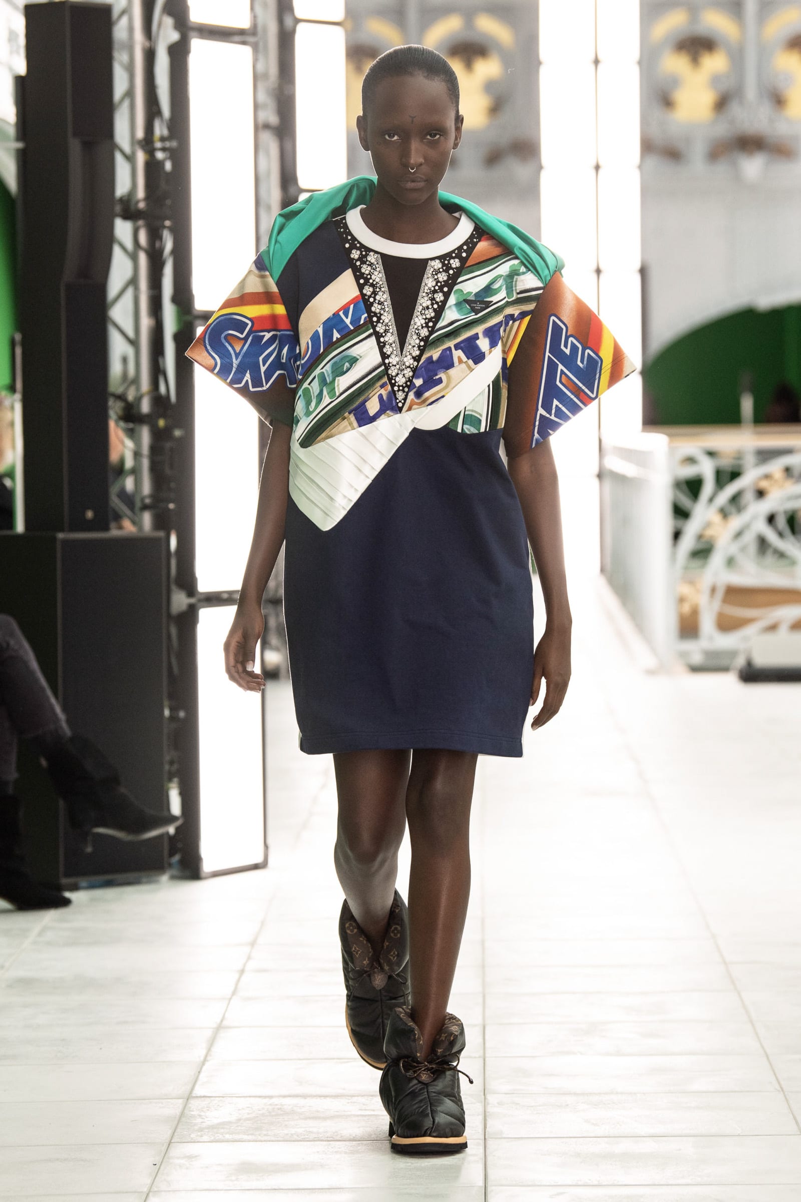 アーティスティック?ディレクターの二コラ?ジェスキエール(Nicholas?Ghesquiere)による2021年春夏コレクションは、ジェンダーの区別を消し去るなど、未だスタイルが確立していない領域に足を踏み入れることを試みたという。ファーストルックは、まさに性別を感じさせないワークパンツのカジュアルなスタイルで、トップスにグラフィティ調で書かれた「Vote」のメッセージプリントが視線を集めた。続くスタイルもジェンダーフリーがベースとなり、後半は構築的なフォルムに多彩なプリントをパッチワークの手法でコラージュした。