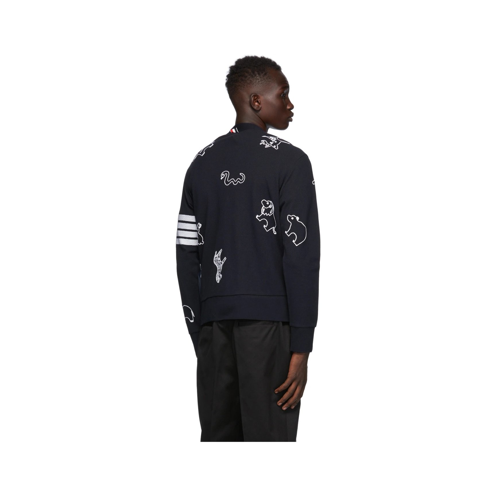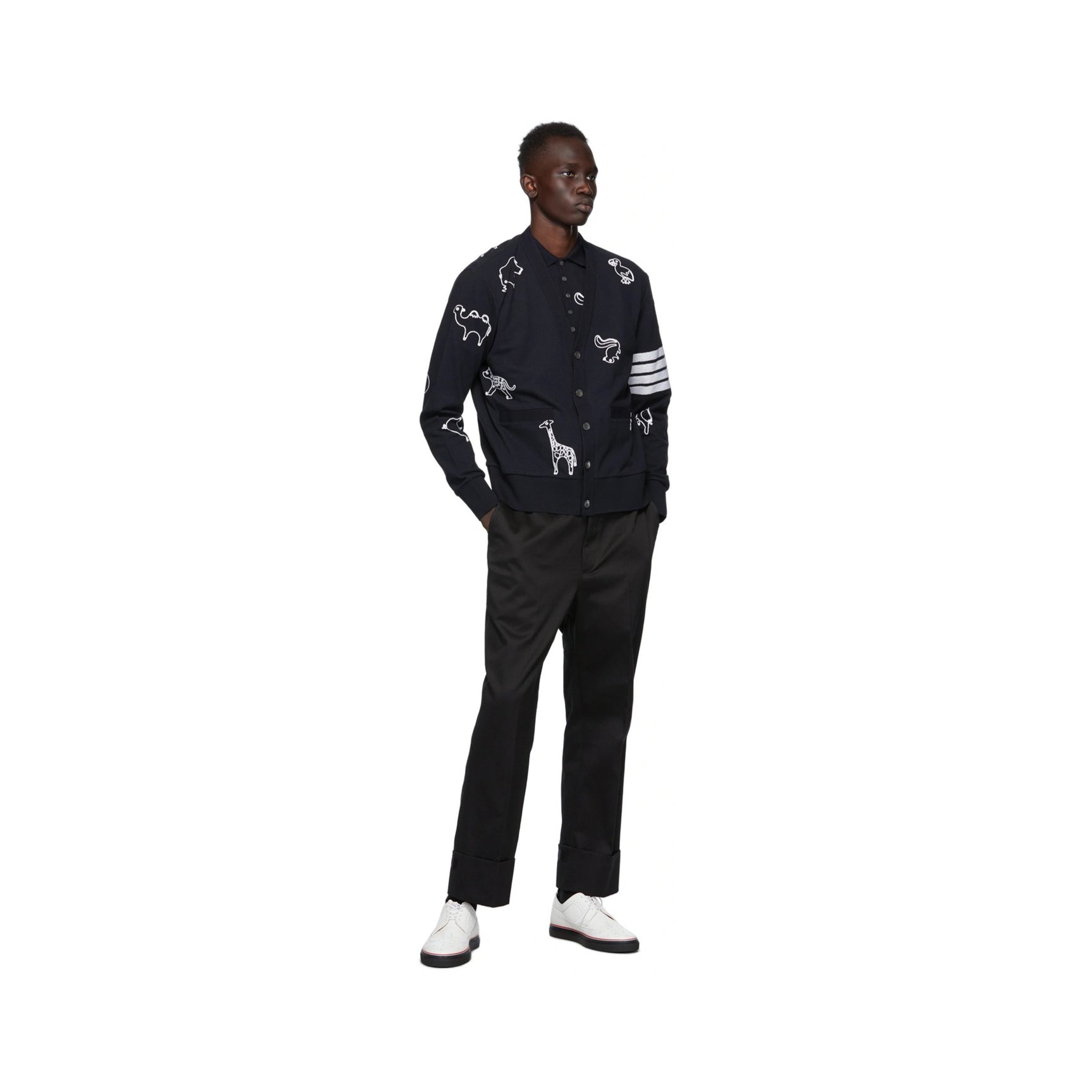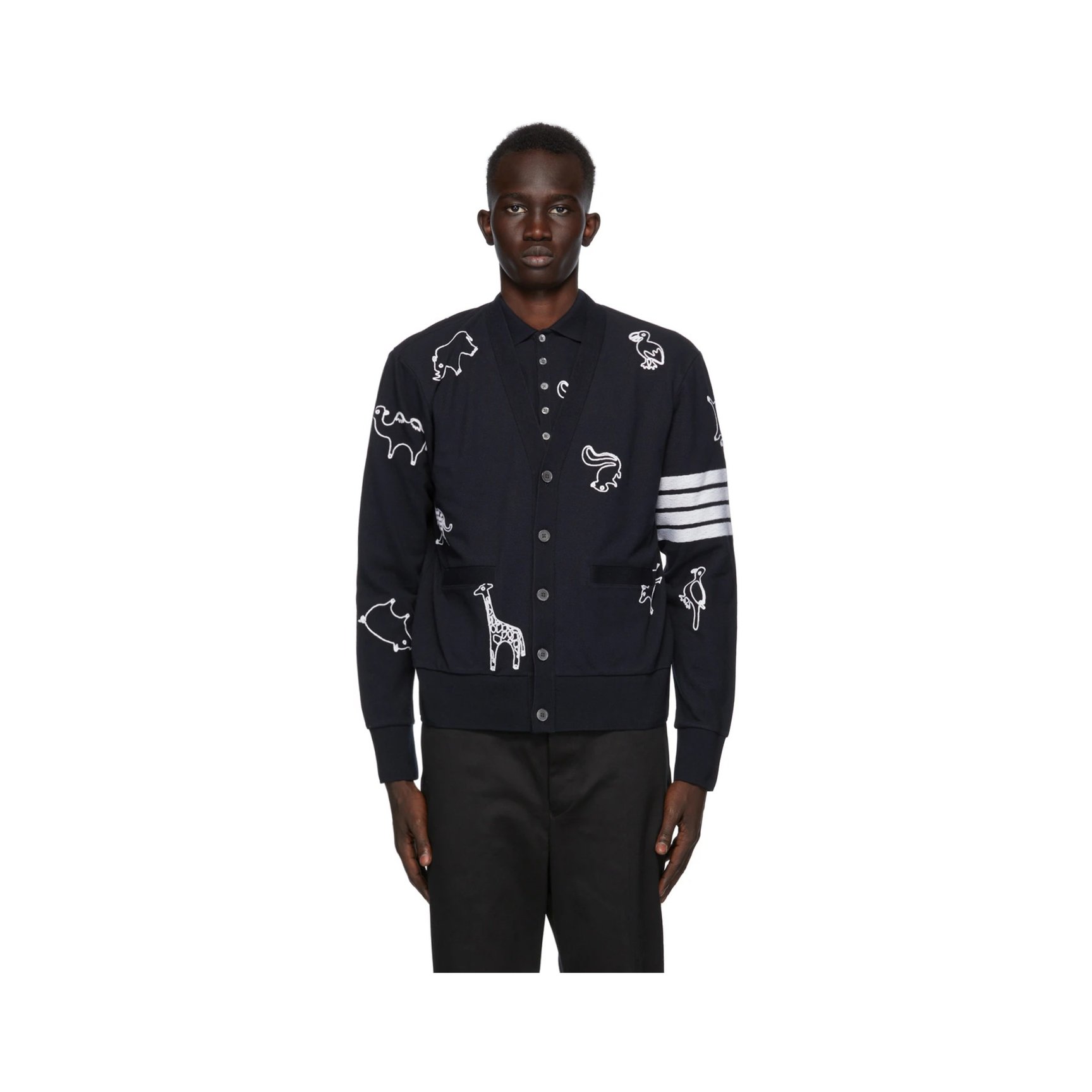 「トム?ブラウン(THOM?BROWNE)」のネイビーカーディガンは、シンプルな線で描かれたアニマルイラストを全面にプリントしています。リスやサイ、ラクダなど、ユニークな動物たちがたくさん。コットン100%。