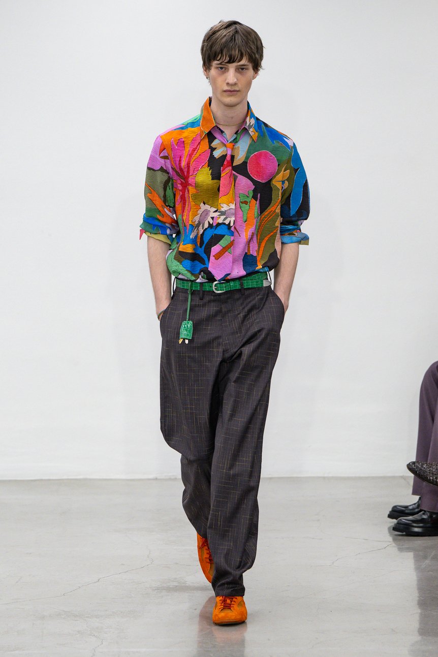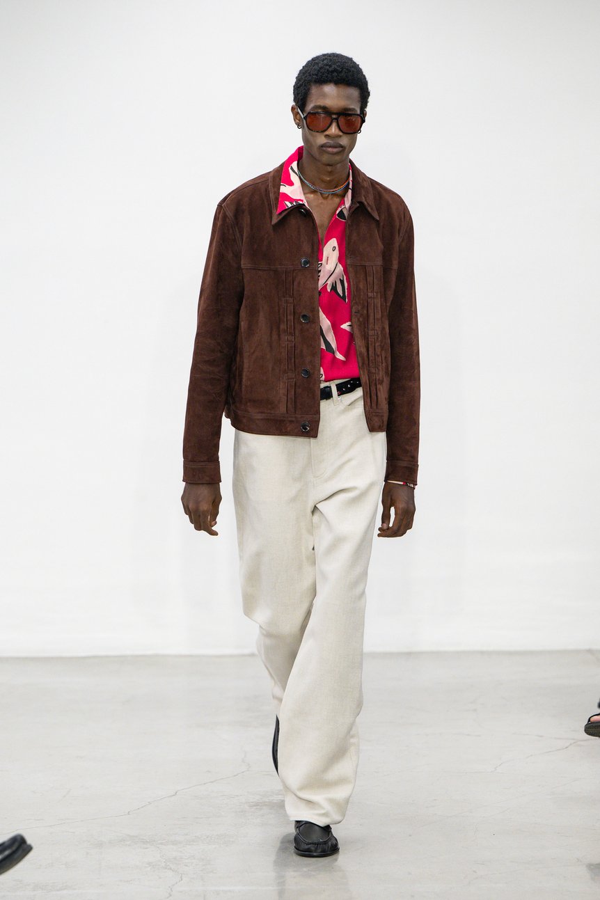 今シーズンの象徴的デザインは、手作業のコラージュを用いたプリントだ。シャツやアウター、ネクタイに大胆に施されたこれらのモチーフは、ポール自身が撮影した看板の欠片、舗道の割れ目、車窓からの景色など「見過ごされがちな瞬間」を切り取り、再編集したもの。シルクスクリーンで重ねられた層が視覚的な奥行きを生み、ひとつの服の上に複数の“旅の時間”が共存する。ダブルブレストジャケットに配された鳥のアップリケや、スエードパッチで象った植物のレザーブルゾンは、プリントの二次元性を超えたテクスチュアルな“飛び出すコラージュ”であり、触覚的な驚きを誘う。
