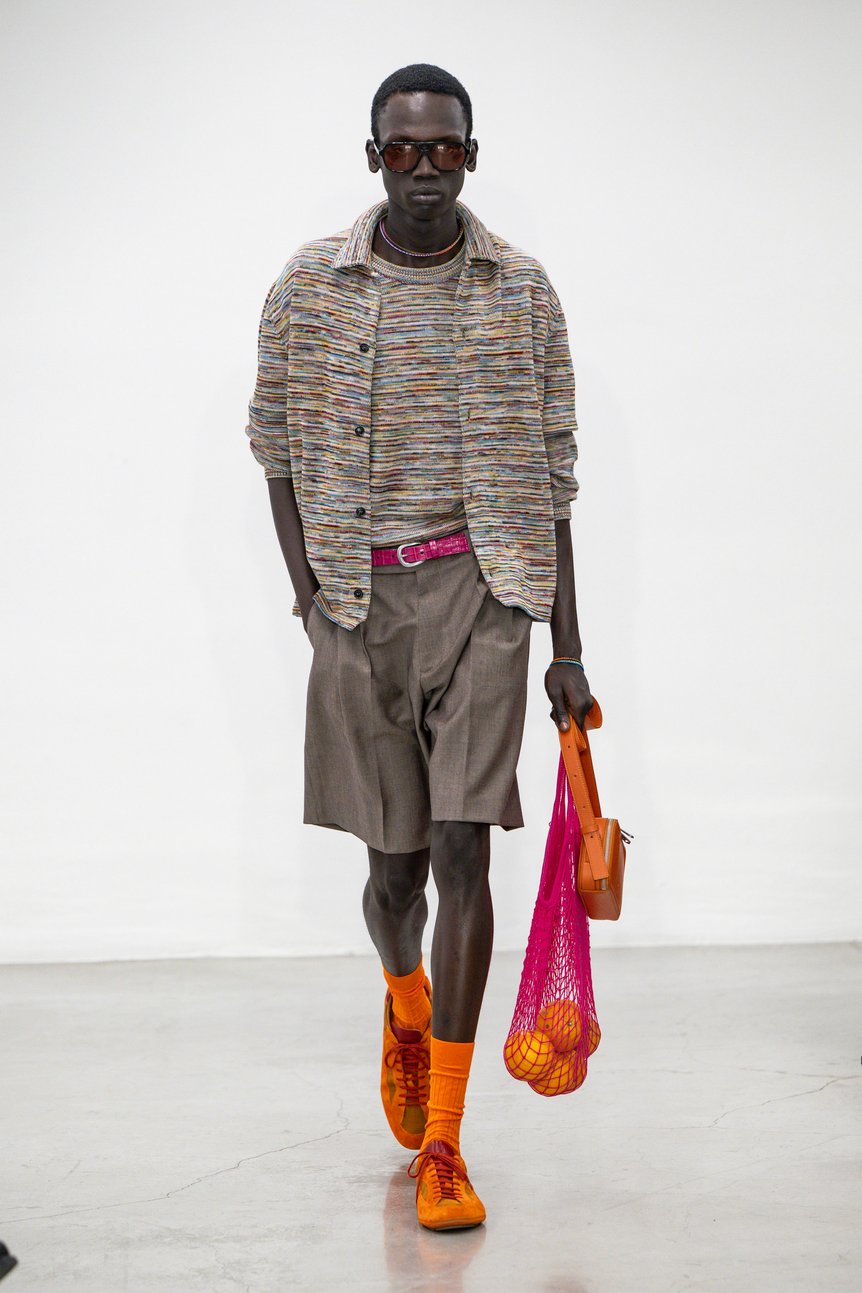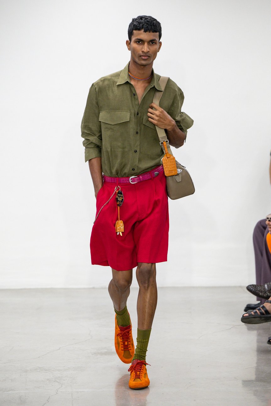 ミラノファッションウィークに初めて参加し、ショー形式で披露した2026年春夏メンズコレクションは、ライムグリーン、フューシャ、コーラルといったトロピカルで温かな色彩に、カイロのストリートフォトブックから着想した陽に焼けたアースカラーが交錯し、手染めのようなムラ感が布の奥行きを強調する。これらの彩色は、ポールが1970年代にノッティンガムで開いた初のショップで壁いっぱいに吊るした古着や雑貨の“ごった煮感”を思わせ、ブランドが一貫して大切にしてきた雑多な美意識「捨て置かれたものの中にこそ宝がある」という信条を今季の文脈でアップデートしている。