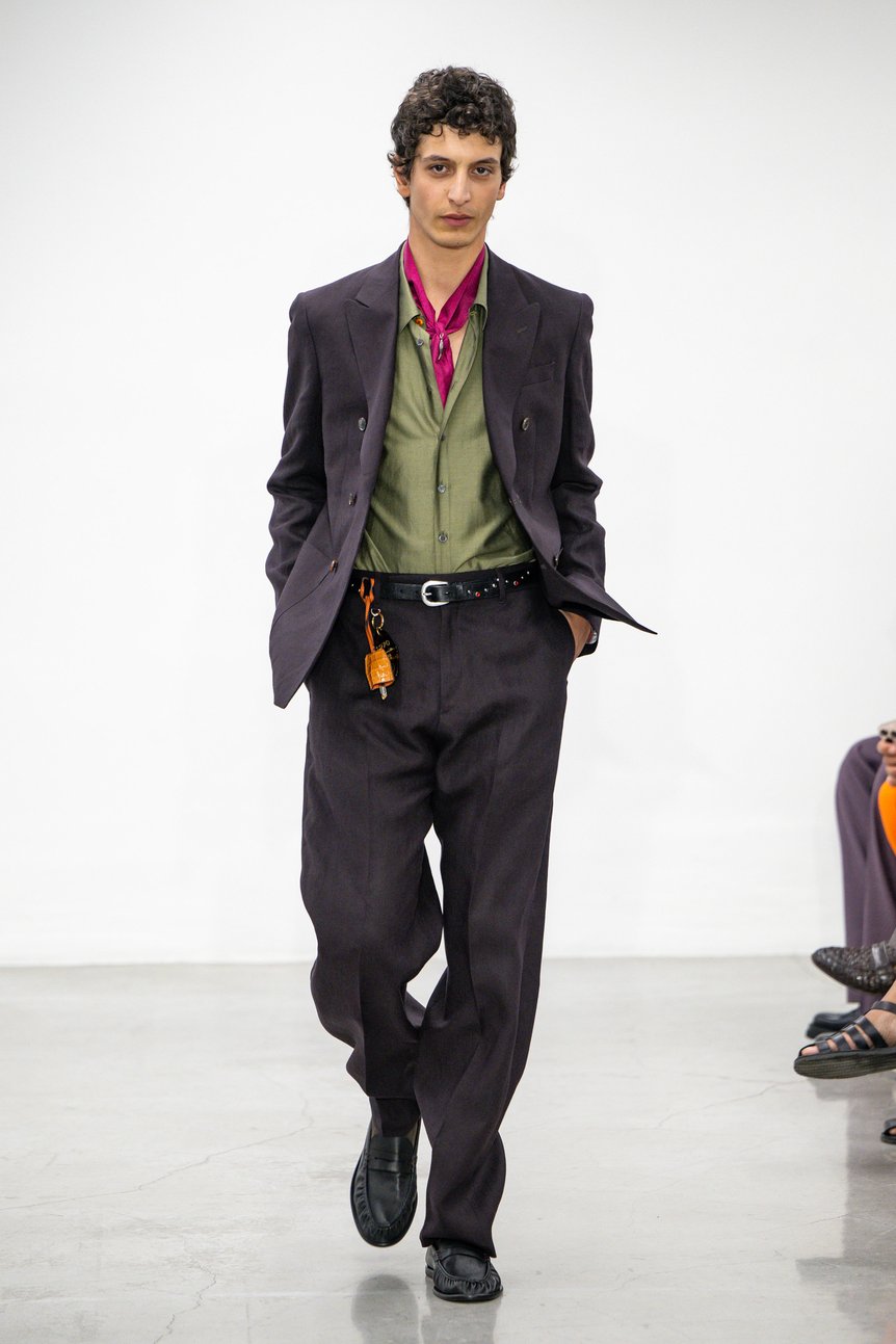シルエットは1950年代のカウンターカルチャーに敬意を払い、ショート丈ジャケットとハイウエスト?フラットフロントのトラウザーズが基調。過去数シーズンで多用されたツータックを排し、よりクリーンかつリラックスした線を描くことで、旅の軽やかさを体現したという。裾をロールアップしたパンツの下から覗くのは、レーシングドライバーのシューズを思わせる流線型のフットウェア。レザー、メッシュ、スエードをパズルのように組み合わせた異素材づかいが、コラージュのテーマを足元まで響かせる。