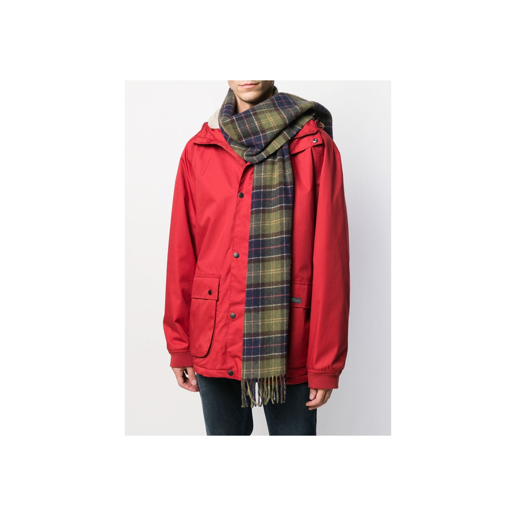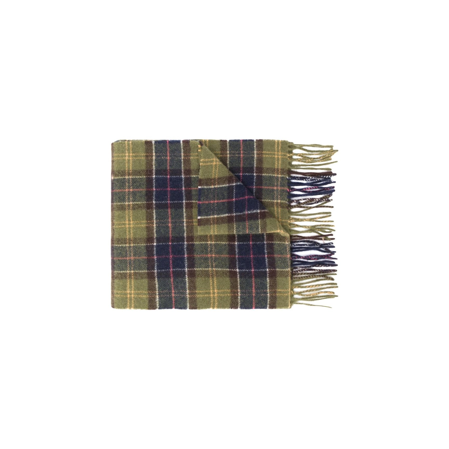 「バブアー(Barbour)」のカーキグリーンのウールマフラー。バブアーらしい、ブリティッシュカントリーのムードにあふれたタータンチェック柄です。200cmと長めのレングス。