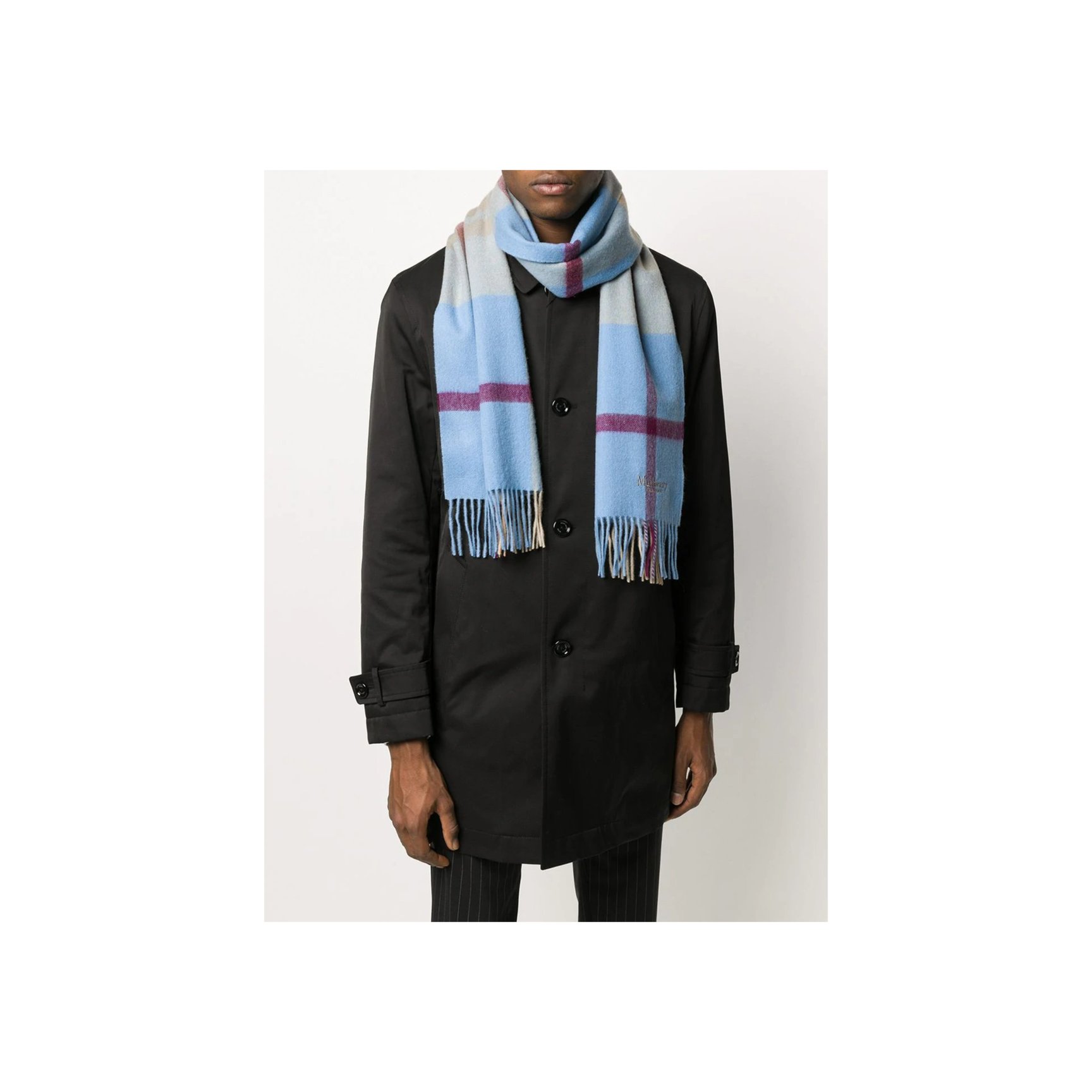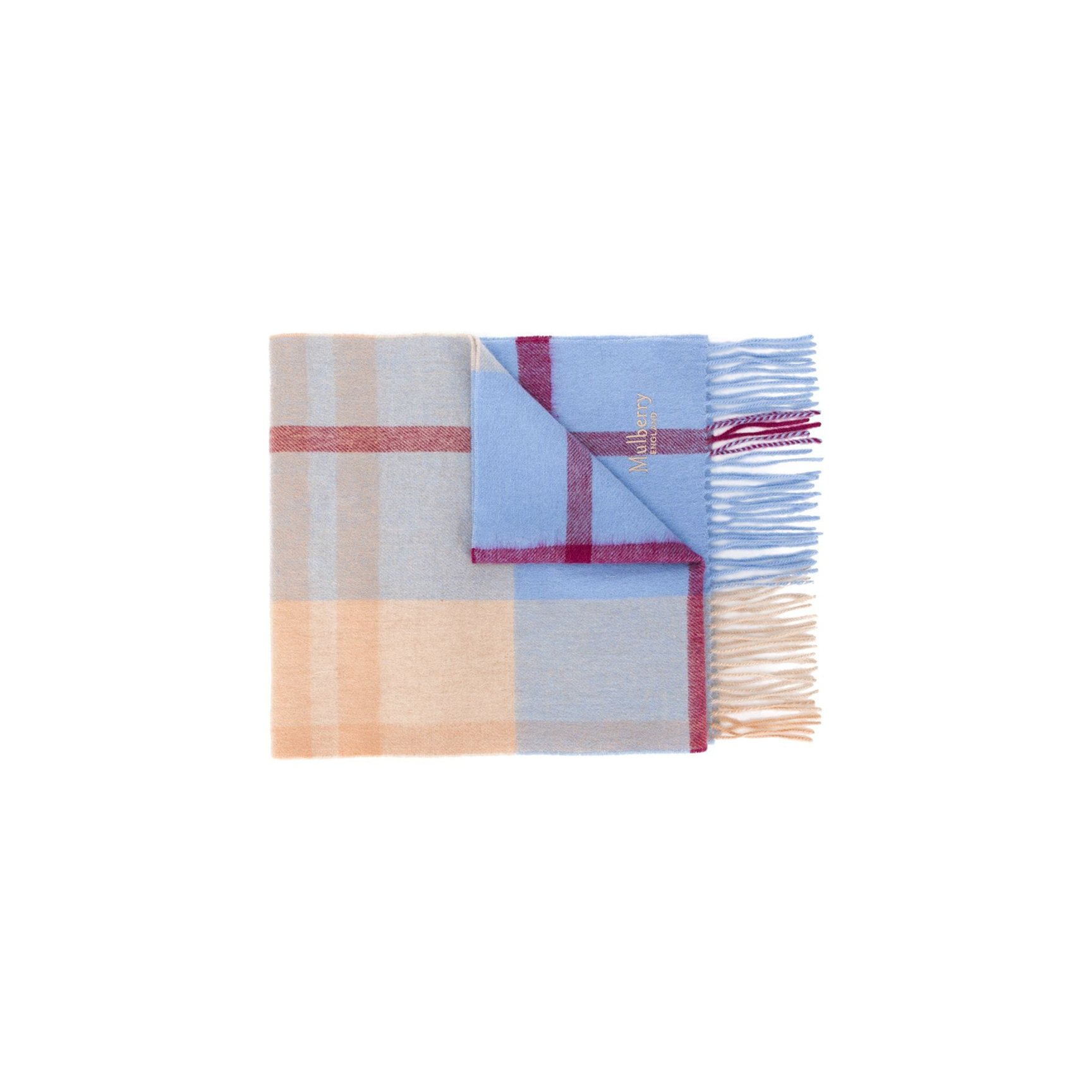 「マルベリー(Mulberry)」のマフラーは、爽やかなブルーが特徴。不規則なチェックパターンがモダンな印象です。ラムウールを100%使用。