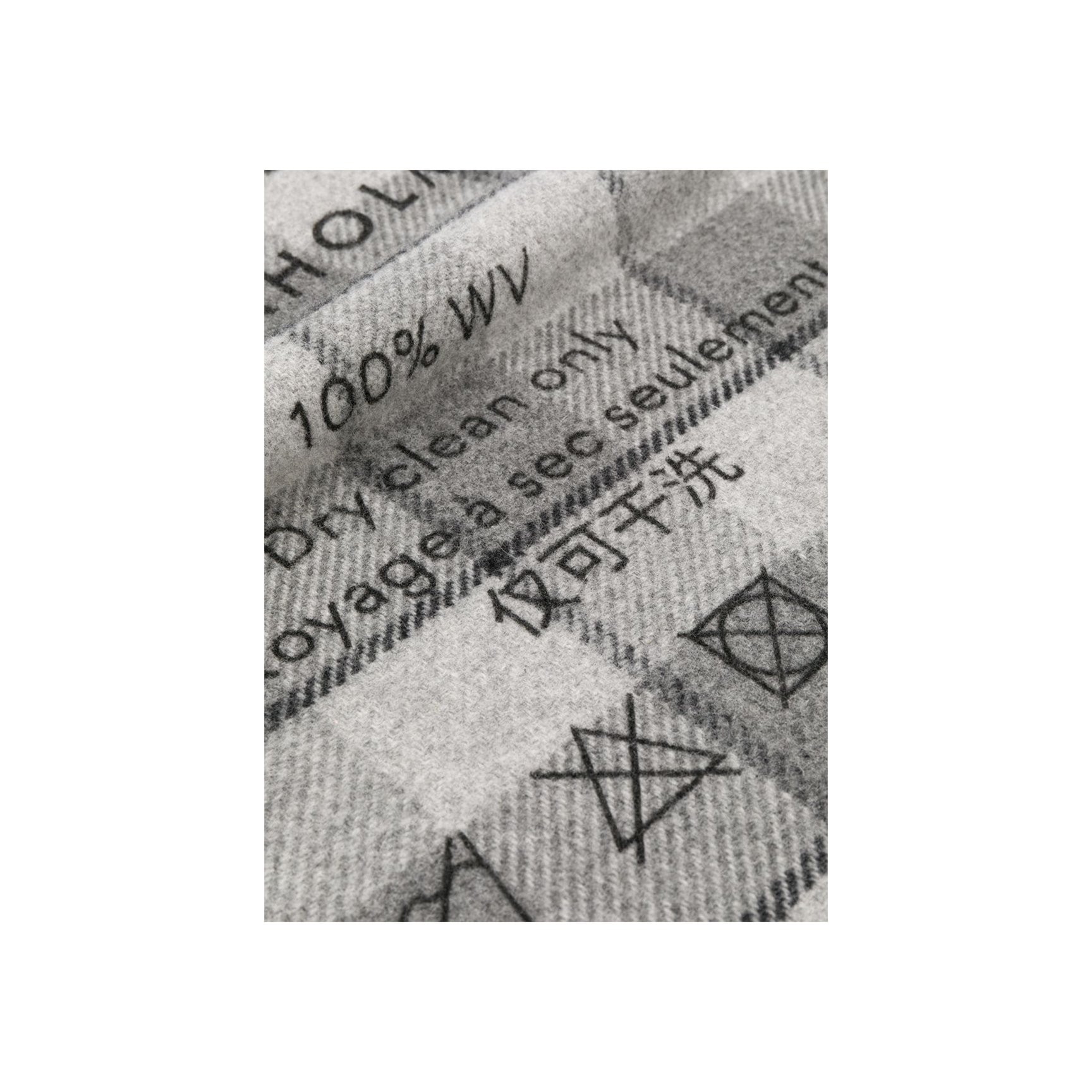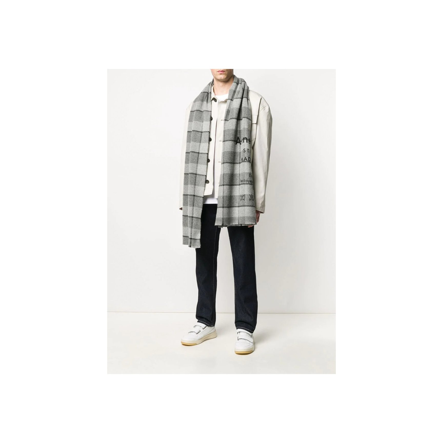 「アクネ?ストゥディオズ(Acne?Studios)」のウール100%の大判マフラー。フリンジの無いシンプルなディテールと、グレートーンがマッチ。ミニマルな雰囲気ながら、注目したいのがビッグサイズの文字プリント。ブランドロゴだけでなく、なんと洗濯表示のマークまで。これなら間違って洗濯機に放り込まずに済む?!