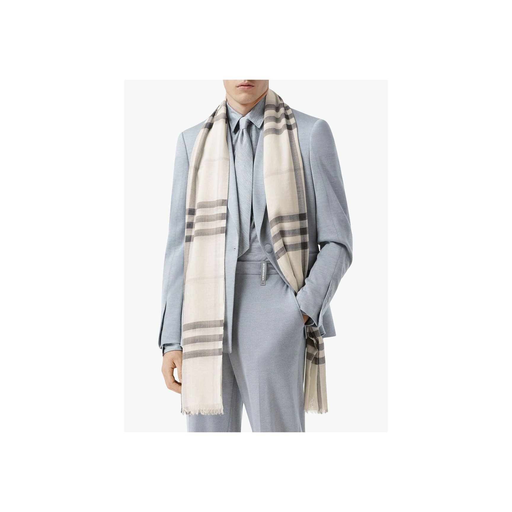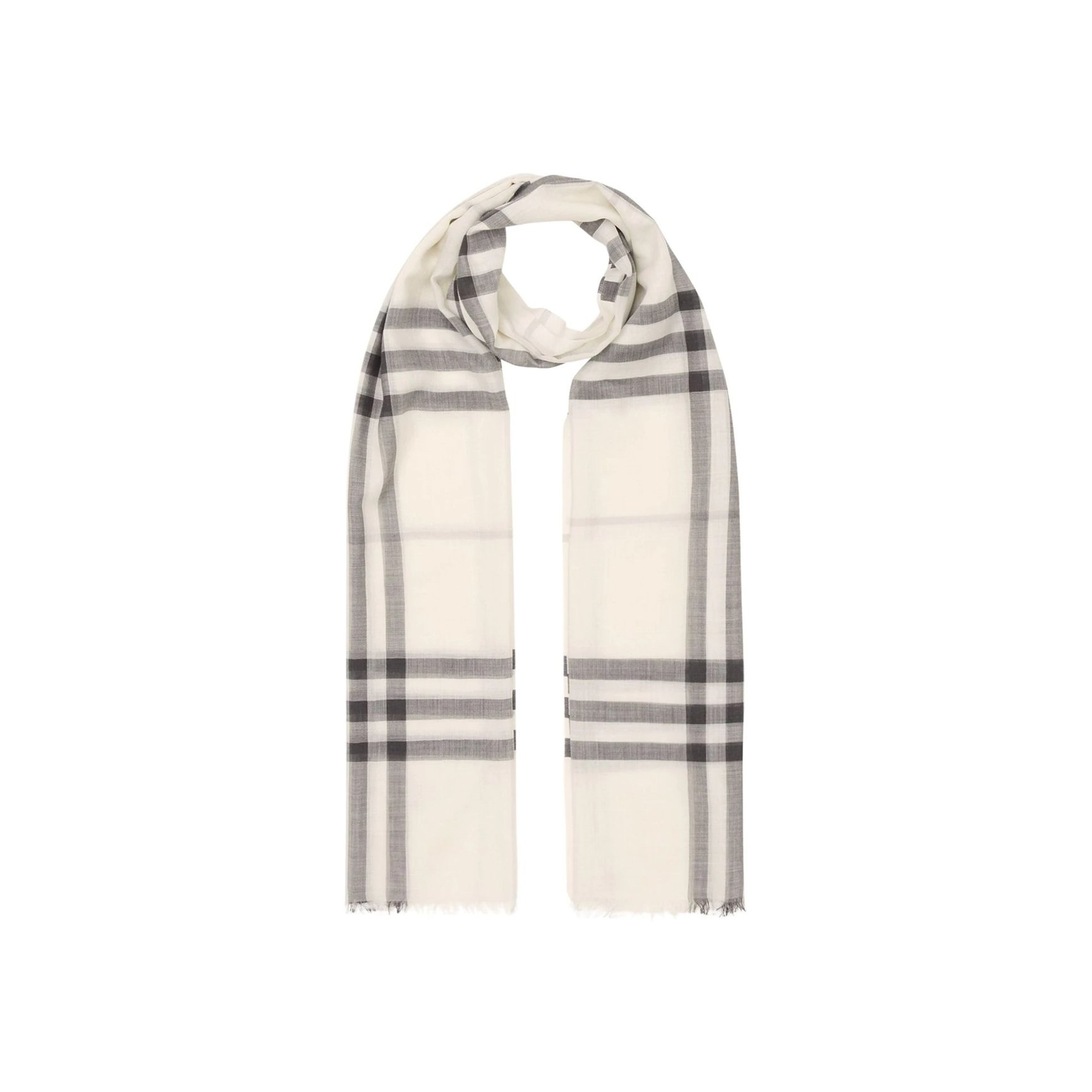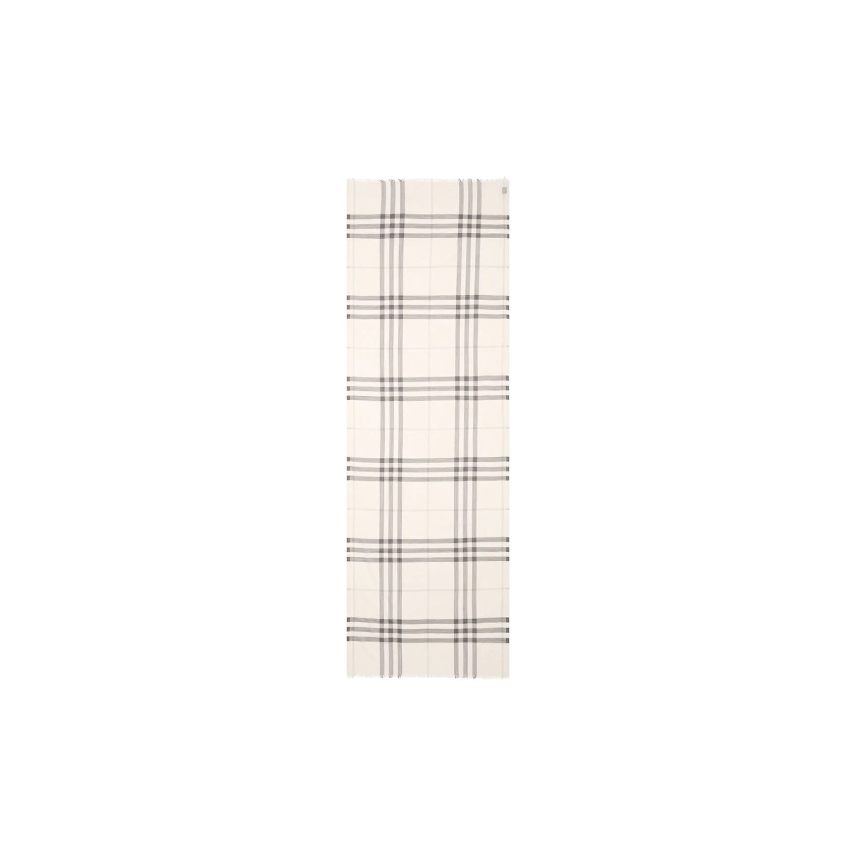 ホワイト&ブラックのバイカラーが上品な「バーバリー」のマフラー。エレガントな光沢はウールとシルクの混紡素材によるもの。220cmの長めのレングスを活かし、さらりと身につけたいアイテムです。