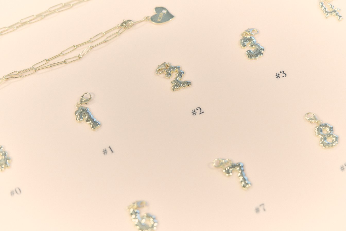 ネックレスとブレスレットのチェーンは、数本繋げてベルトのようにしたり、シルバーとゴールドのアイテムを、ジュエリーを重ね付けするようにミックスしても楽しめる。チャームの単品購入も可能。数字の選び方は、「自分の誕生日」や「好きな数字」など、意味を持つ数字を選ぶほか、「080」から始まる電話番号といった、遊び心を持って選ぶのも面白いとANNA.。