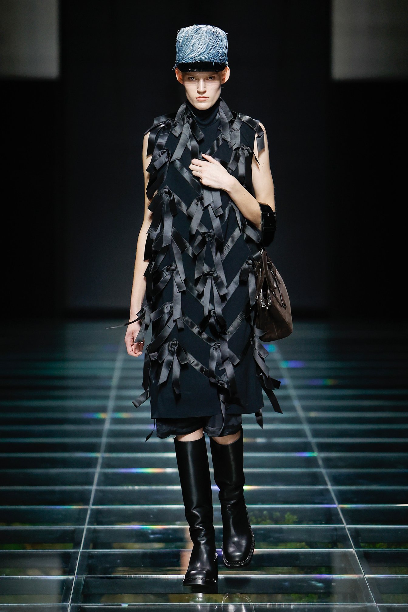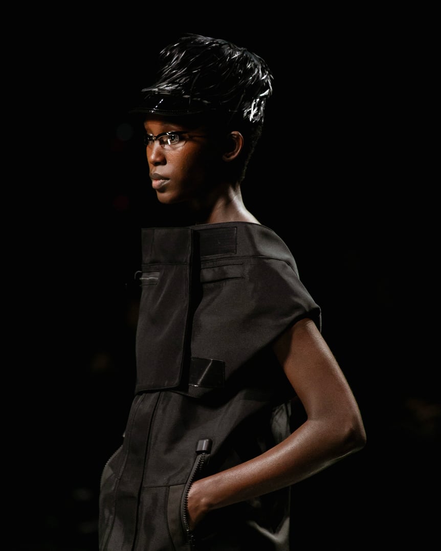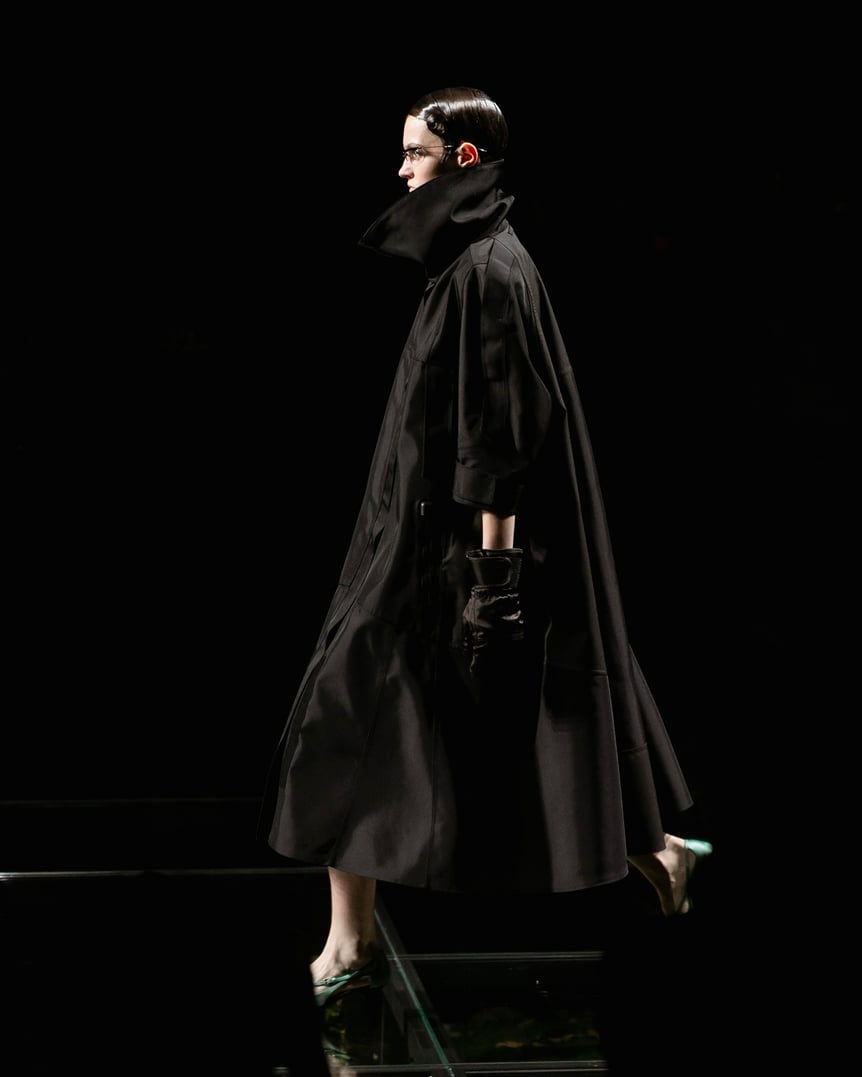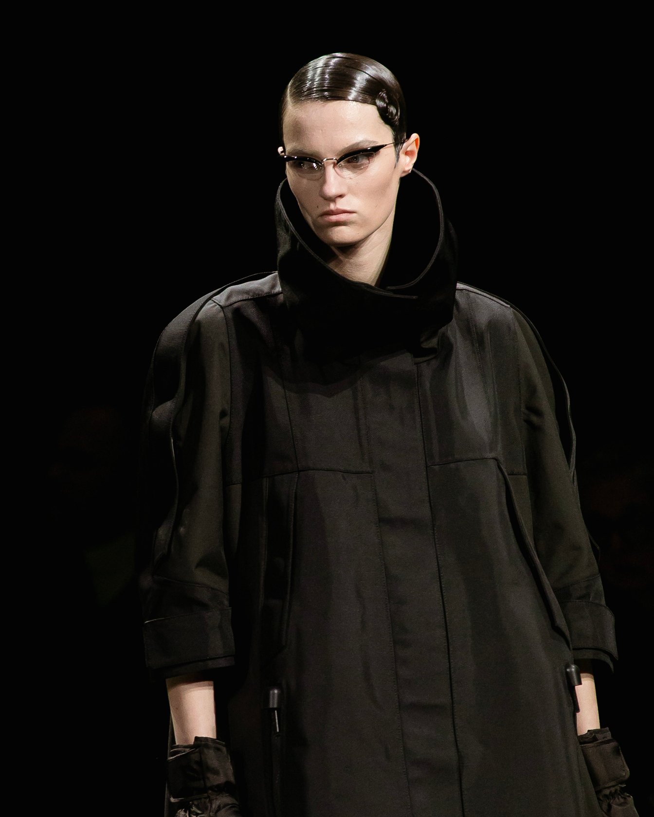 終盤に登場したのは1950年代ファッションを彷彿とさせるオペラコートやオフショルダーのドレス。これらはリナイロン素材で仕立てられ、エレガントなシルエットをタフなファブリックと無骨なグローブやファスナーのアクセサリーやディテールなどによって現代的な解釈でアップデートされている。