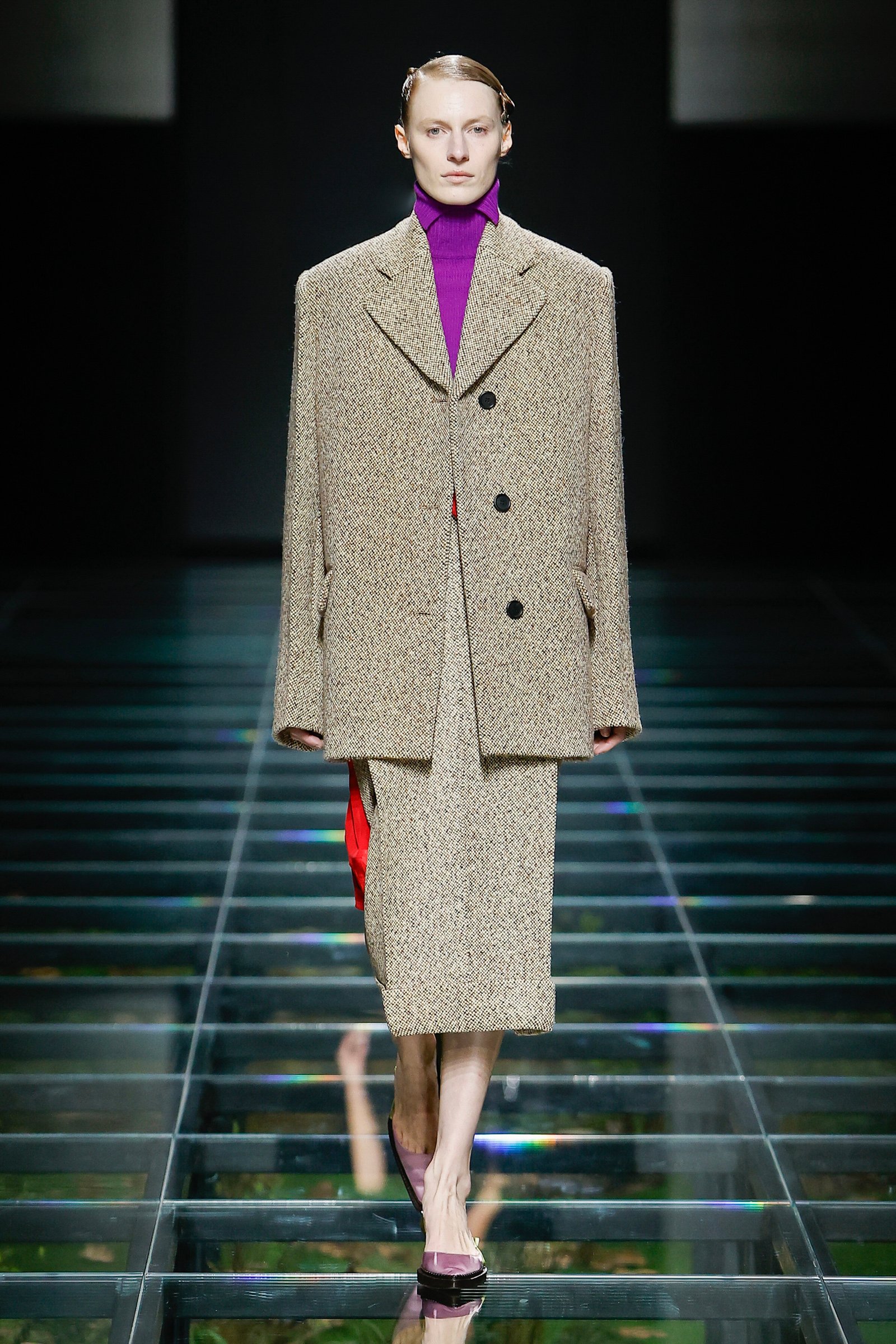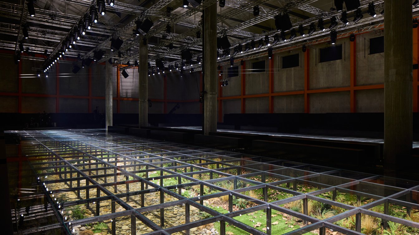 毎シーズン同じ会場であっても、天井が昇降したり、スライムが流れてきたりドラマチックな演出を仕掛けることでも知られるプラダのショースペース。今シーズンはメンズ同様、ガラス張りのフロアを金属フレームで取り付け、テラリウムのような空間が観客の足元に出現した。人工的に作られた"庭"ながら、シダや落ち葉、小石などが敷かれ、あたかもずっとそこにあったかのような地面がガラスの床越しに見える。単に1月に行われたメンズショーのリピートというだけでなく、それは今回のテーマである「ロマンス」を語る上での物語的な没入演出かもしれないし、今シーズン、ミウッチャ?プラダ(Miuccia Prada)とラフ?シモンズ(Raf Simons)が探求した「今日のファッションを形作った過去を遡る」という行為の時間経過を表現したものなのかもしれない。