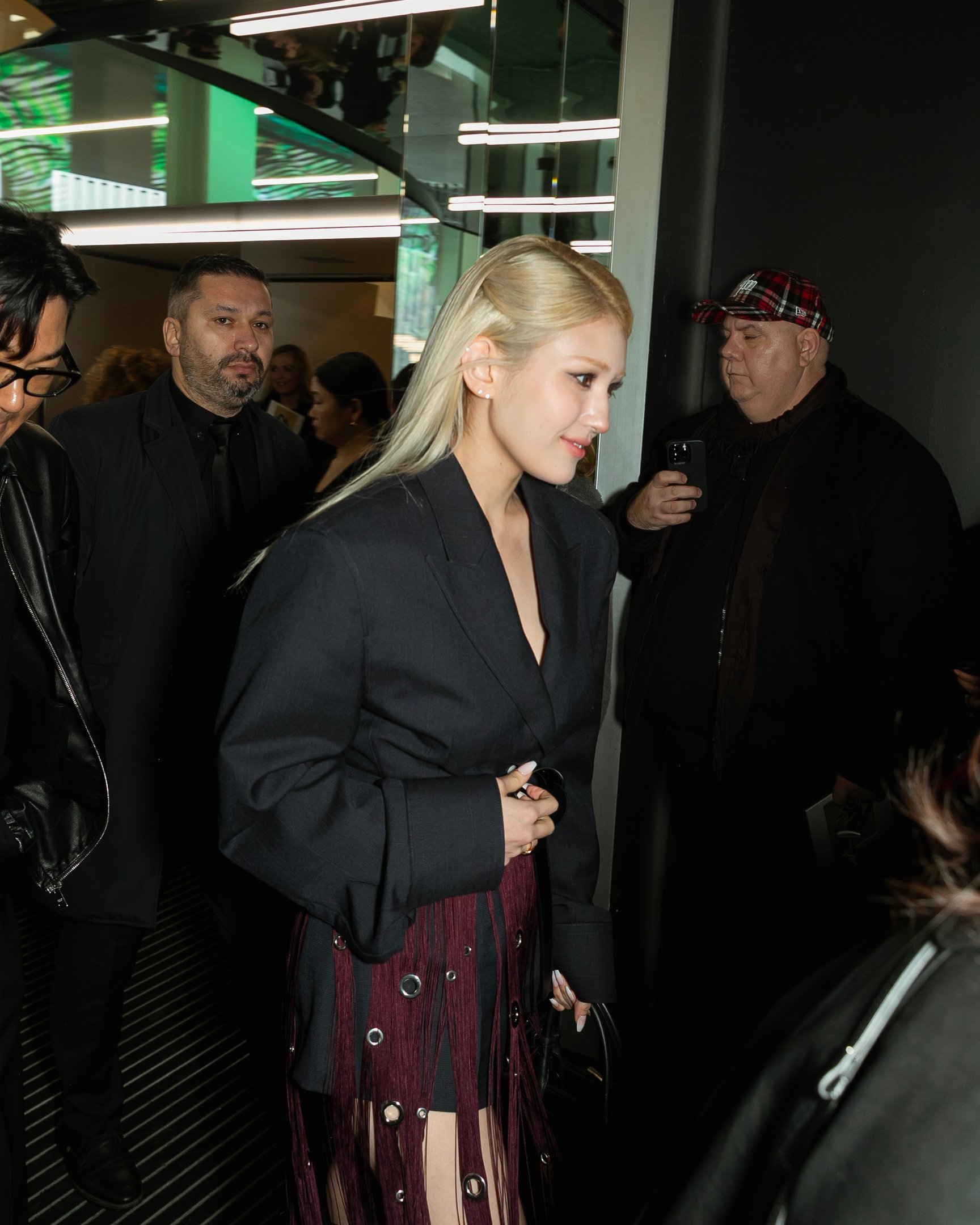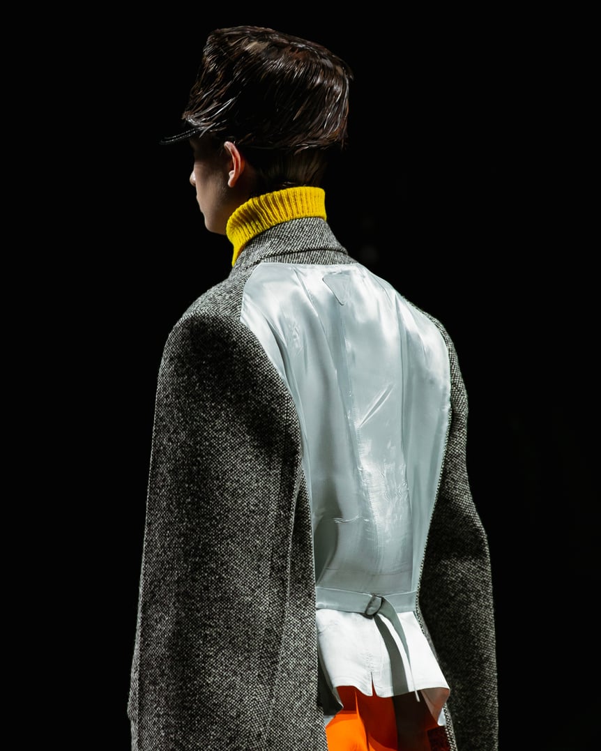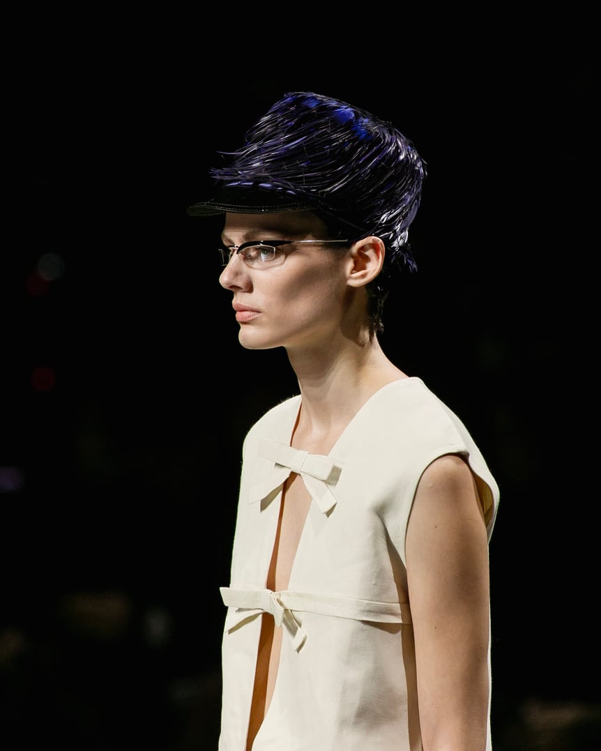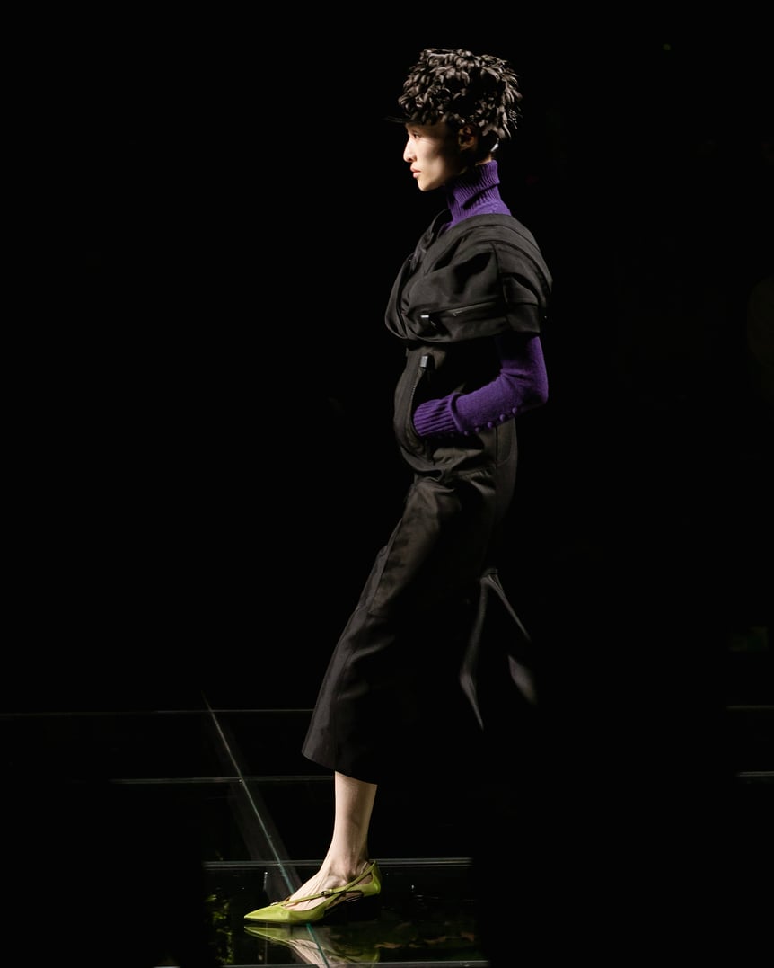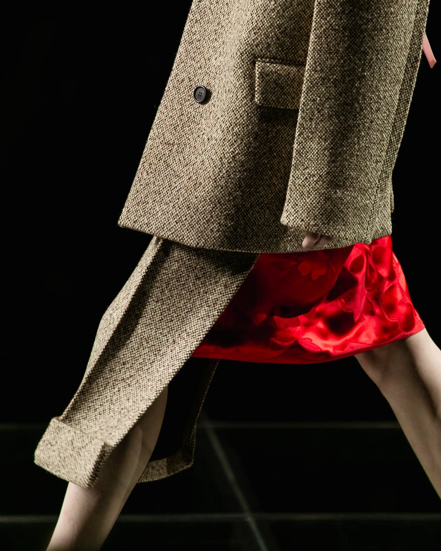 ミウッチャを象徴するような丈感のスカートのスーツスタイルは一見正面からだと、細身で厳格な仕立てに見えるが、横から見るとボリュームが増し、スカートはエプロンのように前だけで後ろはシルクスリップが露わになっている。フォトブースが正面だけでなく背面にも設置されるべき、と思わせるほど一方からは隠された二面性を持つ再構築的なアイテムが多く登場し、素材や色でコントラストを効かせた意外性のあるルックでオーディエンスの興味を引いた。