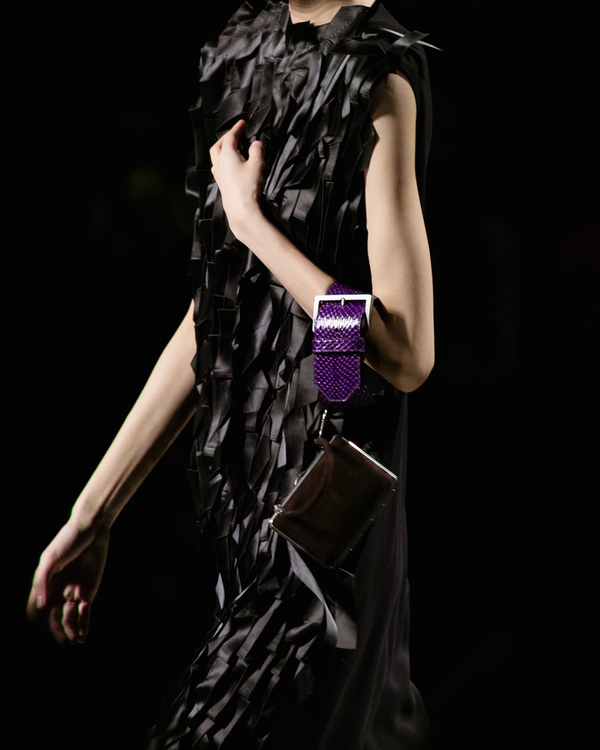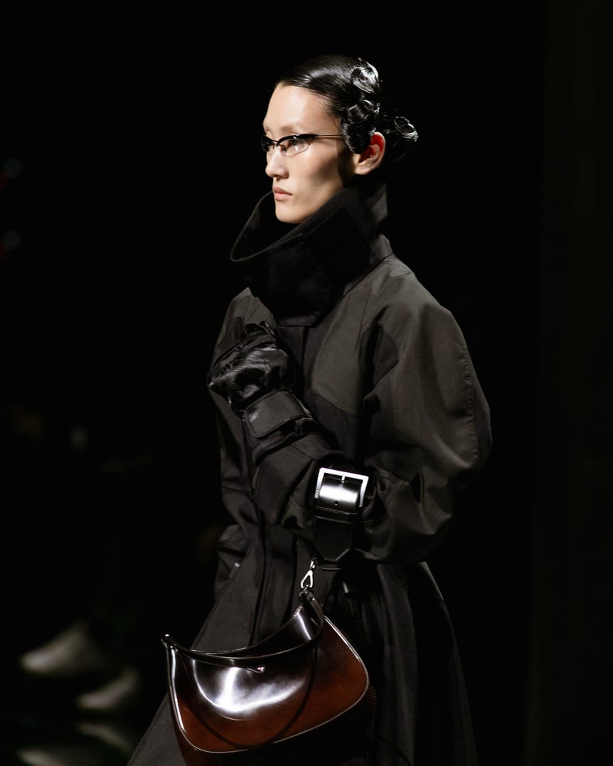 ベルトに取り付けられたハンドバッグは形や大きさも様々。ベルトを腕に通す持ち方は新しい提案というより、手を胸当てるようなポージングを生み出すための役割を担っていたように見える。上部のフレームがアイブロウのように見えるアイウェアは顔の印象をシャープに変えるユニークなアイテム。