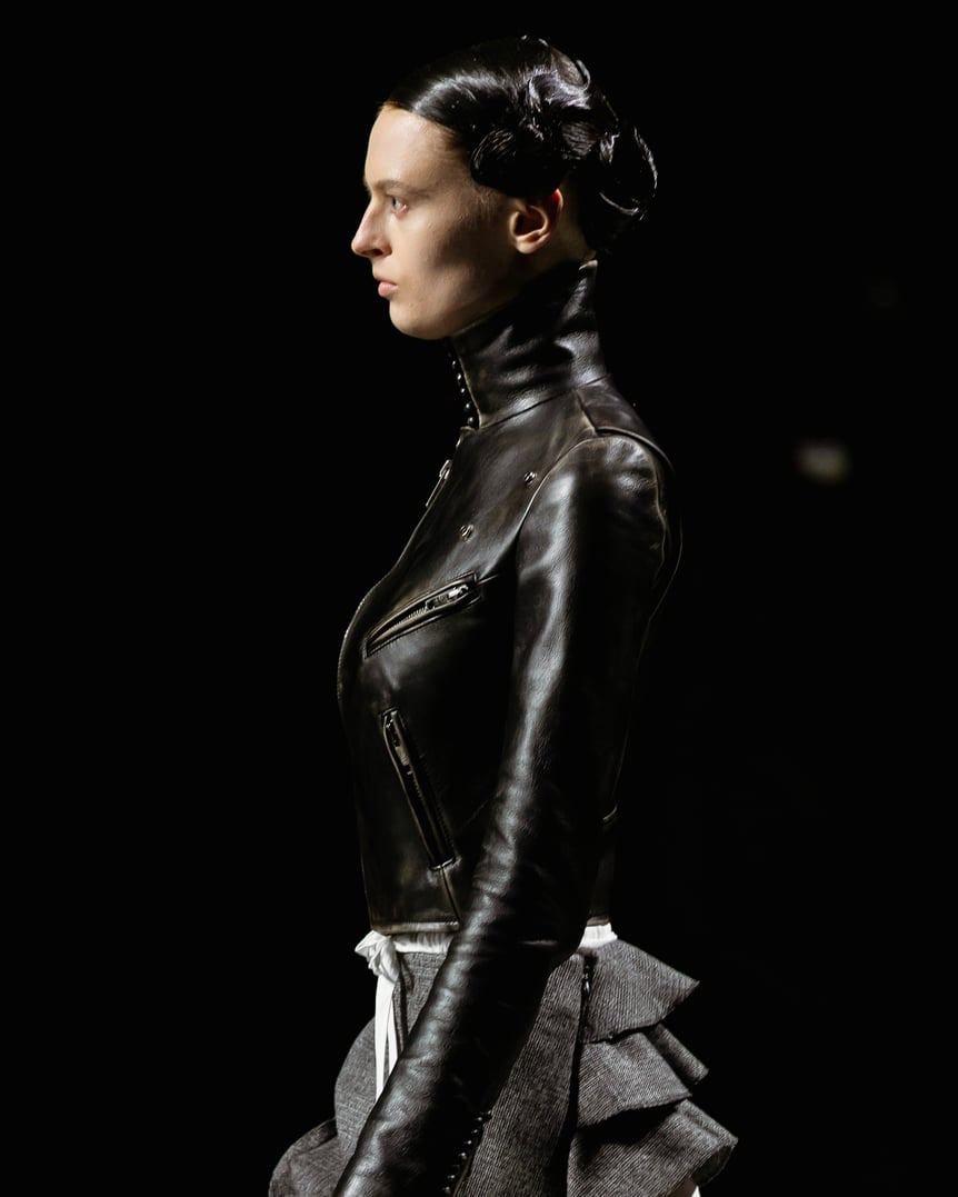 ? コレクションでは「過去を理性的に考察するのではなく、現代にも通じる美の理想に対して心がどう揺れ動くのかを探求する」という観点のもと、ヴィクトリア朝、1920年代、1950年代と時空を超えた様々な年代の要素をレファレンスしつつ、?これまでとは異なる新しい視点を提案。男性的なタフな素材を繊細で女性的なシルエットに変容させたり、メンズウェアの象徴的なバイカージャケットは胸の膨らみがわかるほど体に沿って作られていたり、逆にリボンやラッフルといった女性らしさを表現するディテールは、"可憐さ"という概念を排除した装飾として存在しているかのよう。