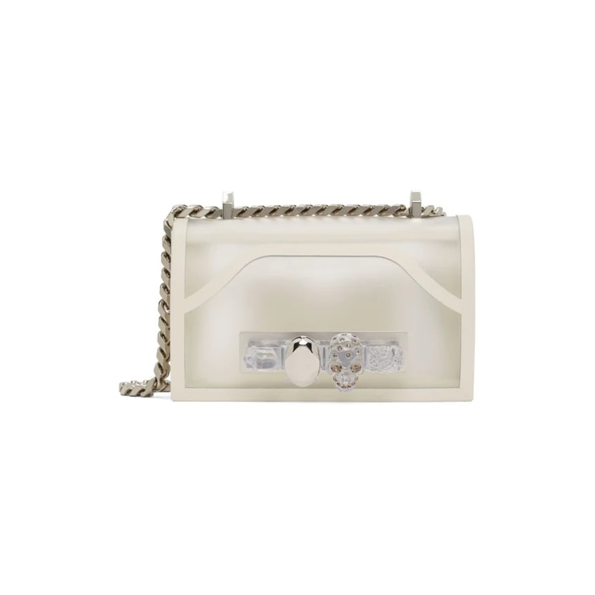 ホワイトカラーのPVC素材にレザーのパイピングを施した「アレキサンダー マックイーン(Alexander McQueen)」のミニジュエルドサッチェル。リングハンドルを使ってクラッチのように持ったり、ストラップを二重にしたりと、様々な持ち方が楽しめます。