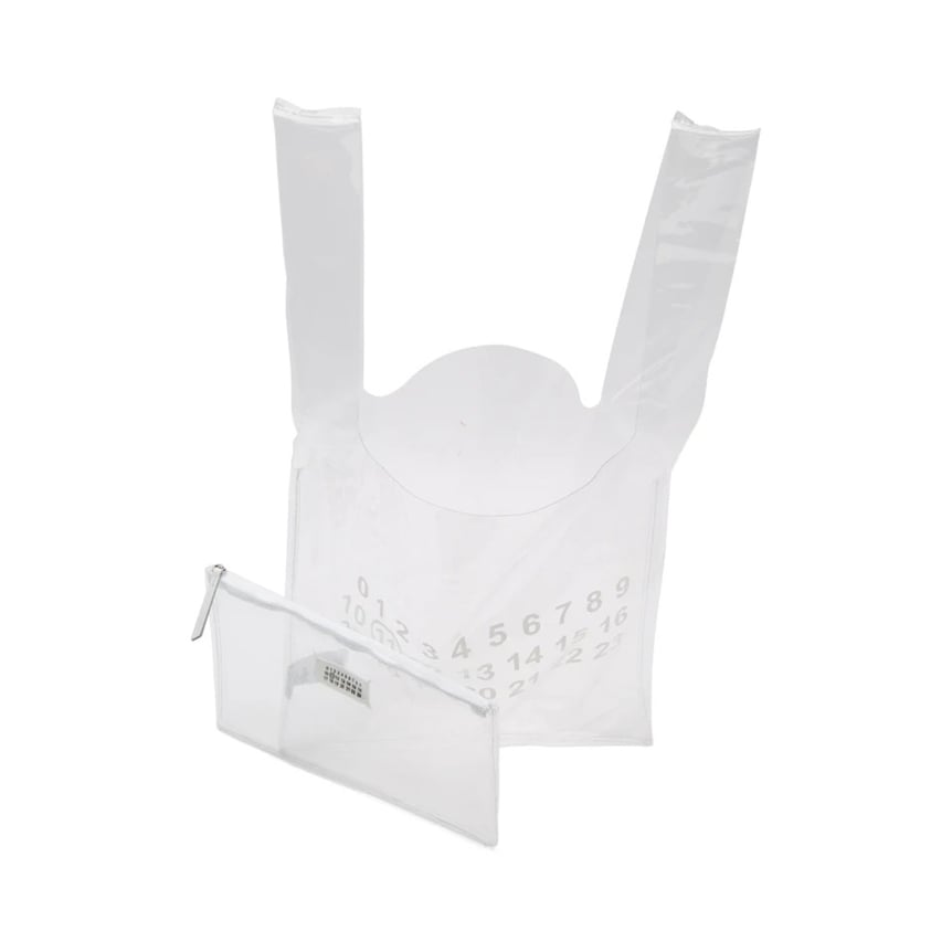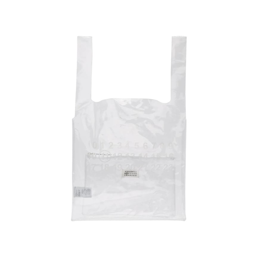 インナーポーチが付いた、「メゾン マルジェラ(Maison Margiela)」のPVC製ショッパートートバッグは3個セット。シンプルなバッグのフロントにはアイコニックな数字のロゴをプリント、裏面はホワイトのトップステッチを施しています。