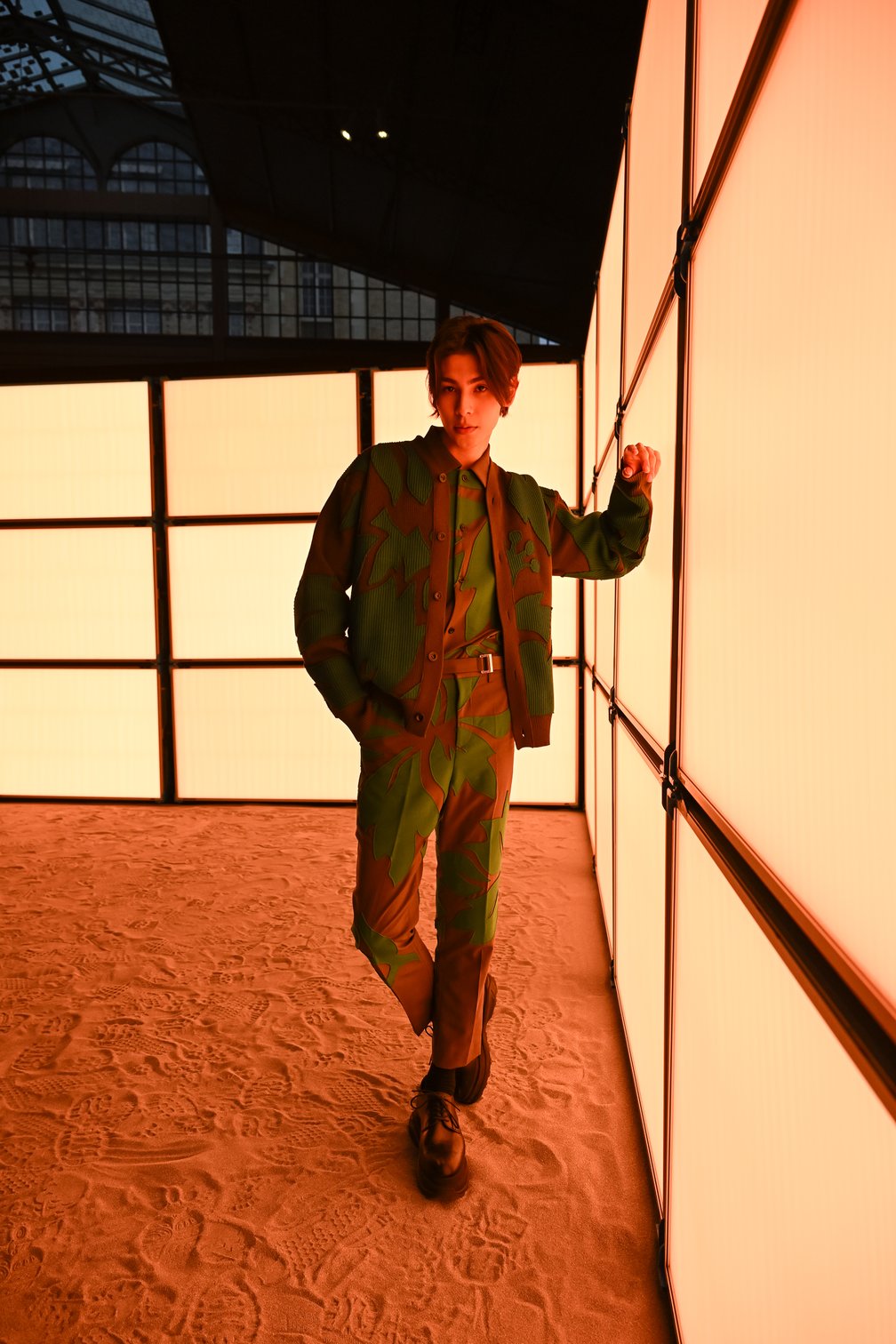ラウールさんにとってパリでのラストショーは「サカイ(sacai)」。ボタニカルモチーフをパッチワークしたトープ×グリーンのスタイリングで姿を表しました。風になびくナチュラルなヘアスタイルが爽やかな印象です。