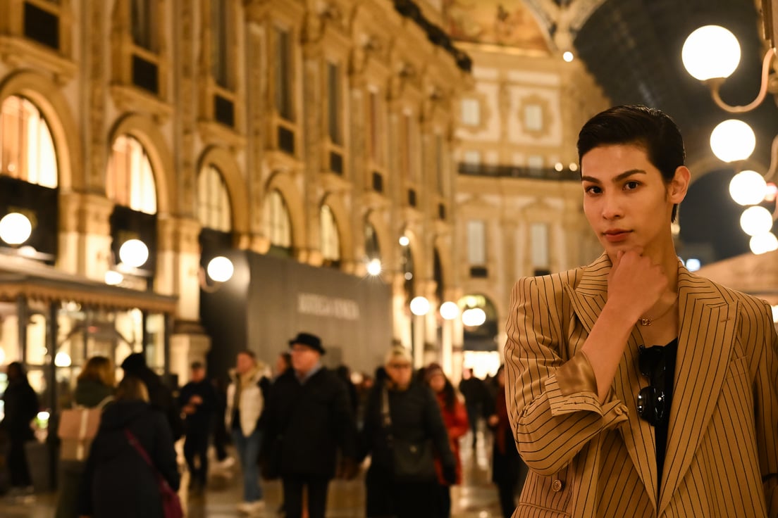 「シックな雰囲気の街ですね」。見るもの全てが新鮮な、初めてのイタリア?ミラノ。「ドルチェ&ガッバーナ(Dolce&Gabbana)」のショーに出席したラウールさんは同日、暖かい光に包まれた夜の街に繰り出しました。ピンストライプのシングルブレストスーツに、首元にはDGロゴをあしらった細身のチェーンネックレスが光ります。