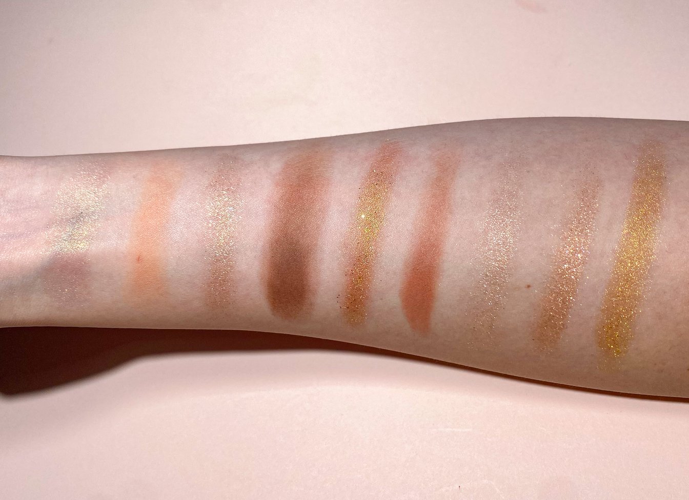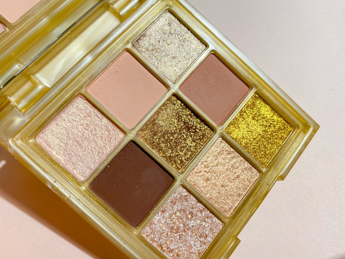 パレットの構成は、ラメ6色、マット3色。結論から言うと使いやすい色が揃っています!マットの3色は粉が細かくブレンディングしやすいので、ベースカラーや程よいグラデーションを作るのにぴったり。そしてキーカラーのゴールド(パレット真ん中と右下)は高発色で、他のカラーと重ねるときは薄く塗布すればゴールドのラメ感を楽しめて、しっかり塗ると黄金色の地色がはっきり出るのでアイラインとしても使えます。ここまでゴールドの色が際立つアイシャドウはなかなか見つからないかも?ラメが少し粉飛びしやすいのでフィックススプレーが必須です。
