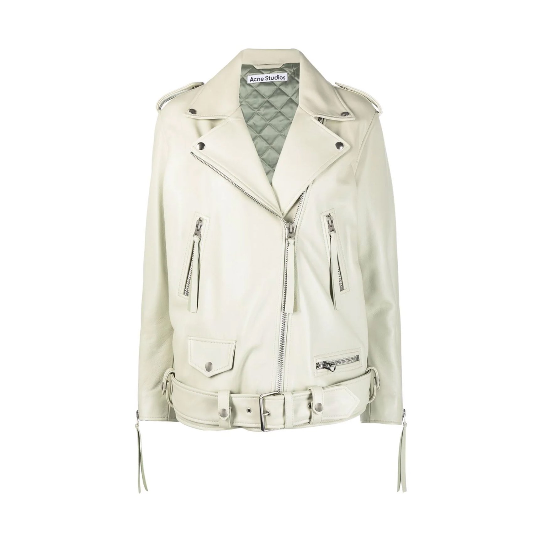 表地はラムスキン100%使用、シルクのような手触りと高級感あるジャケットは「アクネ?ストゥディオズ(Acne Studios)」のもの。シルバートーンのスタッズと、彩度低めのホワイトカラーが相性抜群。ゆったり目に着用できるサイズ感で、"かっこかわいい"印象を引き出します。