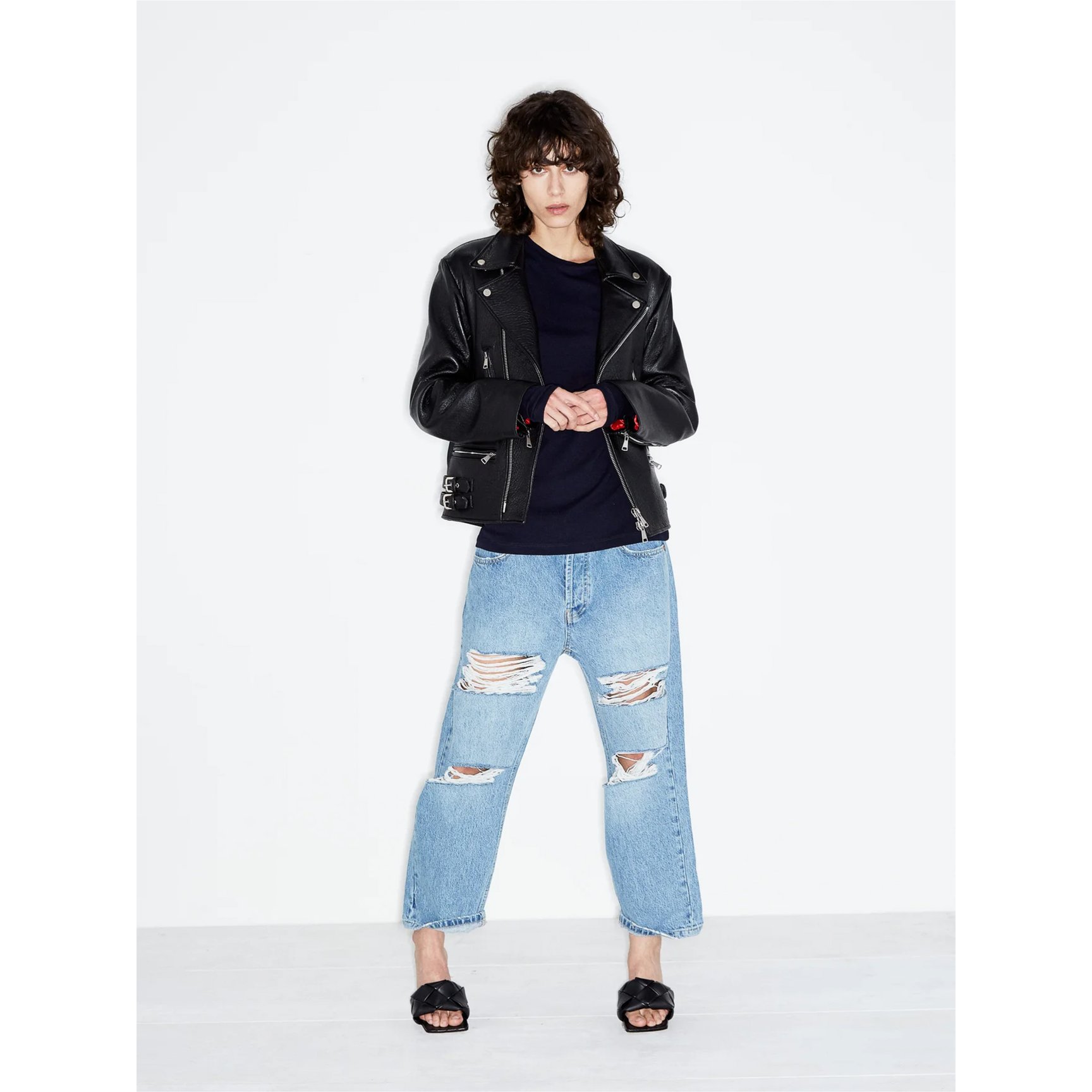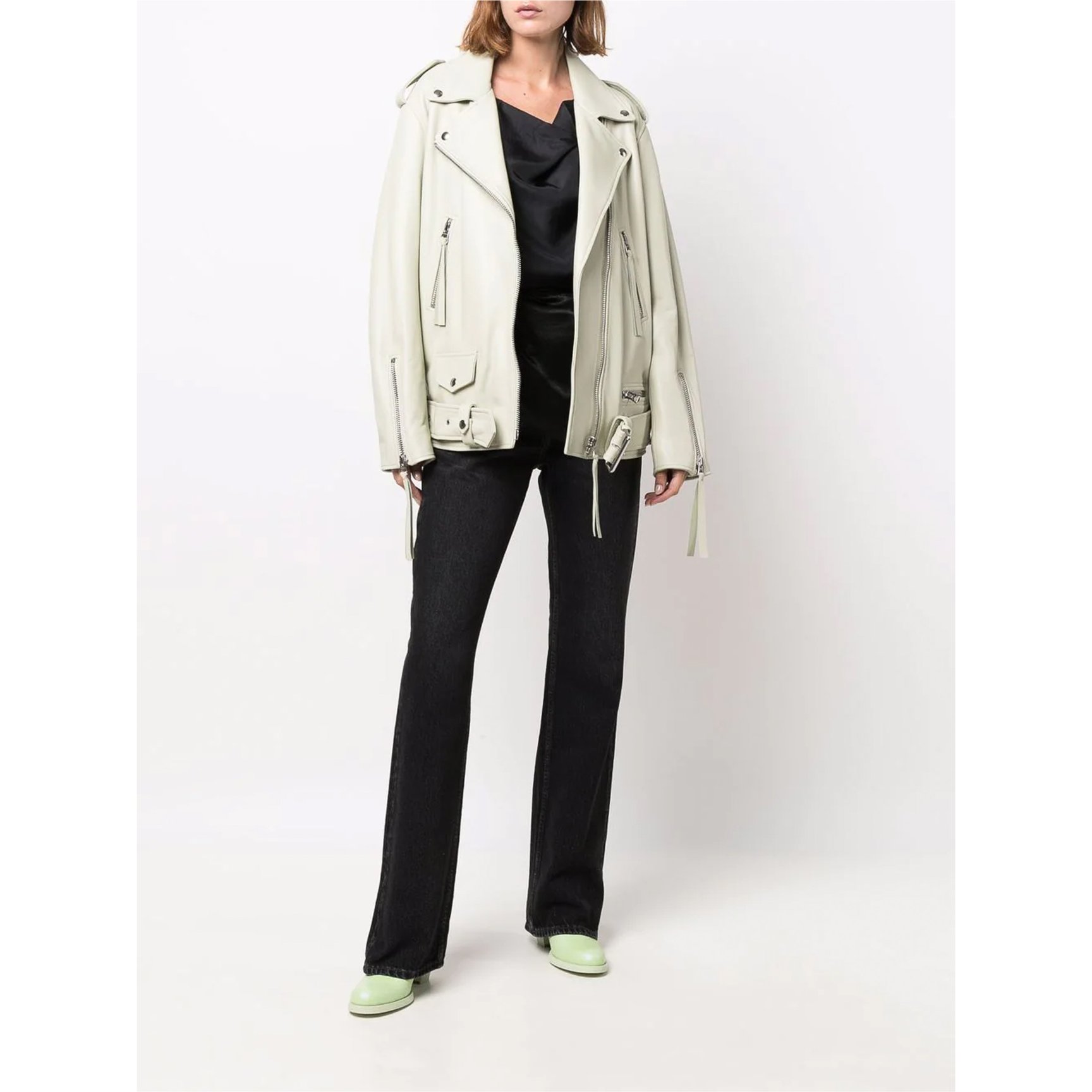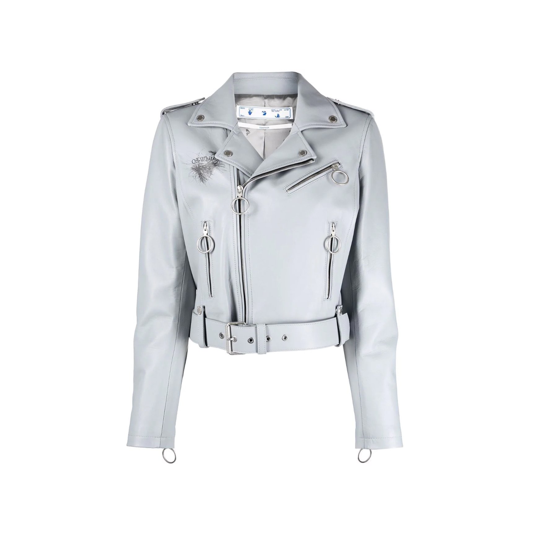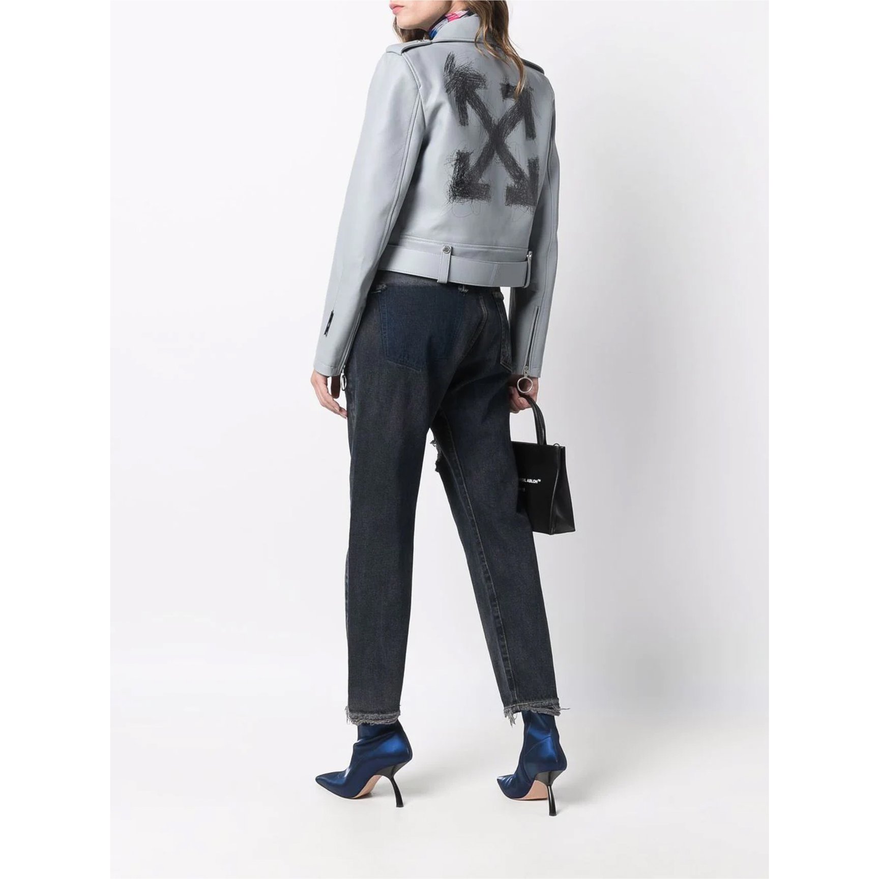 「オフ?ホワイト(Off-White)」のライダースジャケットは、背面にロゴが入ったレザー100%素材。水色に近い絶妙なグレーカラーが、一般的なライダースジャケットと差をつけます。丈がやや短めのクロップドなので、全体のシルエットをスッキリ見せてくれること間違いなし。