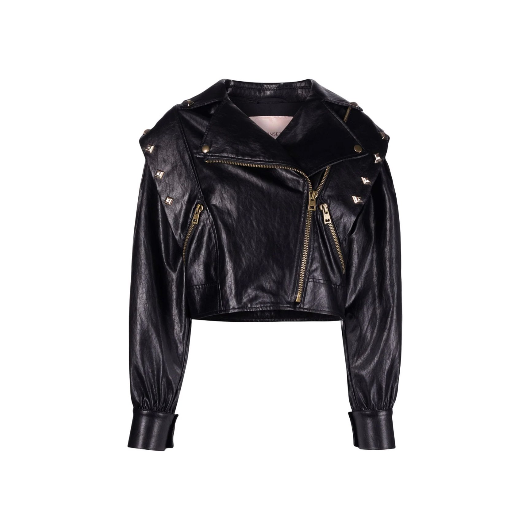 ふわっとしたシルエット、光沢のあるブラックにブロンズトーンのスタッズ付きで個性的な印象を放つのは「ツインセット(TWINSET)」のライダースジャケット。シンプルすぎず、かといって派手すぎないデザインが、コーデへの1点投入にぴったり。女性らしさが感じられる1着です。
