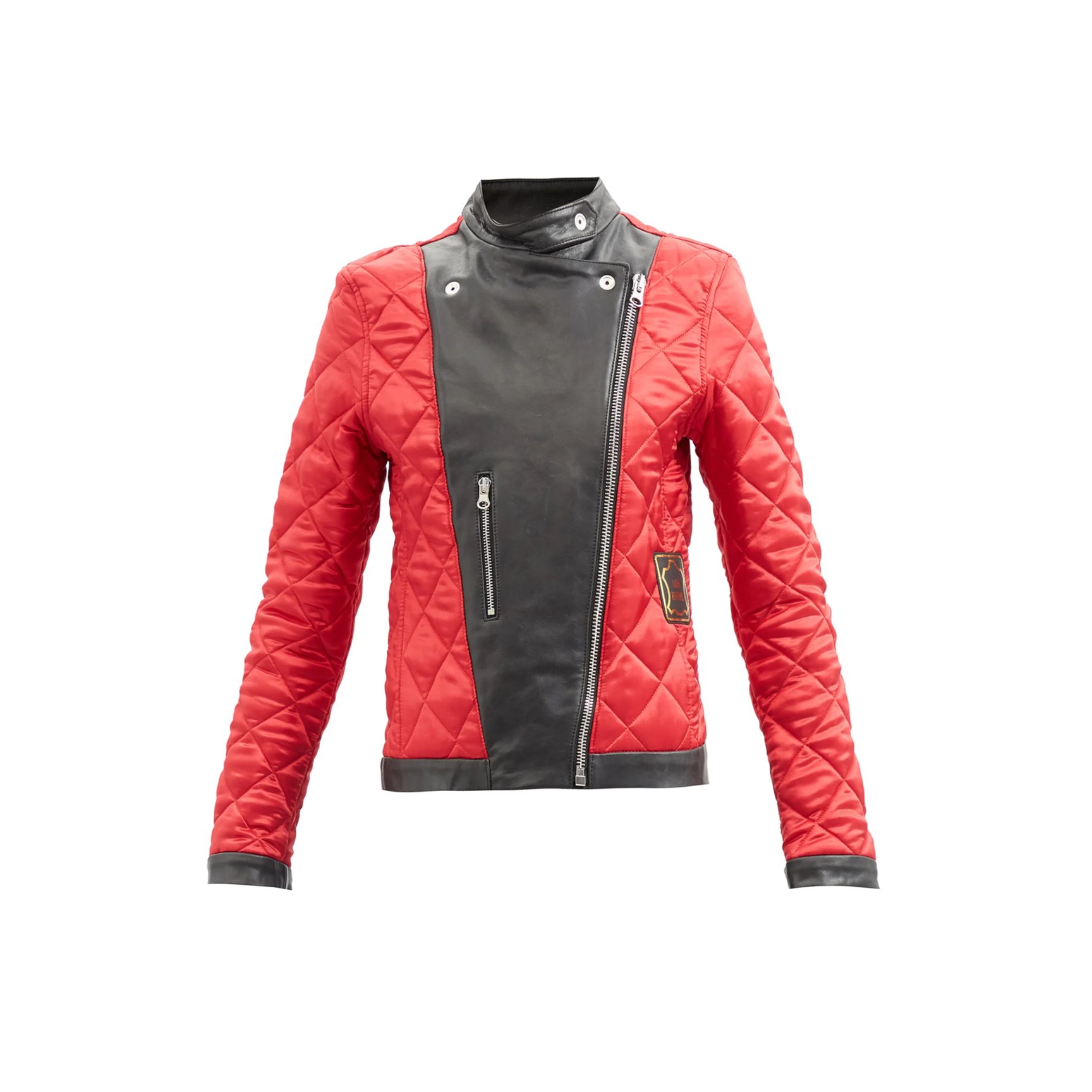 ブラック&レッドの個性的なライダースジャケットは、「エムエムシックス?メゾンマルジェラ(MM6 MAISON MARGIELA)」のもの。左右はキルティングサテンを使用、レザーロゴパッチをあしらった、ブランドのバイカースタイルを表現した1着です。ライダースながらも、キルティング部分が多い点がワンポイント。