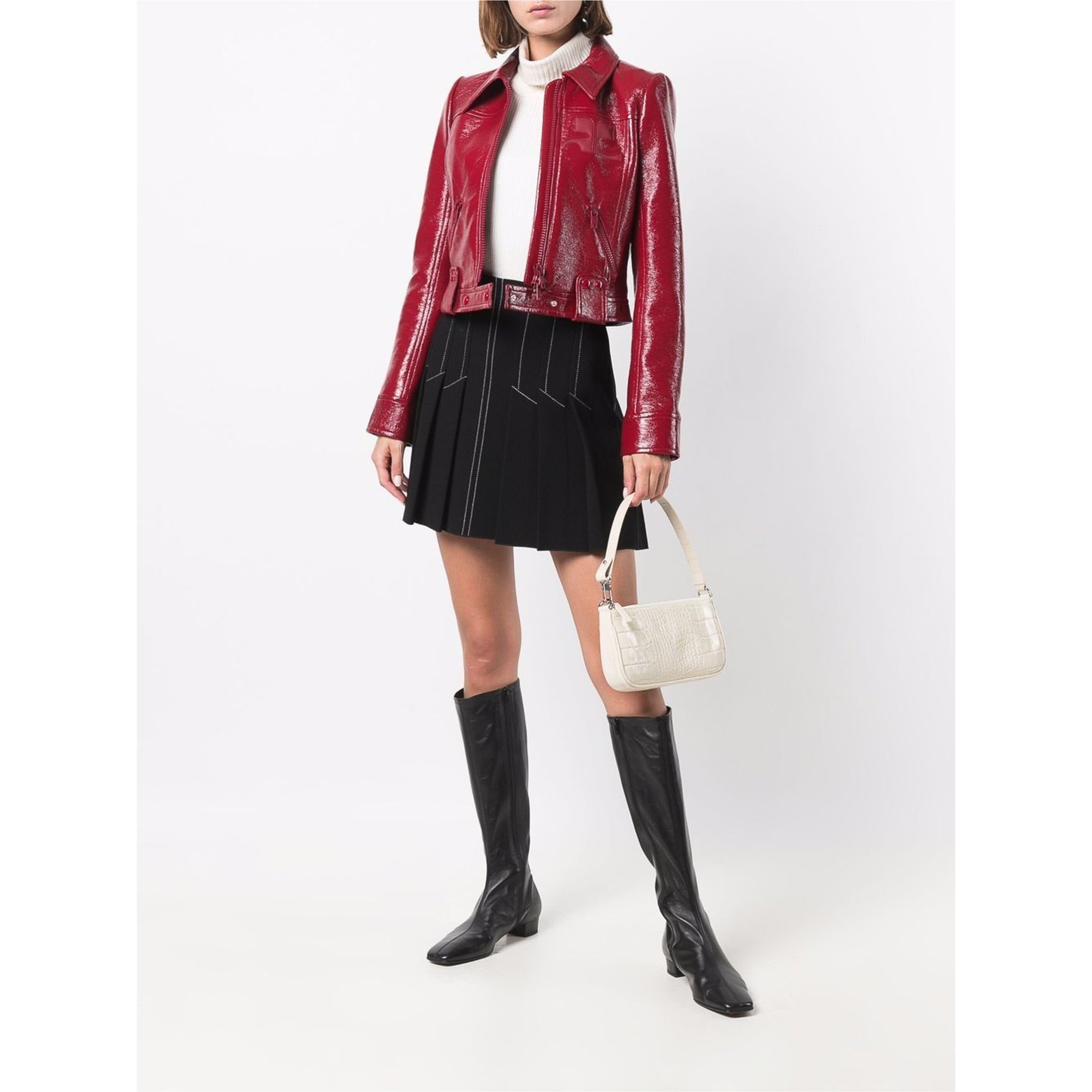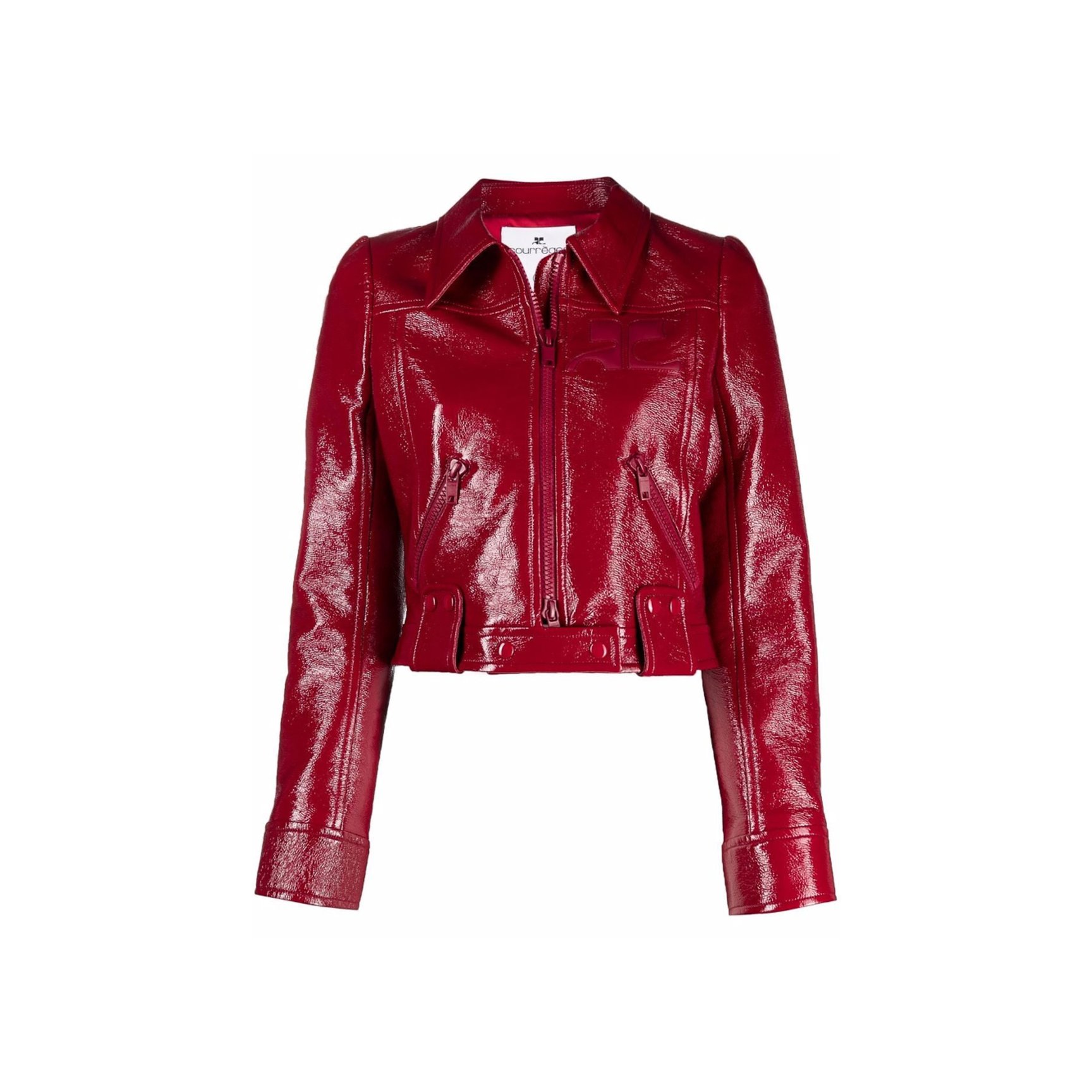 光沢のあるレッドカラーが特徴のライダースジャケットは「クレージュ(Courrèges)」のもの。クロップドの小さめの作りで、女性のボディラインに合わせて作られた1着です。フレンチシックなスタイルにピッタリ。