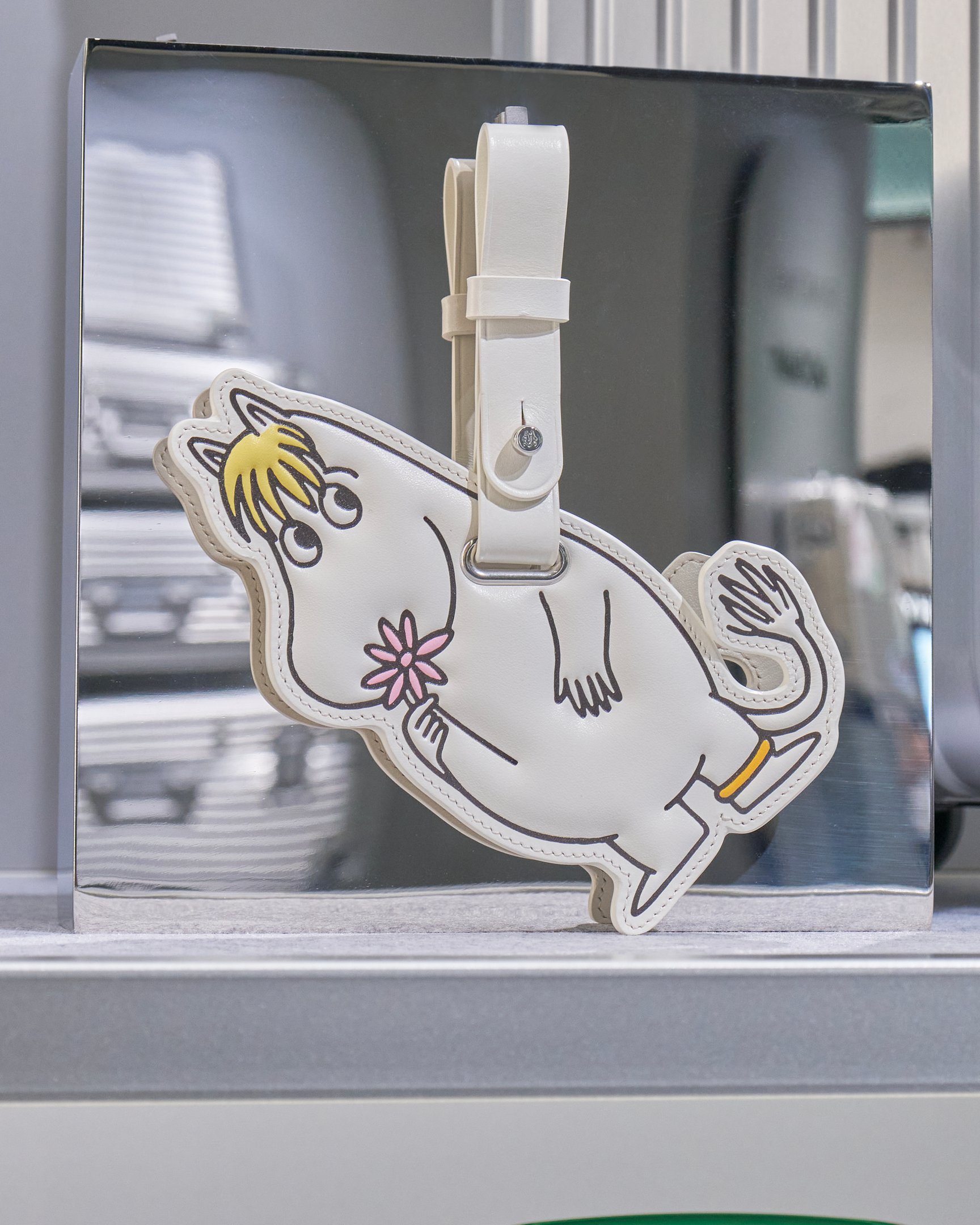 さらに、オリジナルコレクションとともに旅をするパートナーとして「ムーミン」との限定カプセルコレクションが、世界に先駆け登場。実店舗でこのカプセルコレクションを扱うのは、世界中でこのポップアップだけ。パッキング中のムーミンや、スノークのおじょうさんをあしらったレザータグ(各3万7510円)、スーツケースをカスタマイズするのに最適なジャイアントステッカーセット(4万2900円)、ステッカーセット3種(各6600円)といった魅力的なラインナップが揃う。店内には、ムーミンたちがスーツケースと戯れながら回転するセットも設置されており、中島健人も「かわいい!」と思わず笑顔に。絵本「ムーミン谷へのふしぎな旅(1977年)」からインスピレーションを得た、特別仕様のショッパーにも注目だ。