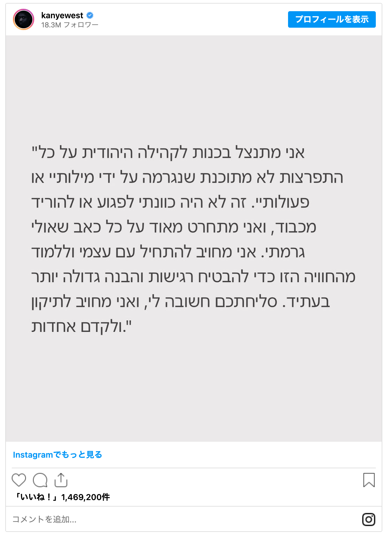 - Ye(カニエ?ウェスト)が自身のSNSを更新し、これまでの反ユダヤ的な言動に関して謝罪文を投稿した。