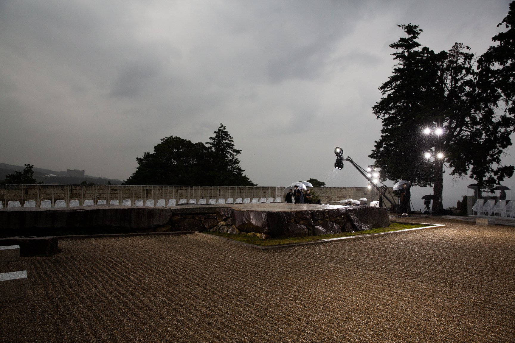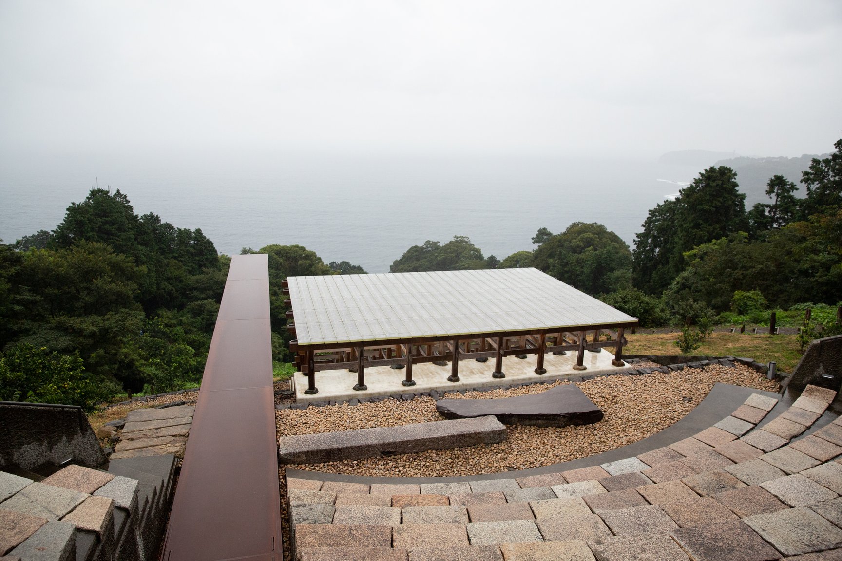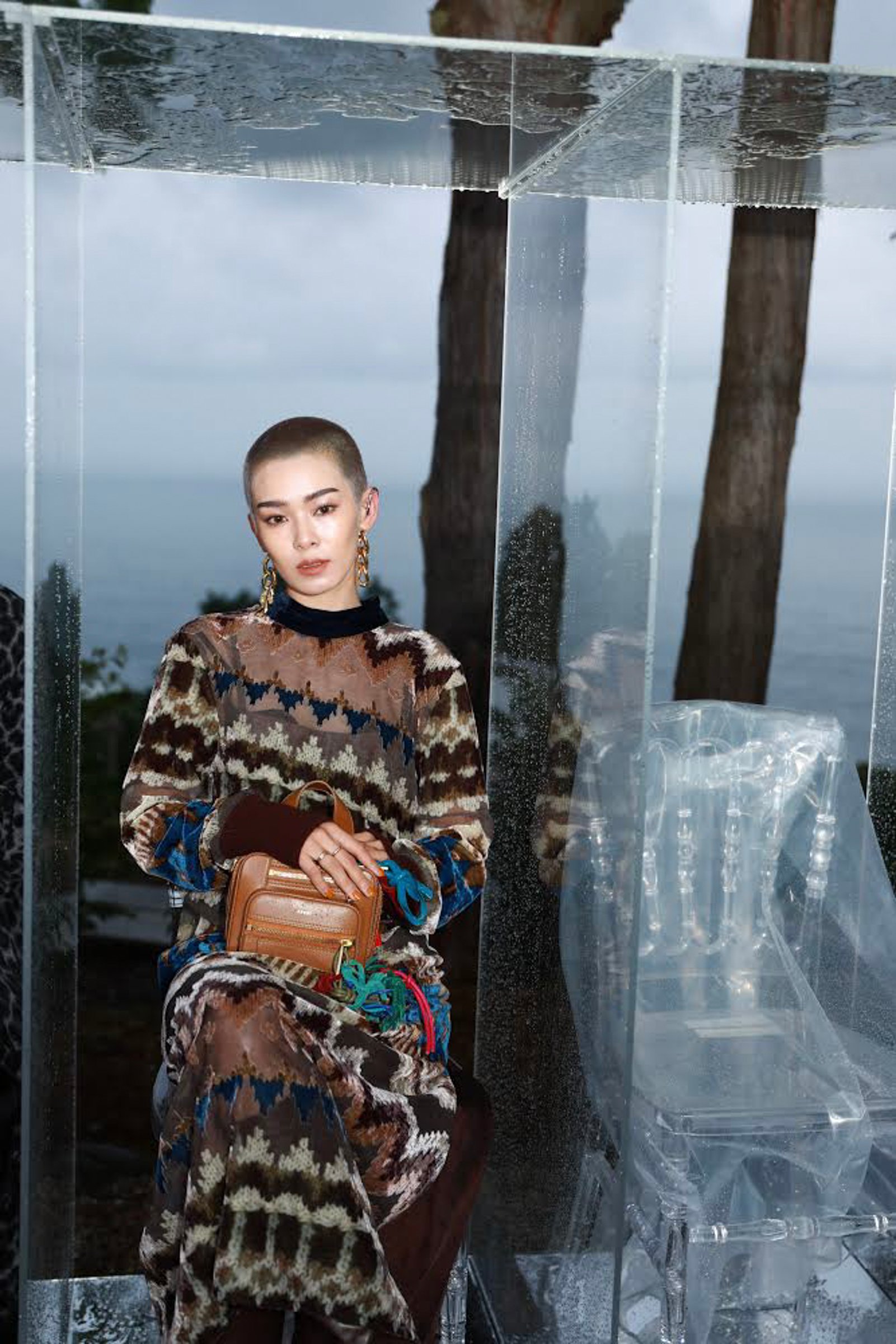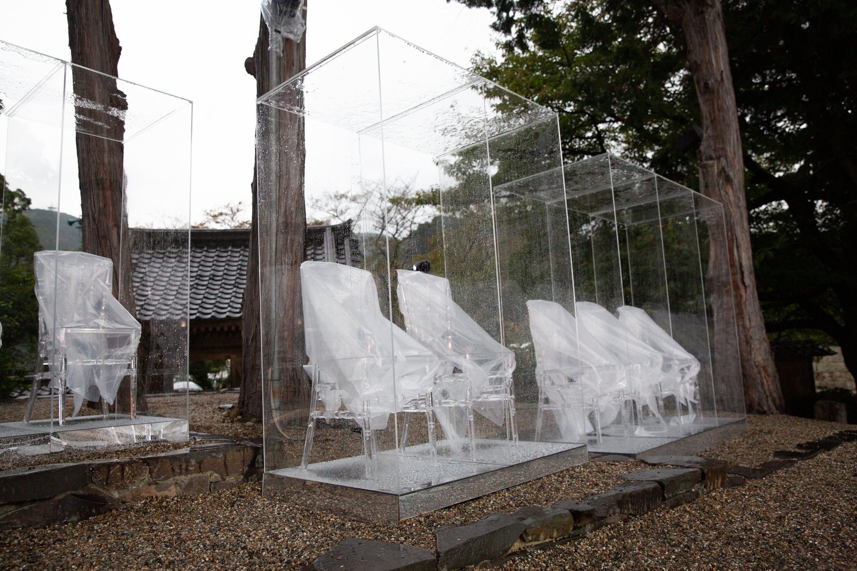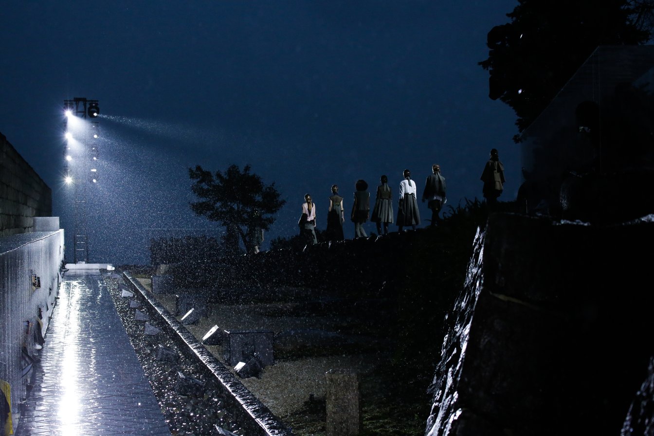 都内から車でおよそ1時間半。小田原の海辺に位置する江之浦測候所は、現代美術作家の杉本博司が20年を費やして完成させたという壮大なランドスケープである。木々が生茂る坂道を抜け、石畳を歩くと光学硝子舞台があり、相模湾を臨む絶景が広がっている。ショー当日は雨模様だったが、200人あまりの招待客はアクリル板で仕切られたボックスに収まり、雨粒を背景にショーを観覧した。