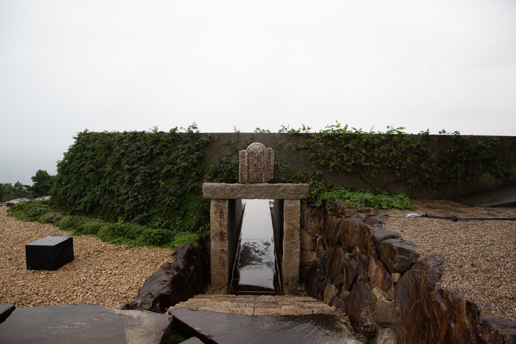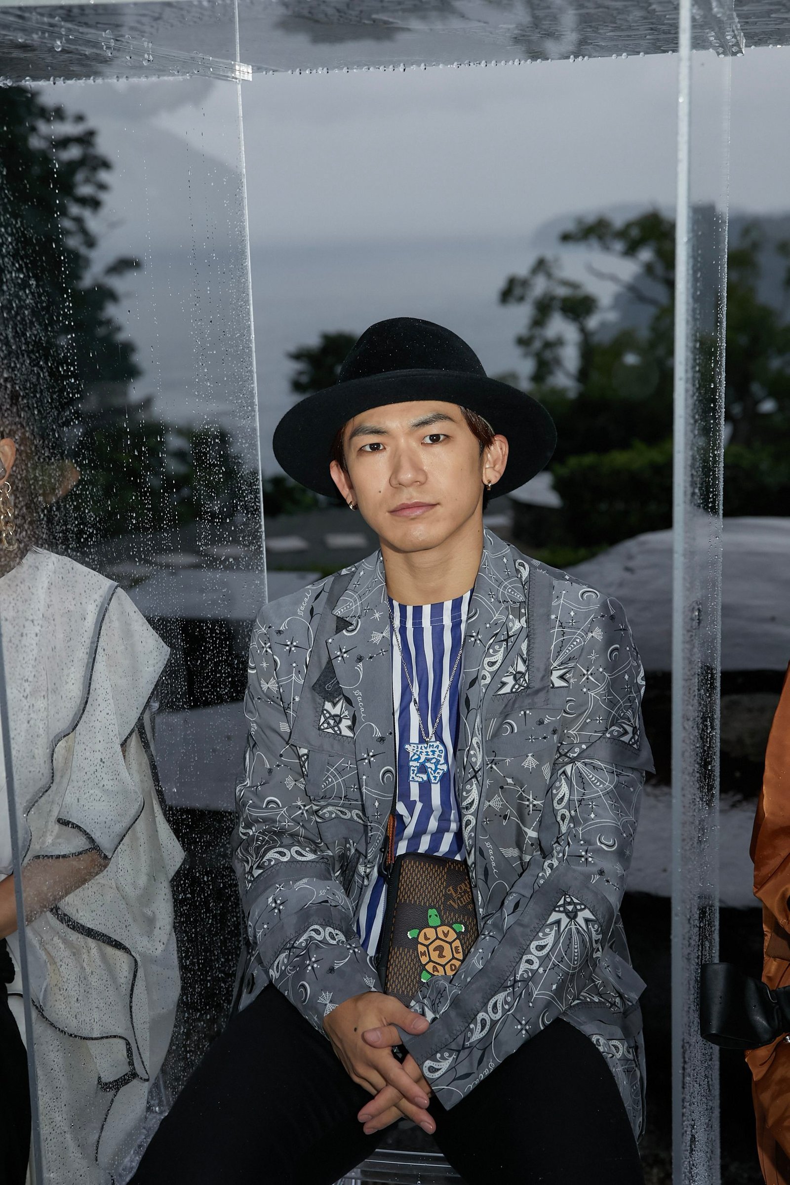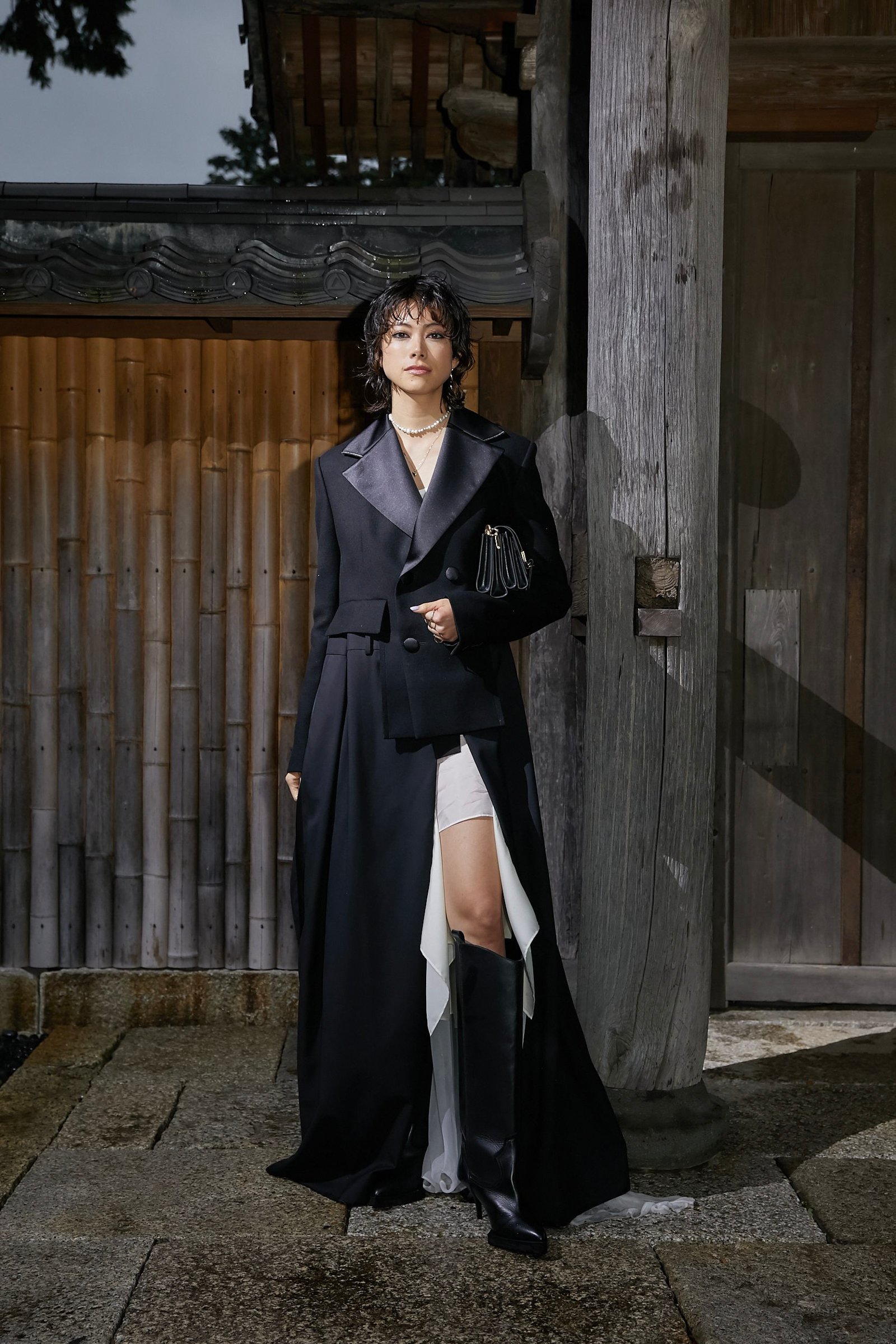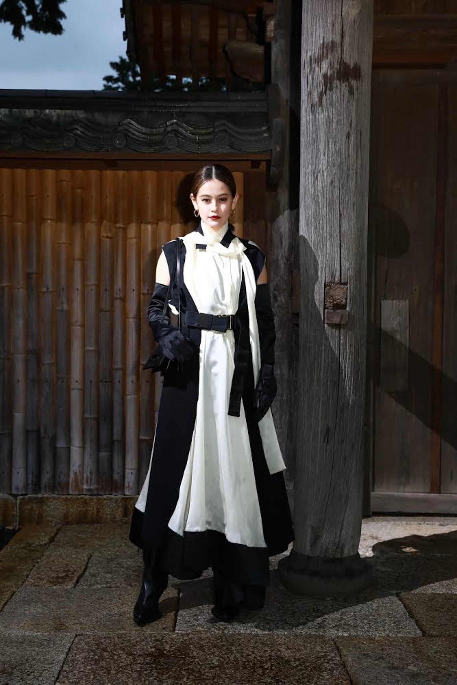都内から車でおよそ1時間半。小田原の海辺に位置する江之浦測候所は、現代美術作家の杉本博司が20年を費やして完成させたという壮大なランドスケープである。木々が生茂る坂道を抜け、石畳を歩くと光学硝子舞台があり、相模湾を臨む絶景が広がっている。ショー当日は雨模様だったが、200人あまりの招待客はアクリル板で仕切られたボックスに収まり、雨粒を背景にショーを観覧した。