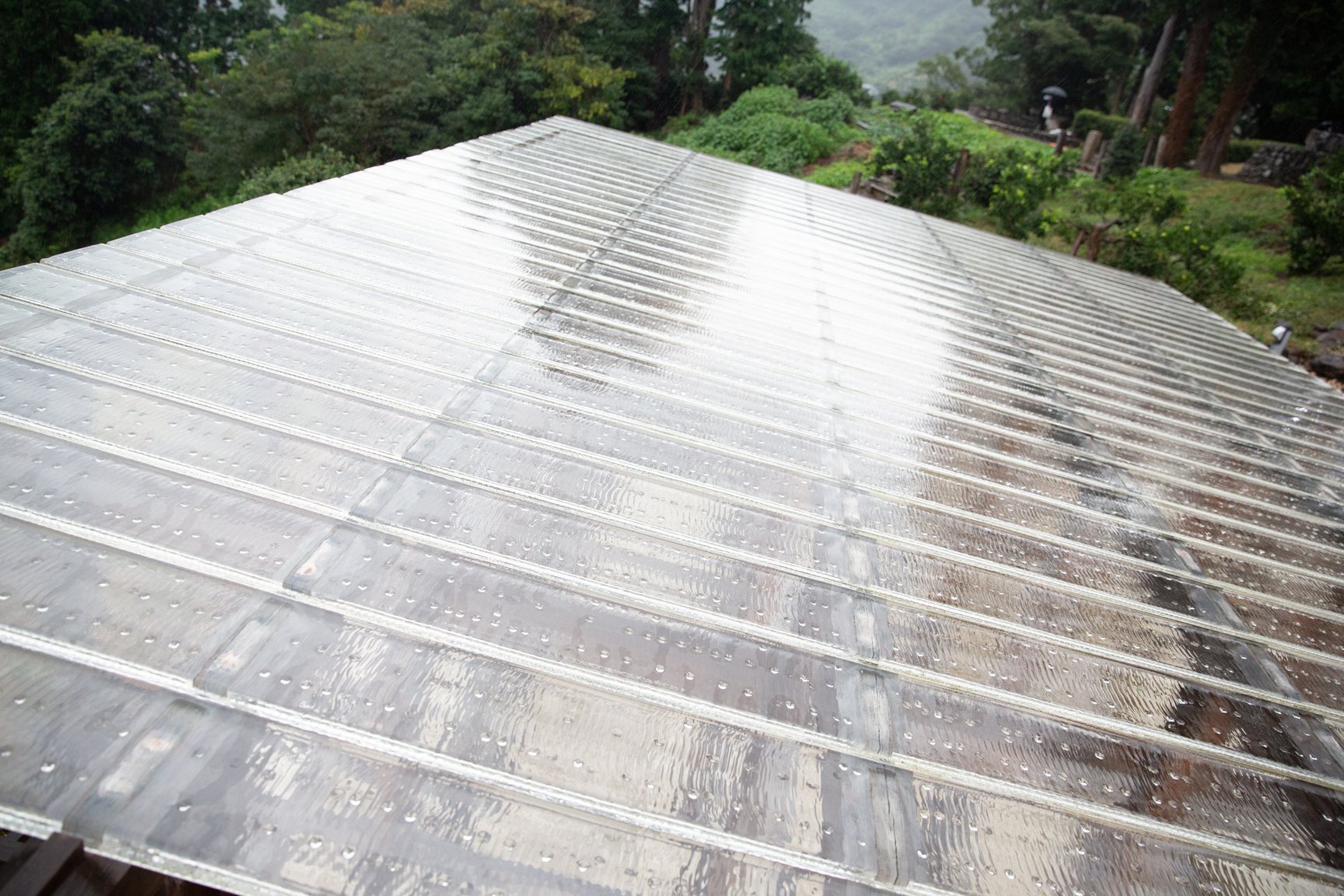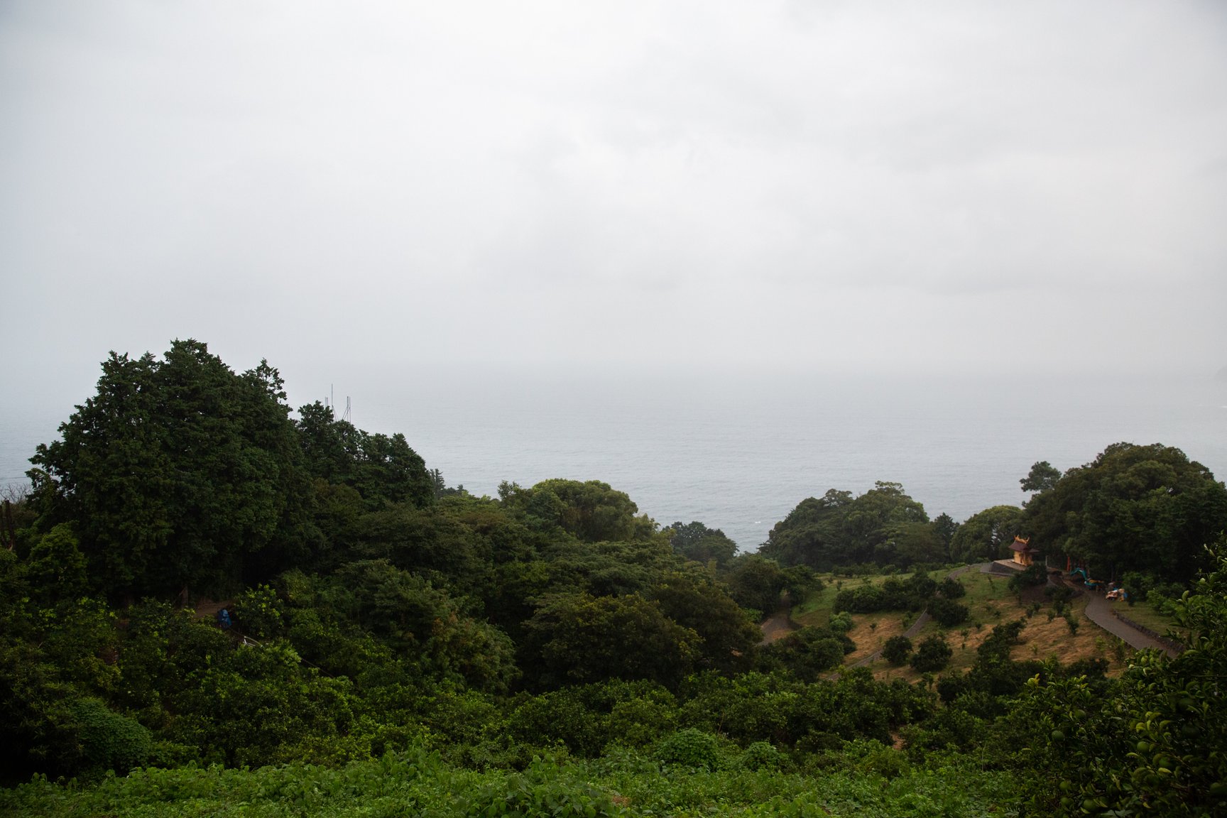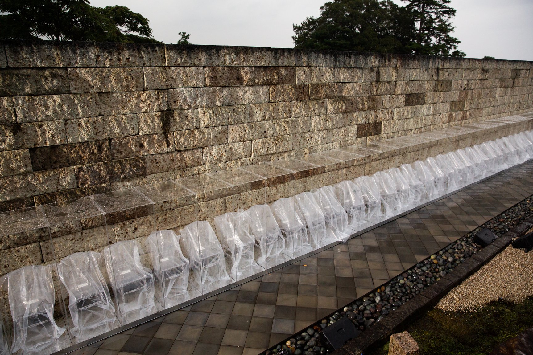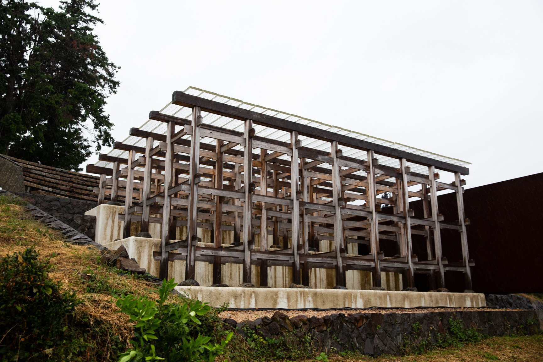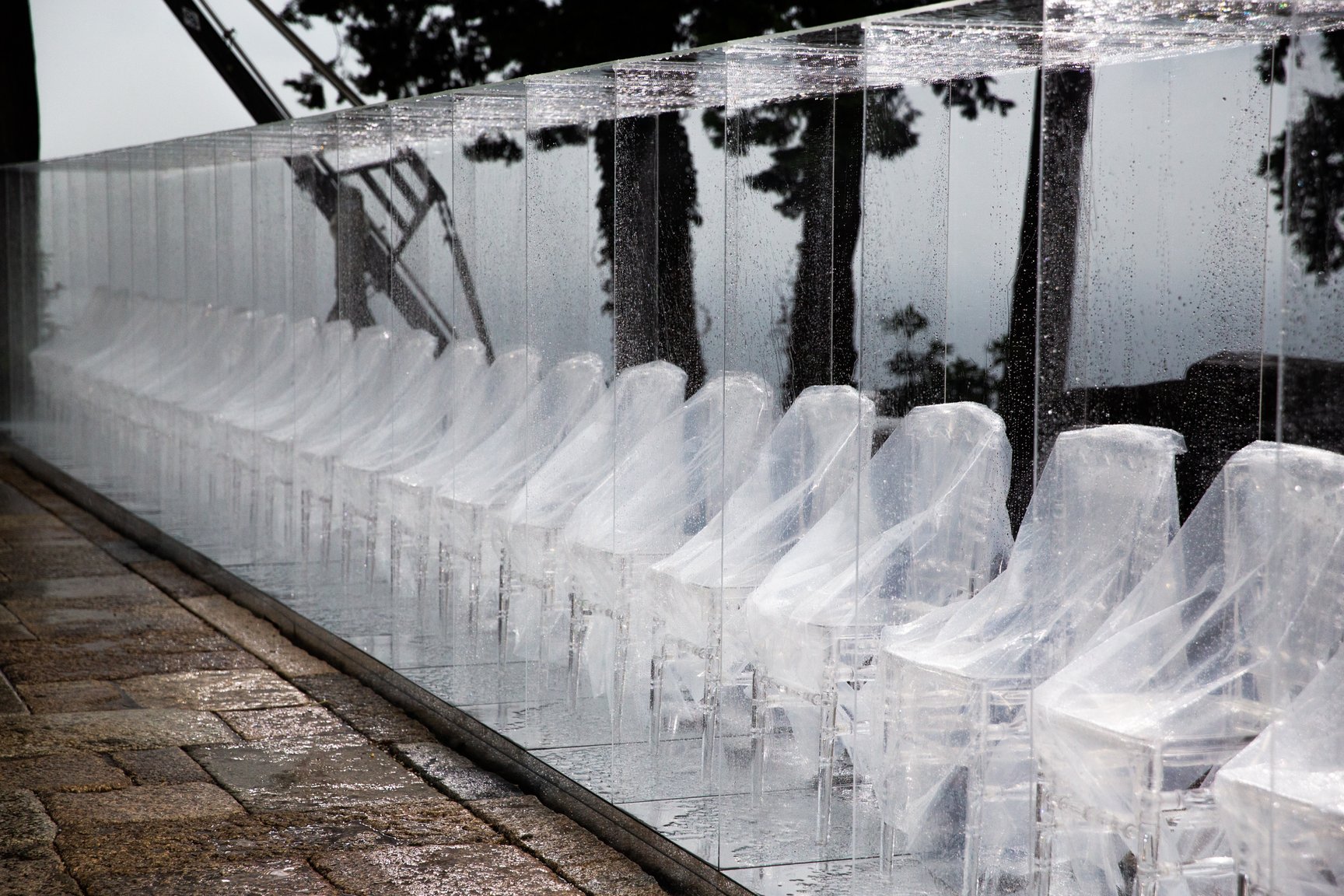 都内から車でおよそ1時間半。小田原の海辺に位置する江之浦測候所は、現代美術作家の杉本博司が20年を費やして完成させたという壮大なランドスケープである。木々が生茂る坂道を抜け、石畳を歩くと光学硝子舞台があり、相模湾を臨む絶景が広がっている。ショー当日は雨模様だったが、200人あまりの招待客はアクリル板で仕切られたボックスに収まり、雨粒を背景にショーを観覧した。