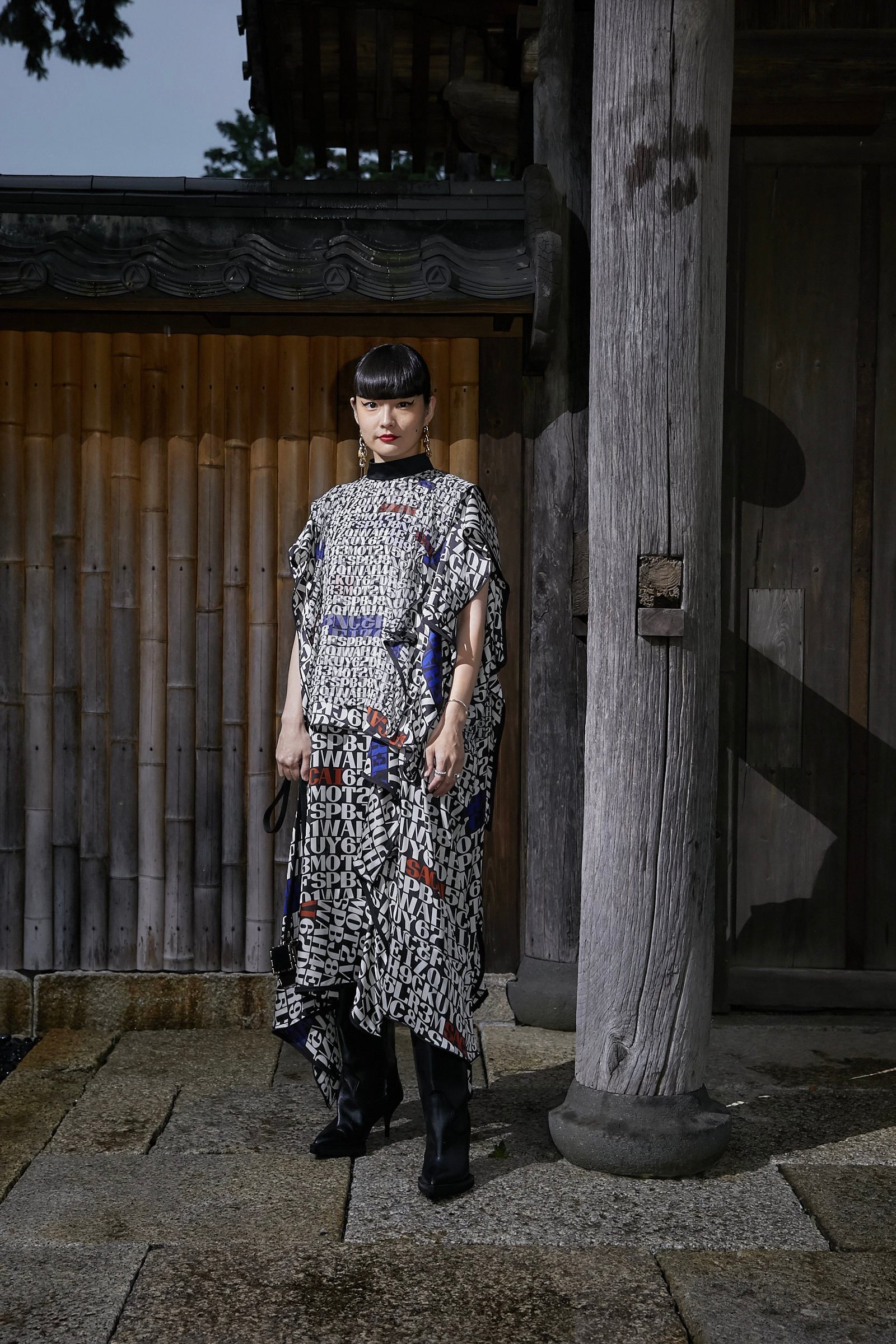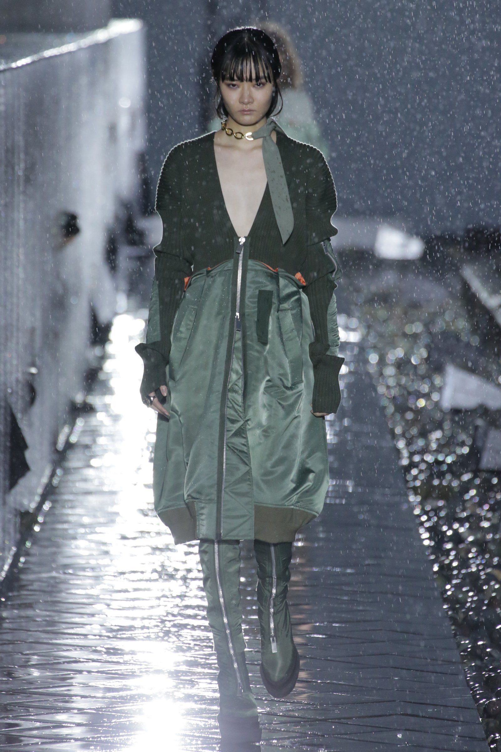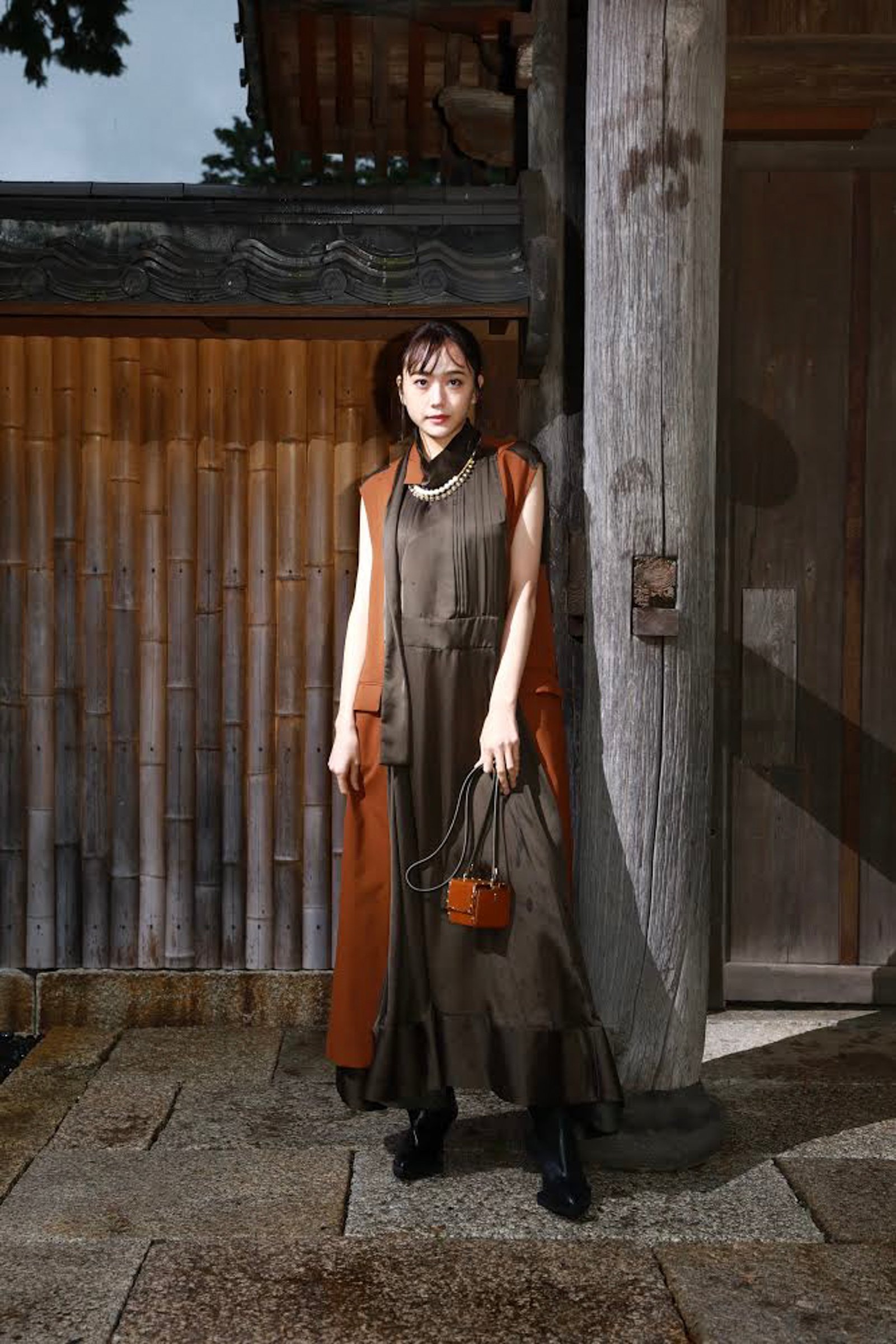 音楽と共に登場したモデルは、石に囲まれた庭園や高低差のある回廊を練り歩く。序盤はクラシカルなブラック&ホワイト。オリーブやカーキ、グレーといったベーシックカラーに、鮮やかなレッドとピンク、そしてシルバーが混じる。前回の2020-21年秋冬コレクションで打ち出した、立体的で動きによって変化するシルエットが引き継がれながらも、プレーンでウェアラブルに落とし込んでいる印象だ。ラストルックは、シルクのパジャマとランジェリーを融合したようなドレッシーなリラックススタイル。普遍的なテーラードやミリタリーの要素を複雑に絡み合わせるサカイならではのアプローチはそのままに、よりソフトで女性的なシルエットが目立った。